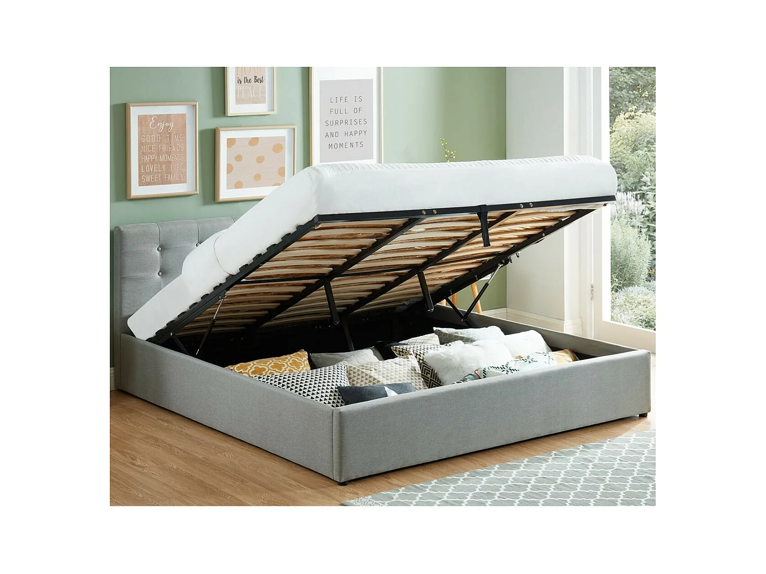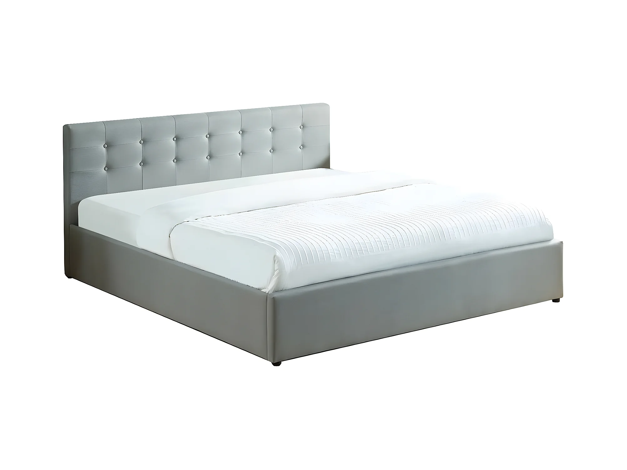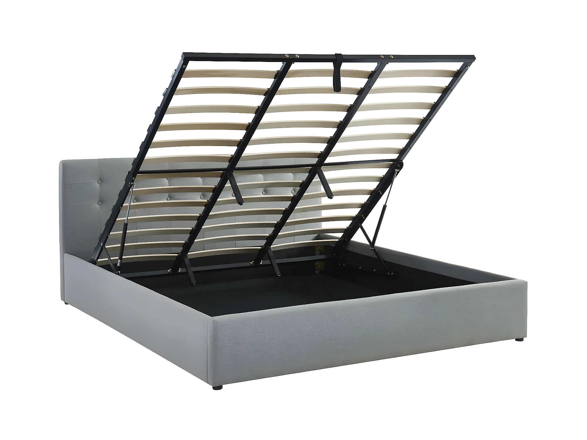 Lit coffre 180x200 en tissu gris clair avec tête de lit et sommier à lattes - Tina