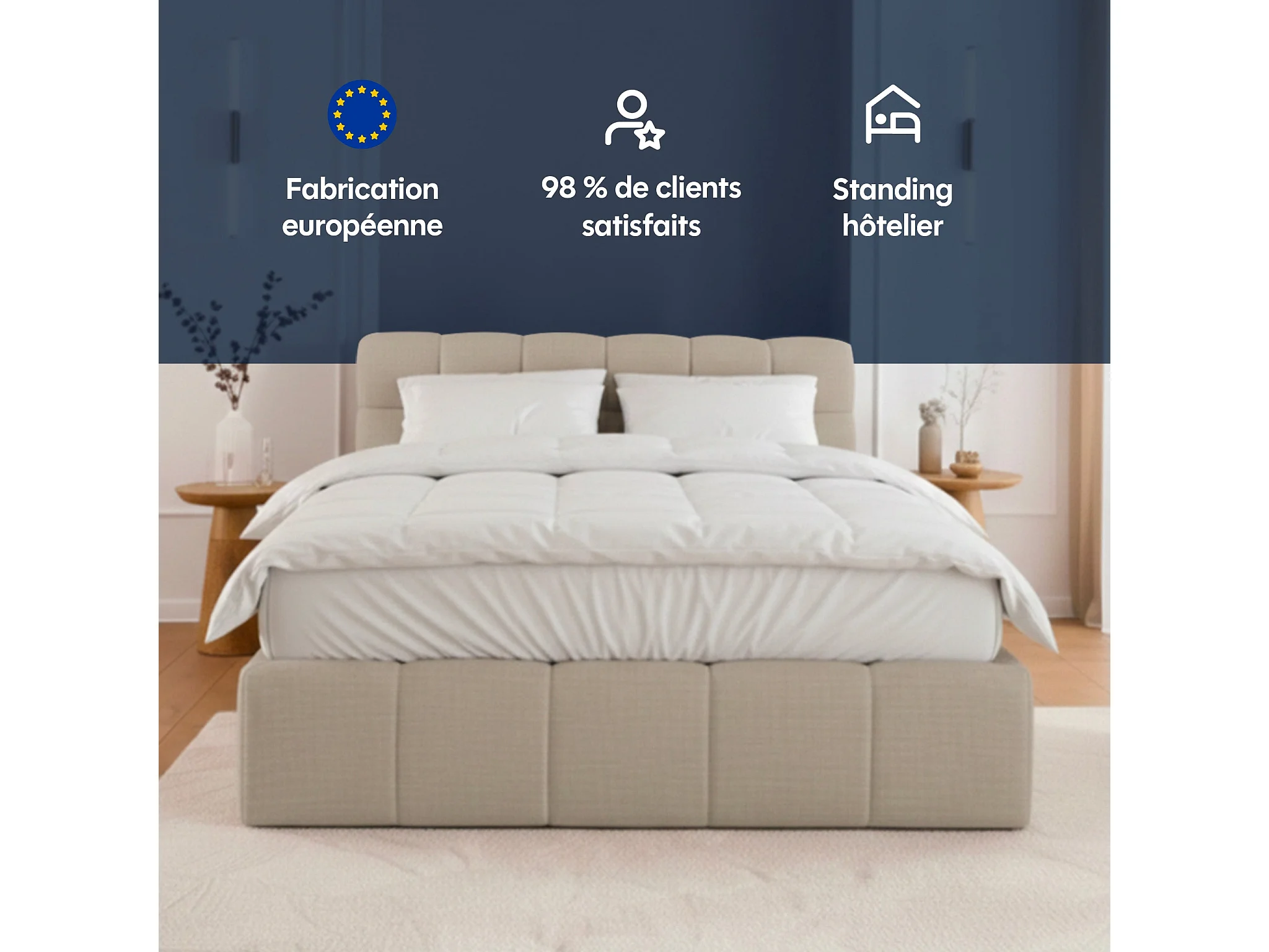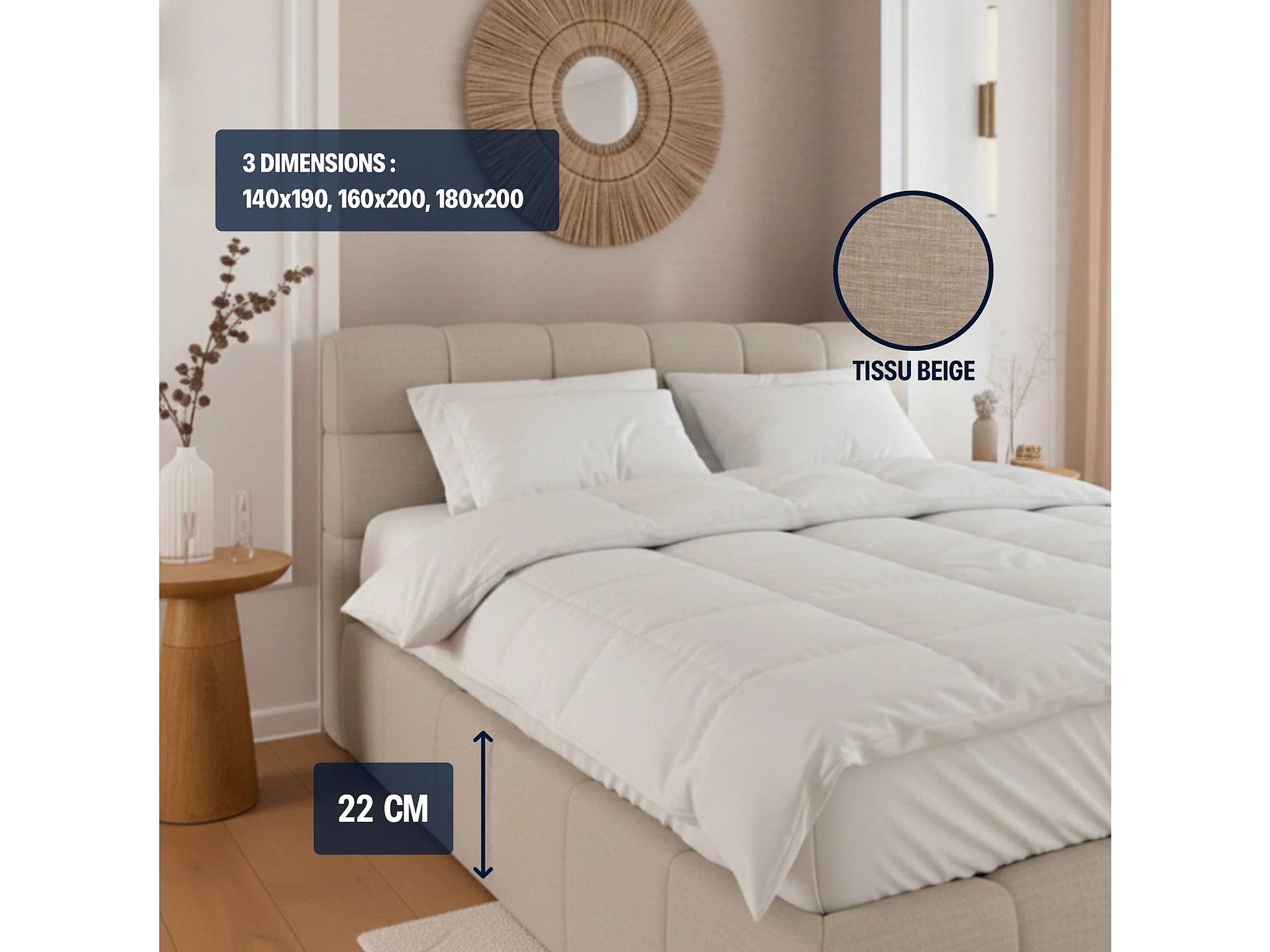 Lit coffre 180x200cm avec Tête - Beige en Tissu Chiné - Elise