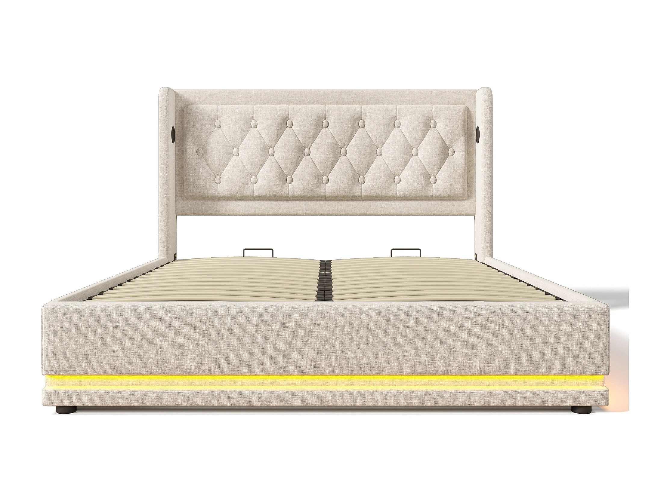 Lit Coffre 210x150x100.5 cm avec LED USB Espace de rangement Matelas Sommier à lattes en bois en beige pour adultes et enfants et adolescents