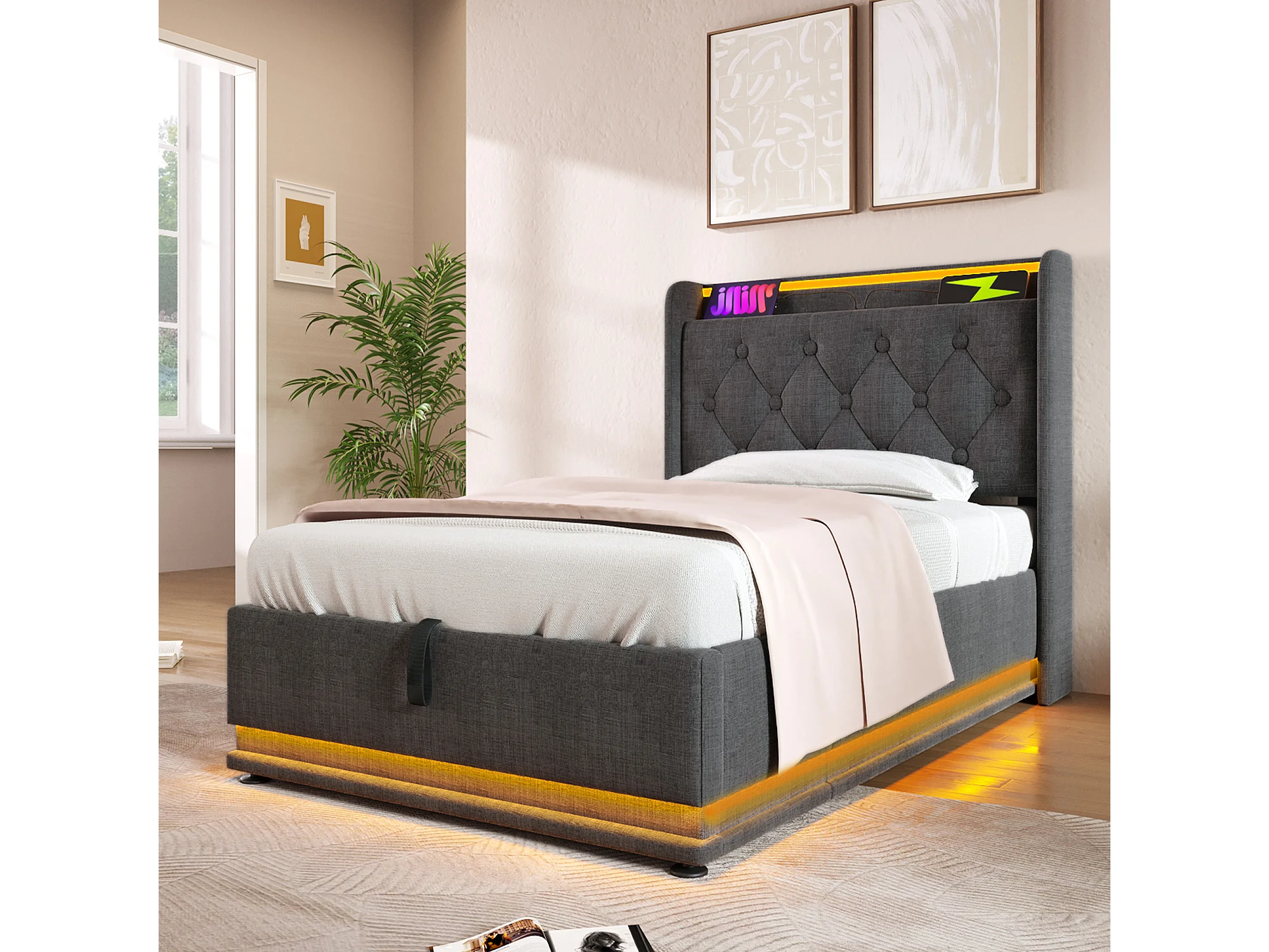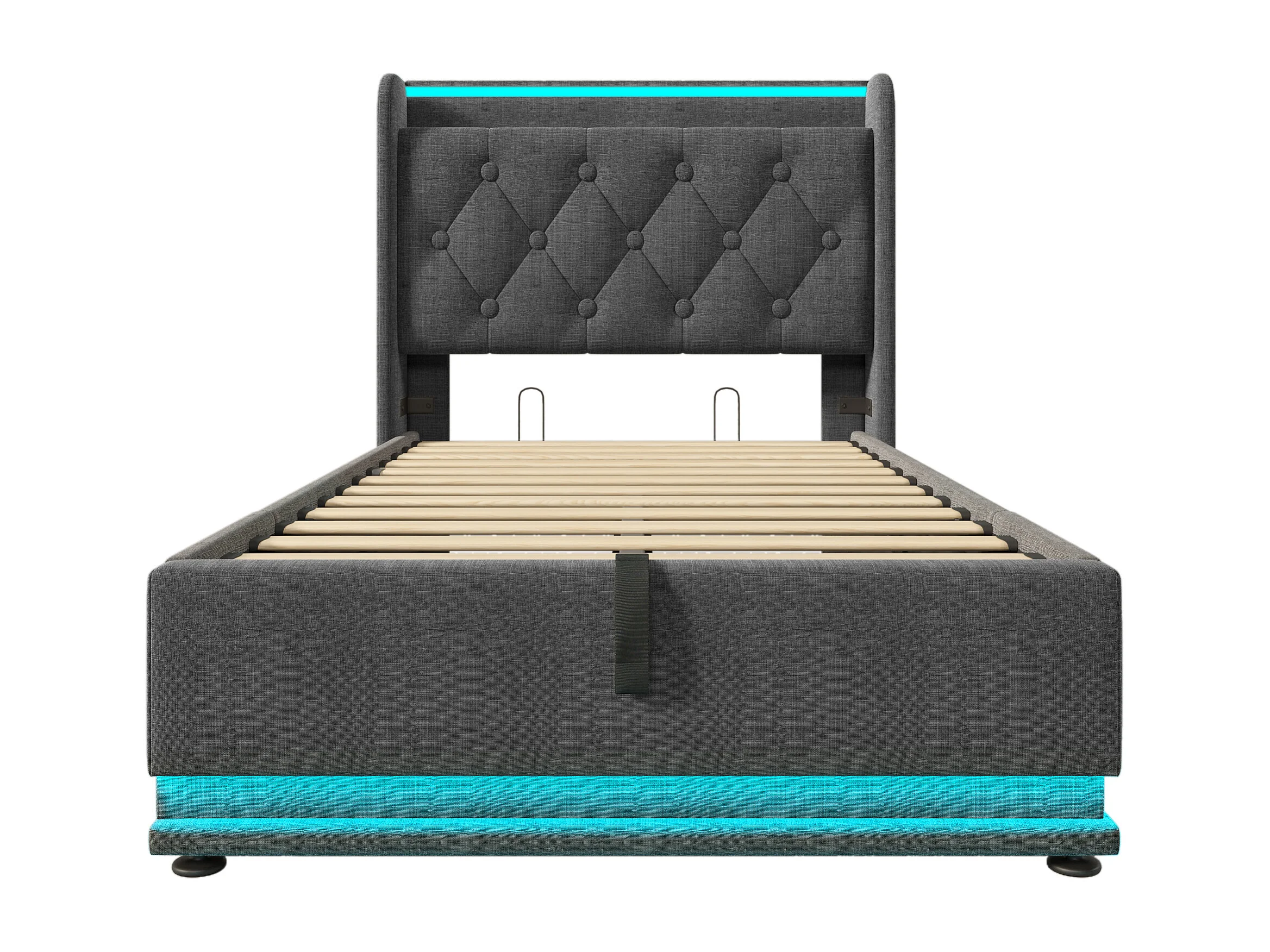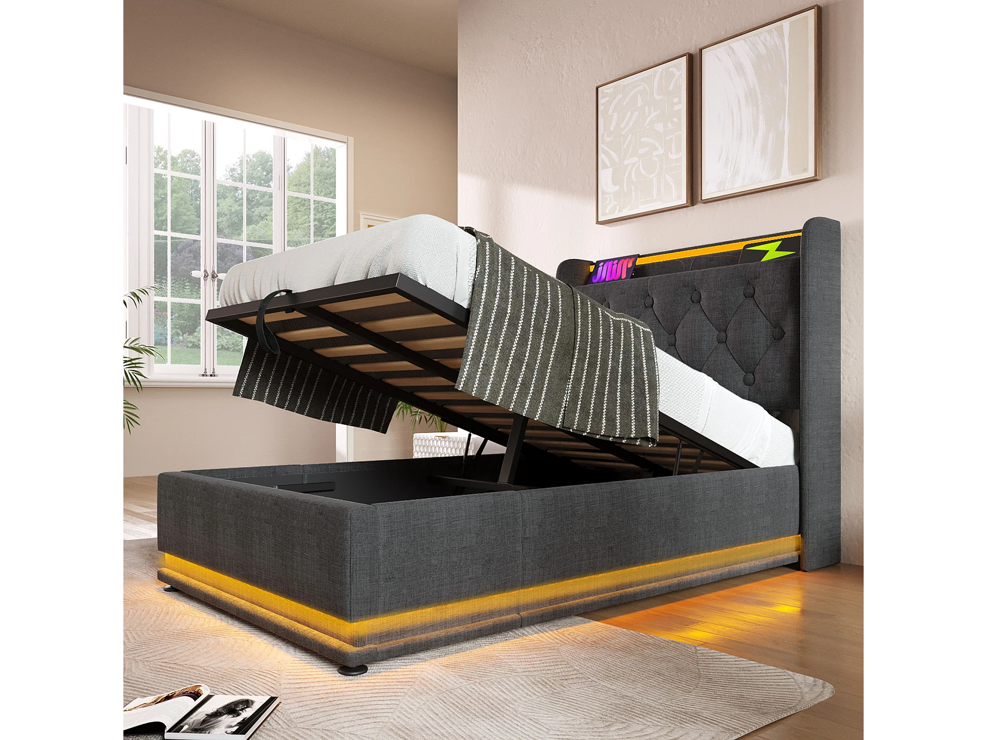Lit Coffre 220x104x104 cm avec LED USB Espace de rangement Matelas Sommier à lattes en bois en gris pour enfants et adolescents
