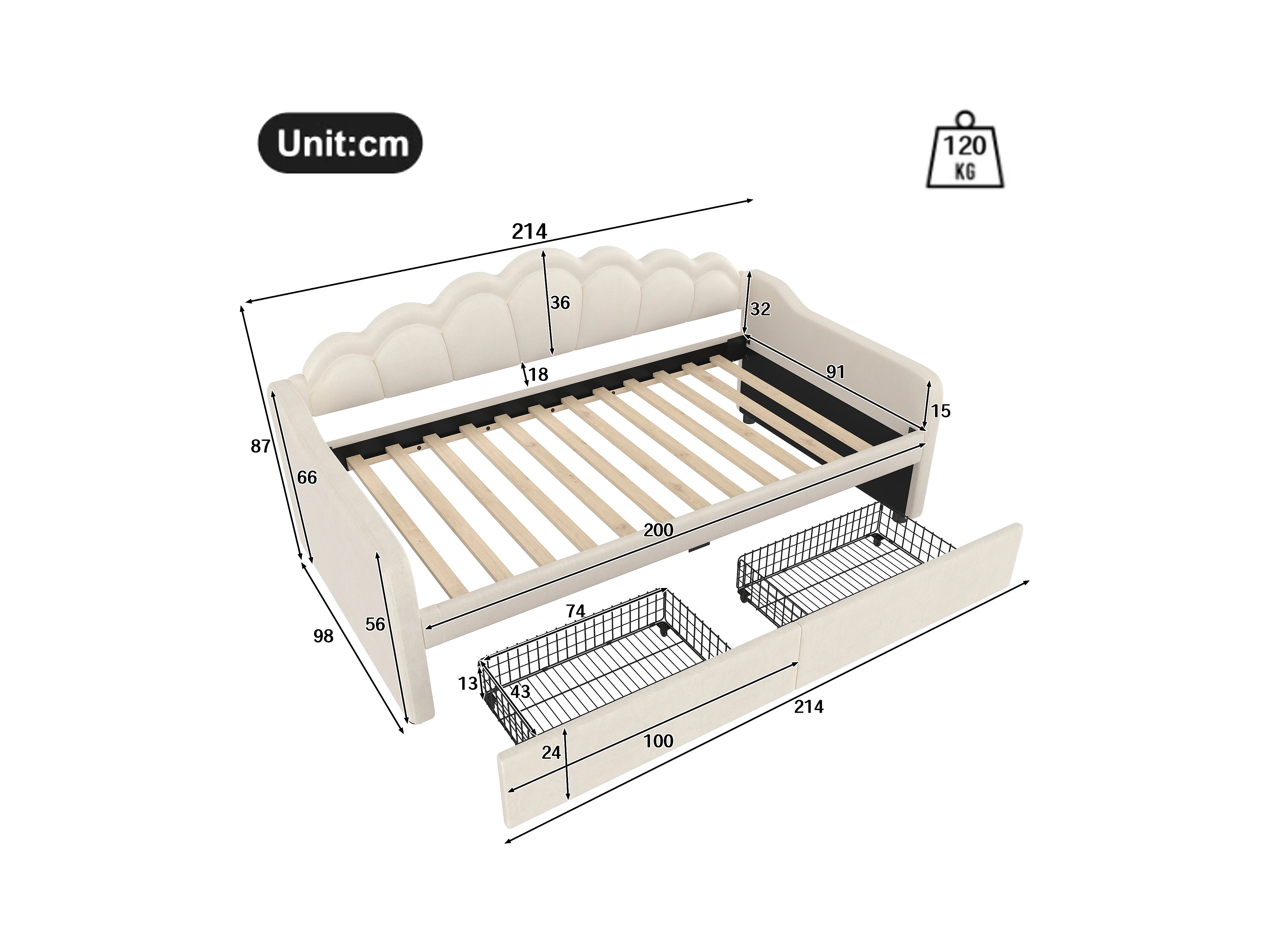 lit coffre - 90 x 200 cm - 2 tiroirs - canapé-lit avec Leds - sans matelas - velours + MDF - beige