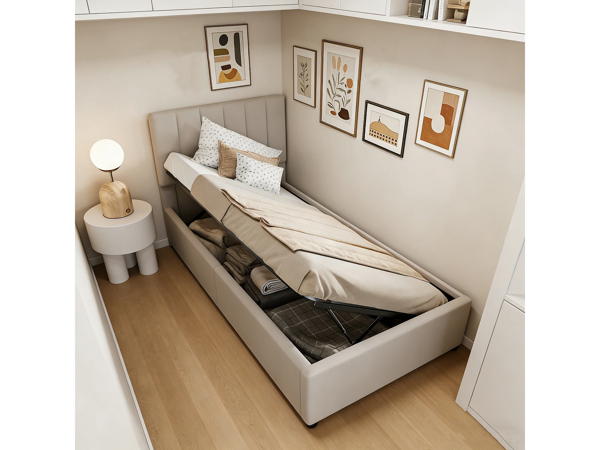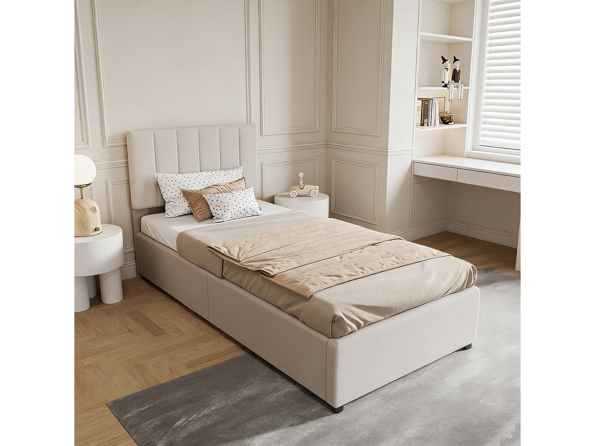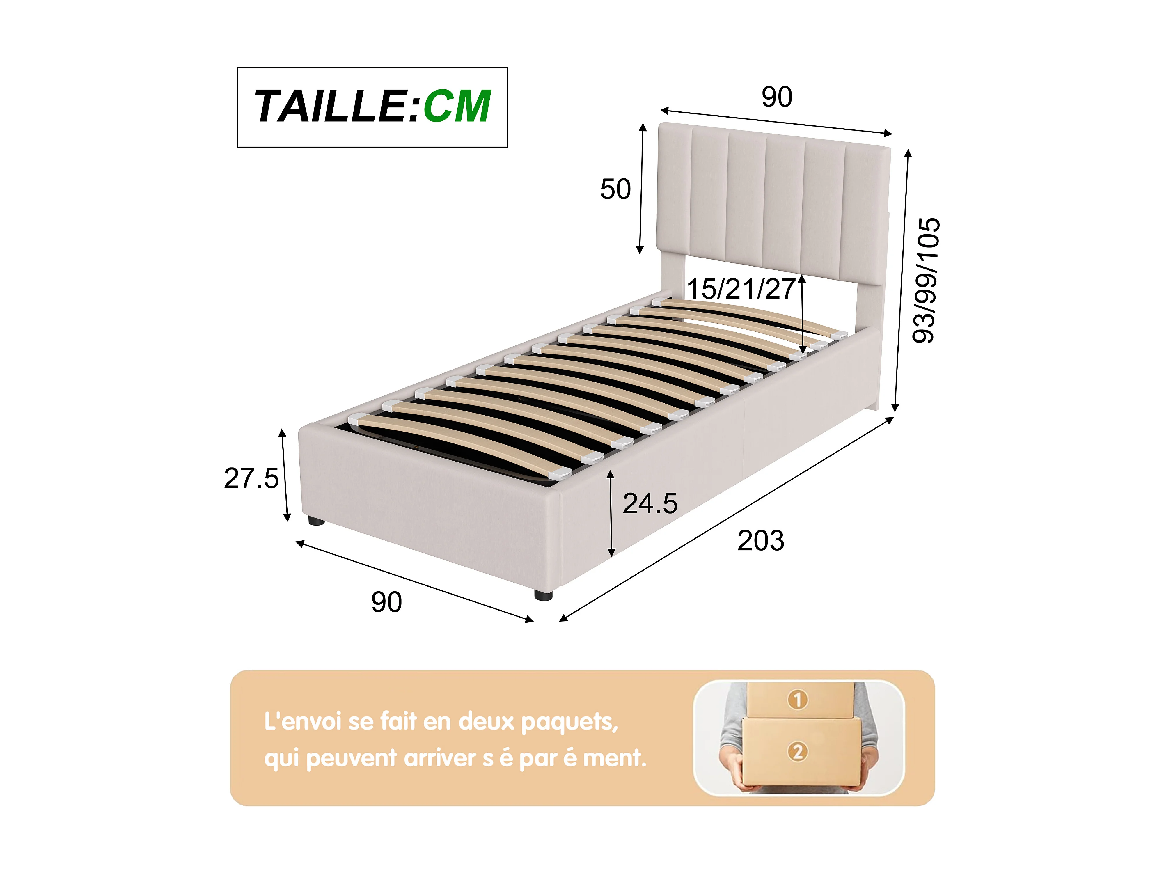Lit coffre 90 x 200 cm avec sommier à lattes - Lit enfent 90x200 cm Tête de lit réglable et capitonné - rayures verticales - tissu lin - biege
