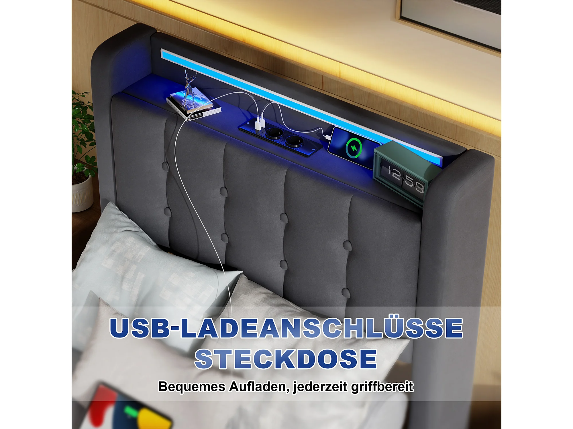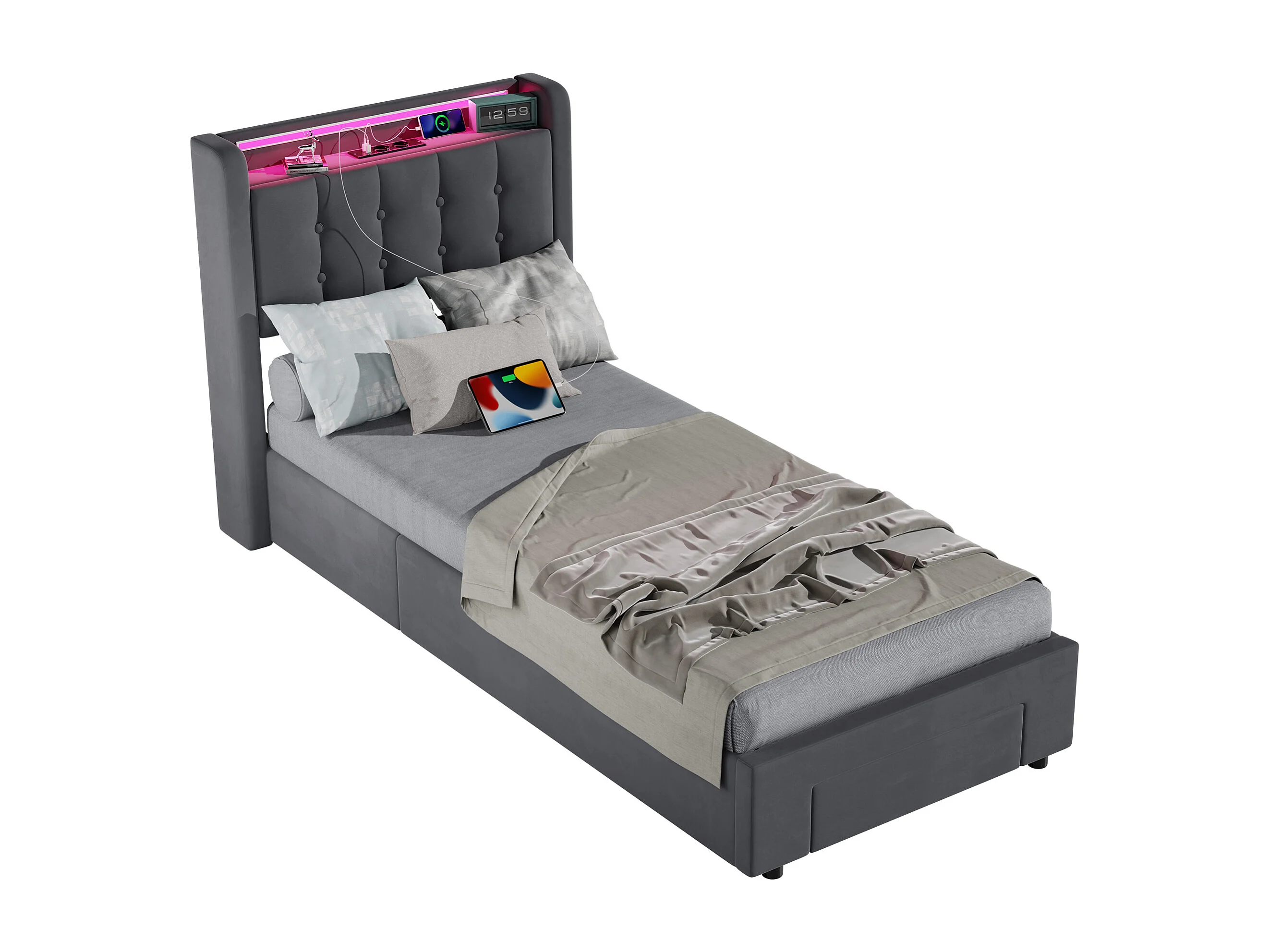 Lit coffre 90x190cm avec tiroir, prise et LED -Velours hollandais - Gris