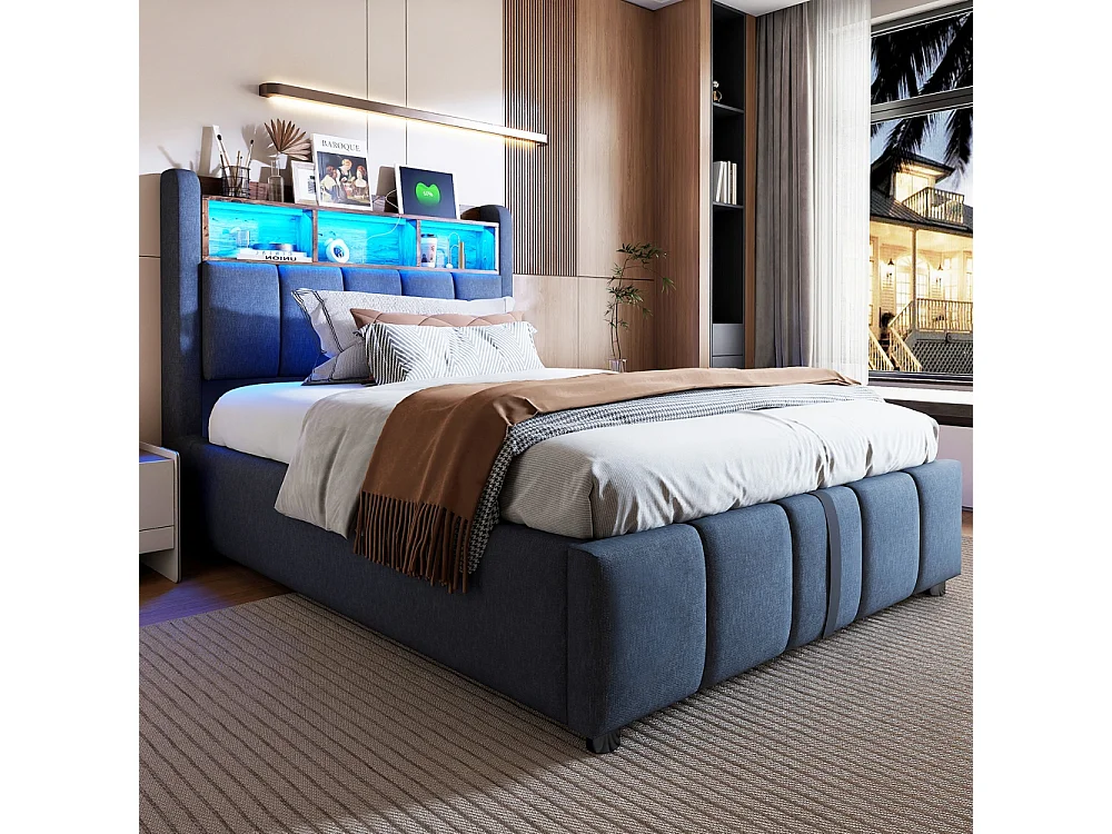 Lit coffre 90x200 avec éclairage LED et port USB tête de lit avec tablettes et espace de rangement avec espace de rangement hydraulique lin gris