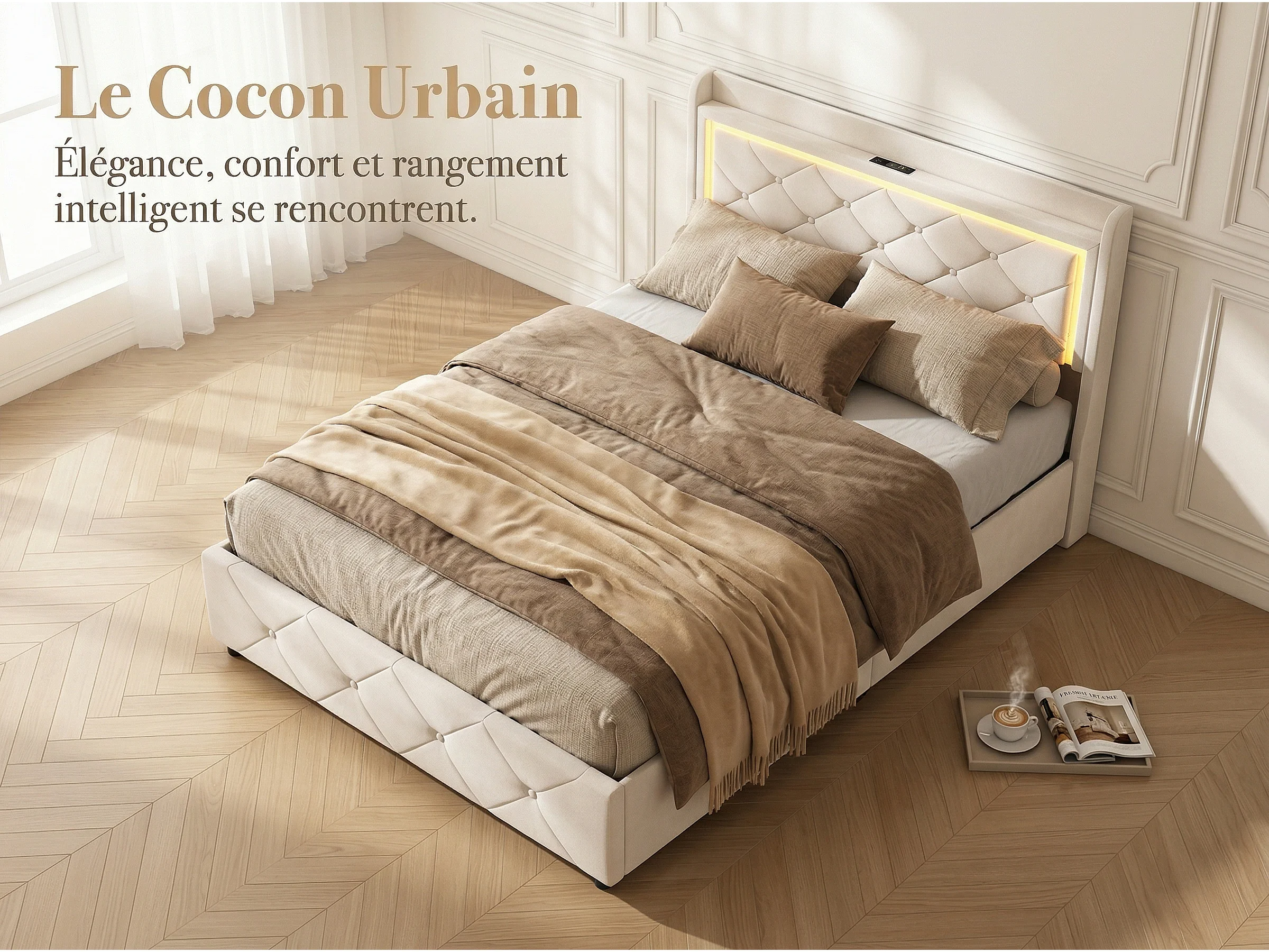 Lit coffre 90x200 avec LED et USB, lit double avec tête de lit rangement, lit en velours avec sommier