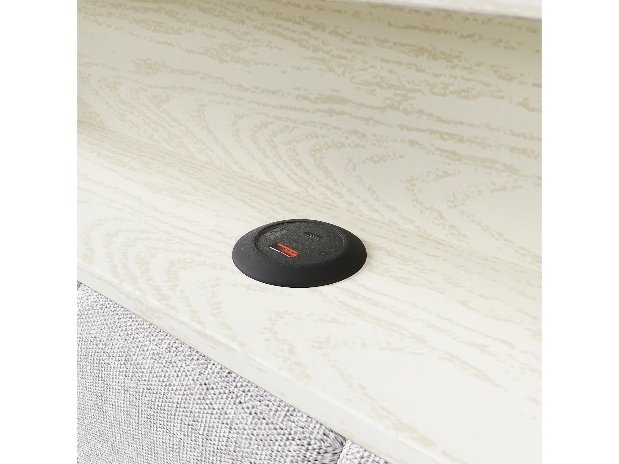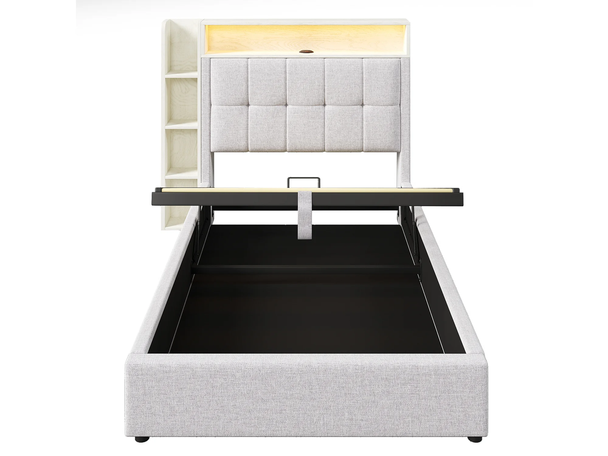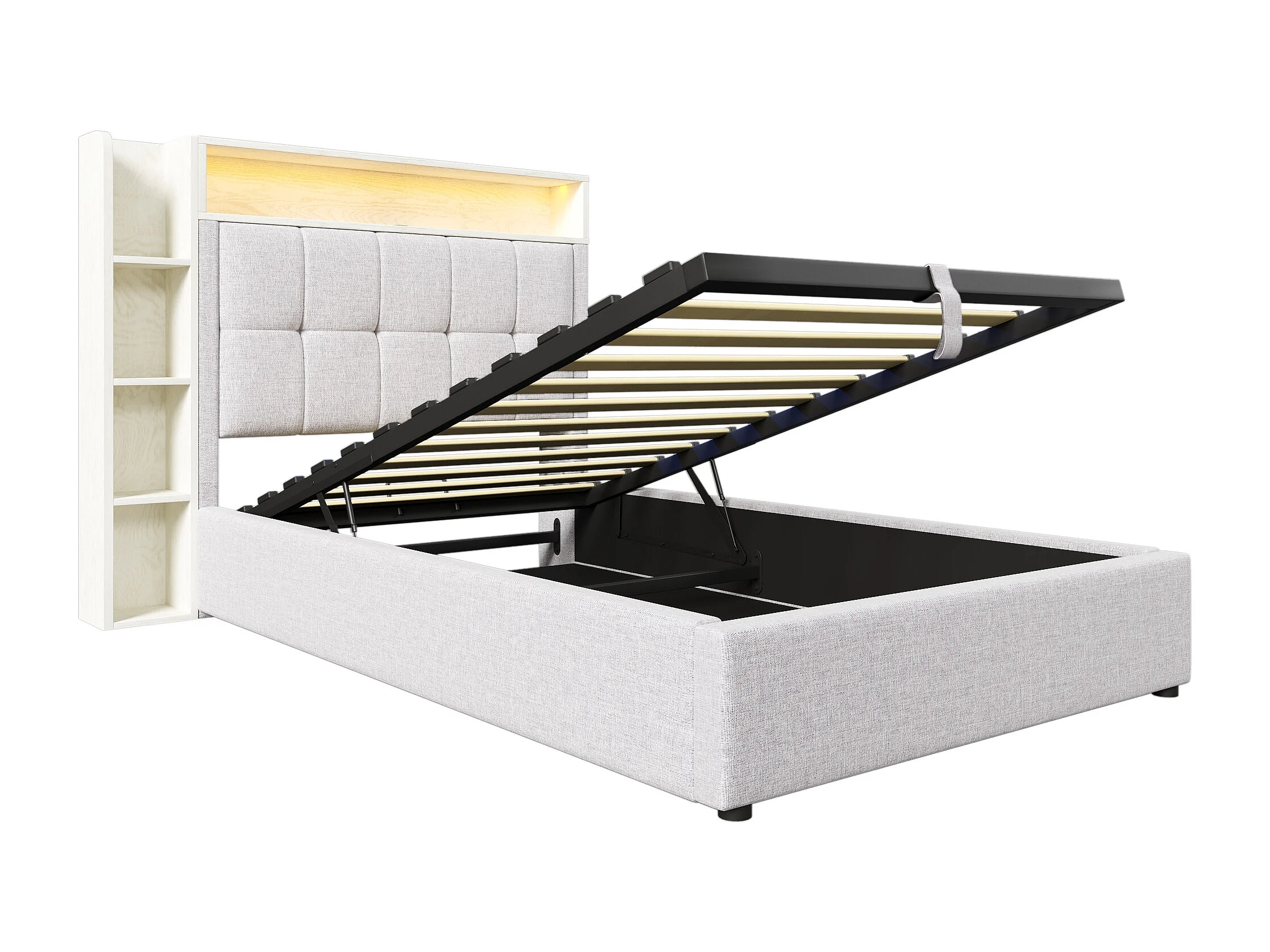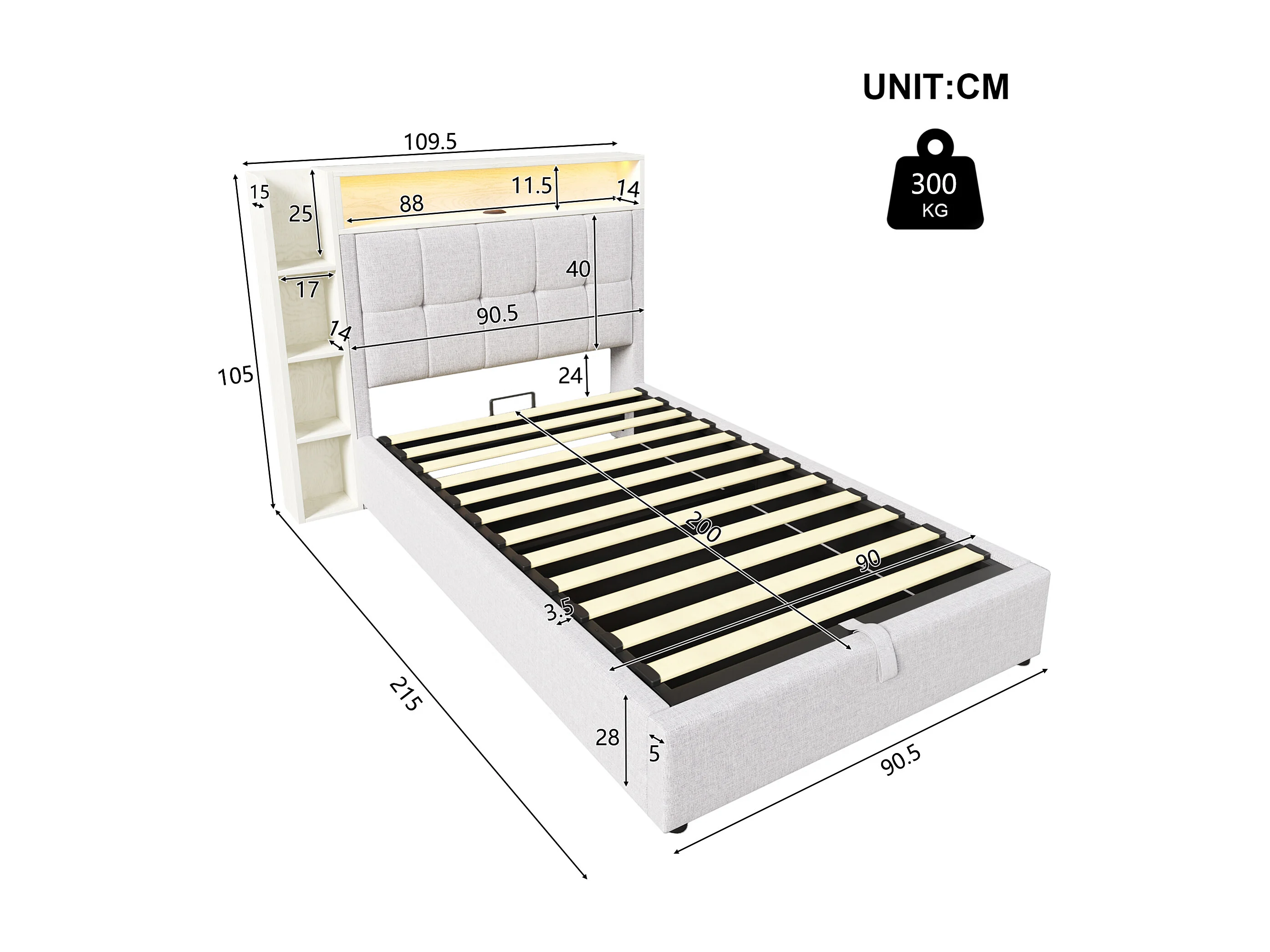 Lit coffre 90x200 cm avec LED, USB ,Type-C et rangement - Tissu lin beige