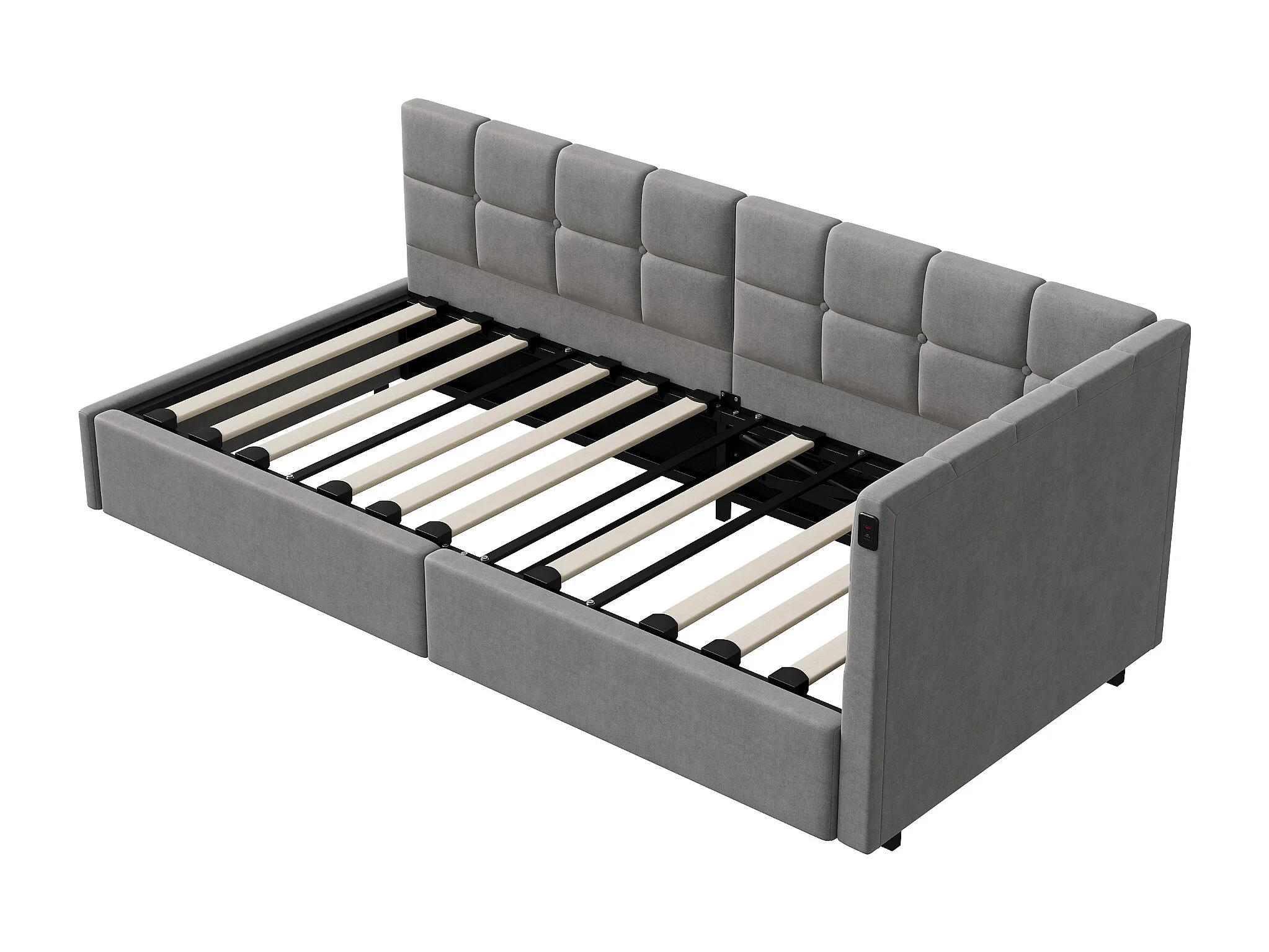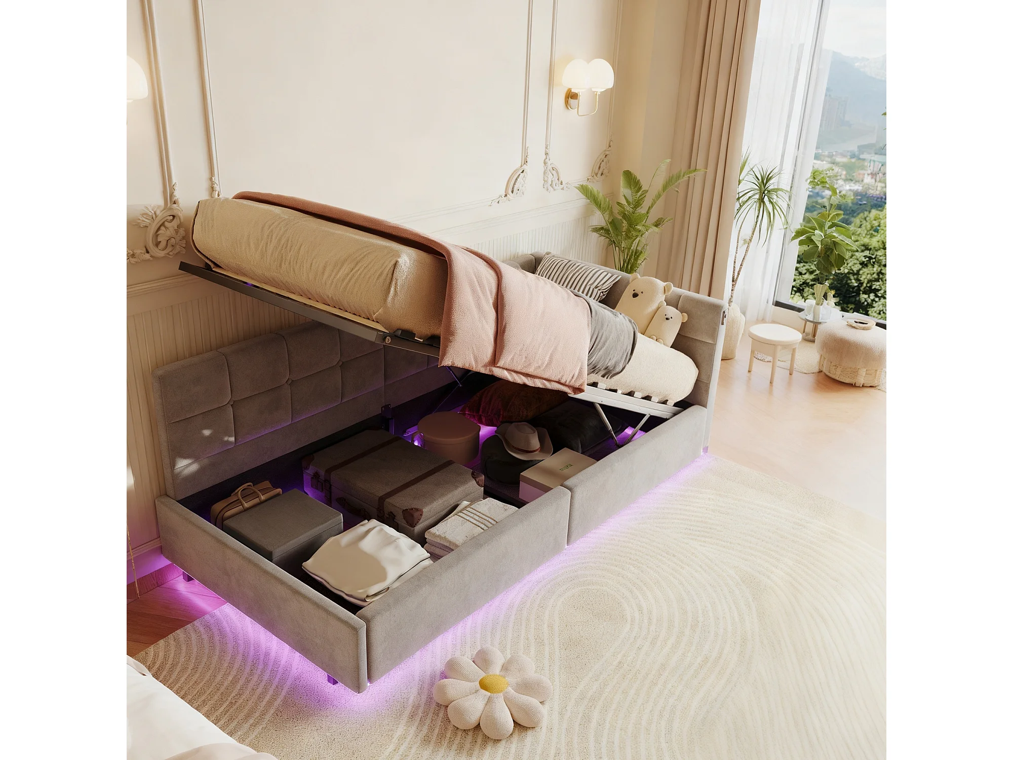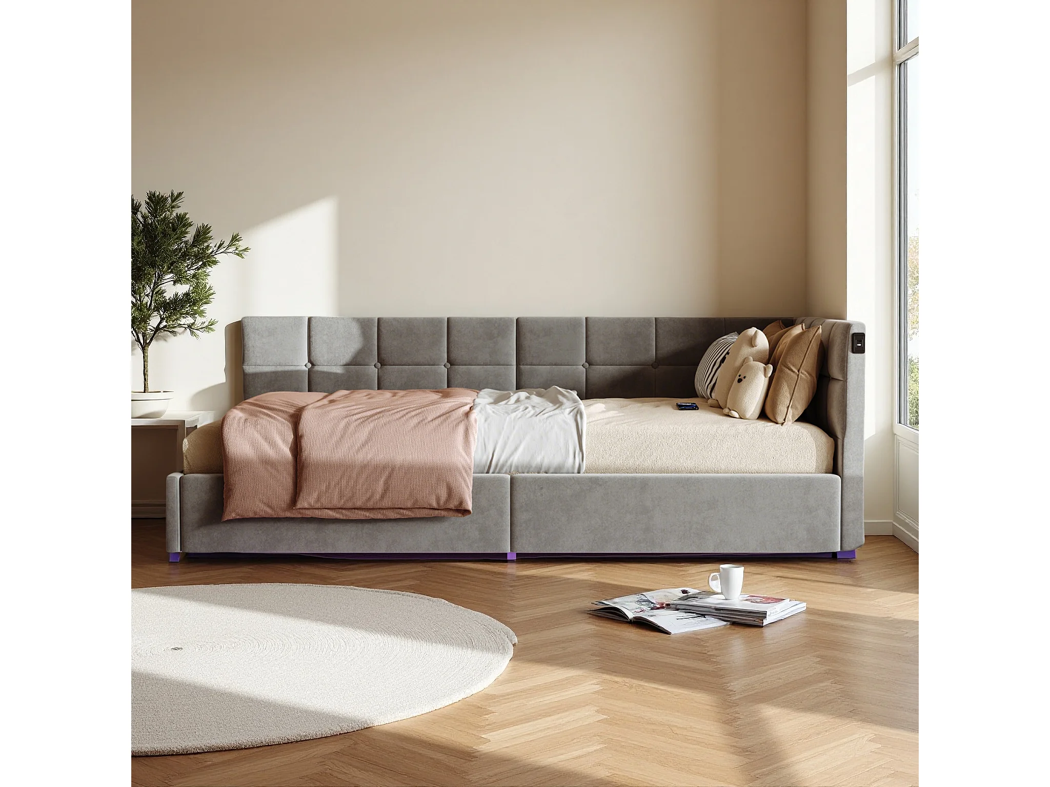 Lit coffre 90x200 cm avec sommier à lattes - lit 1 place 90x200 cm avec LDE et USB - cadre de lit 90x200 cm - canapé lit 90x200 - tissu en Velours - gris