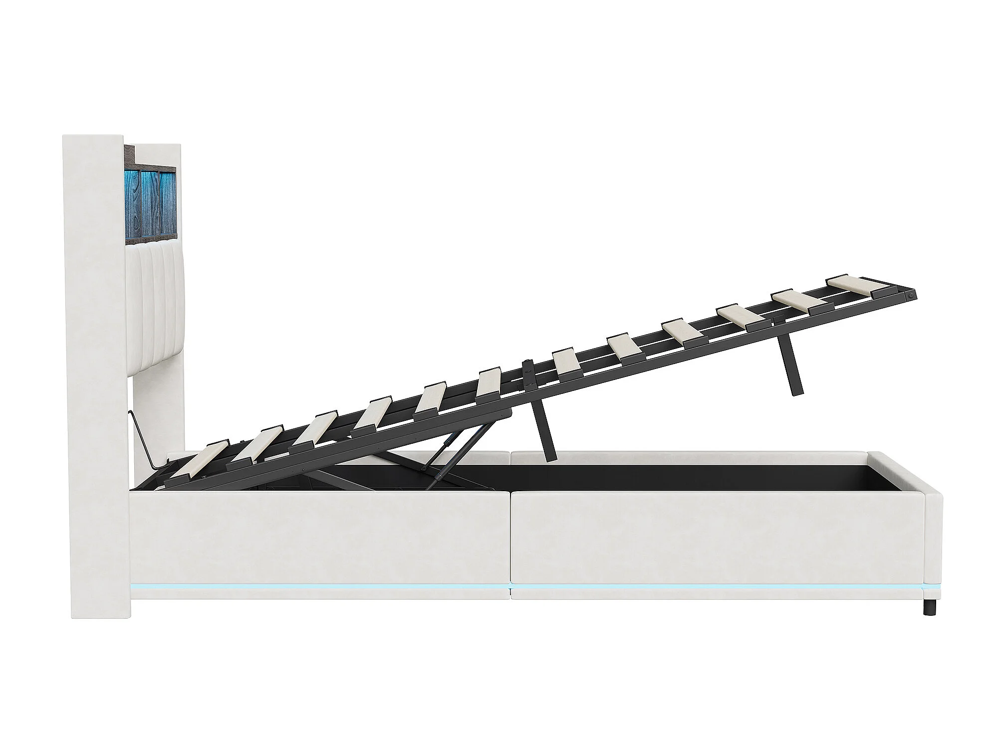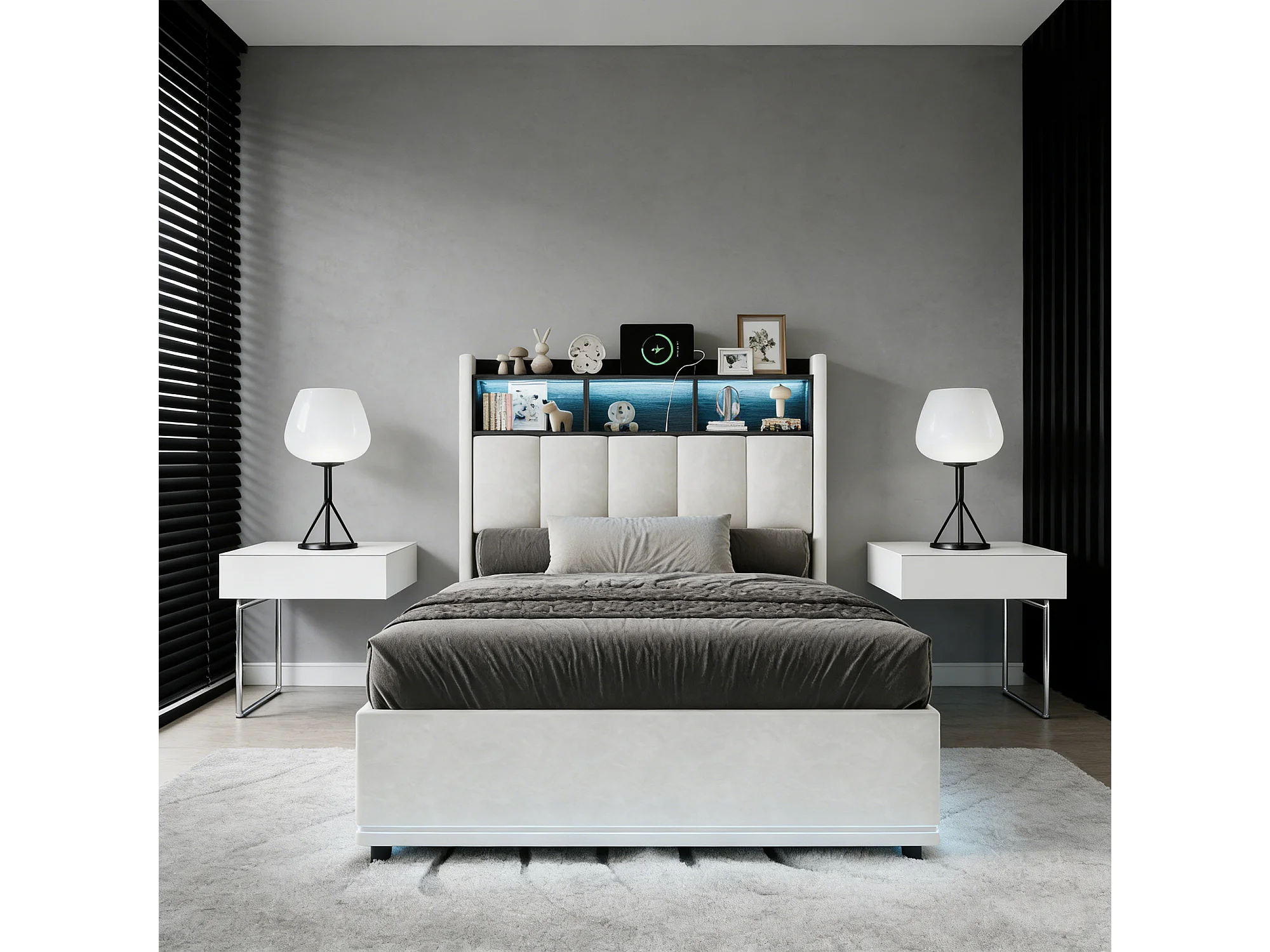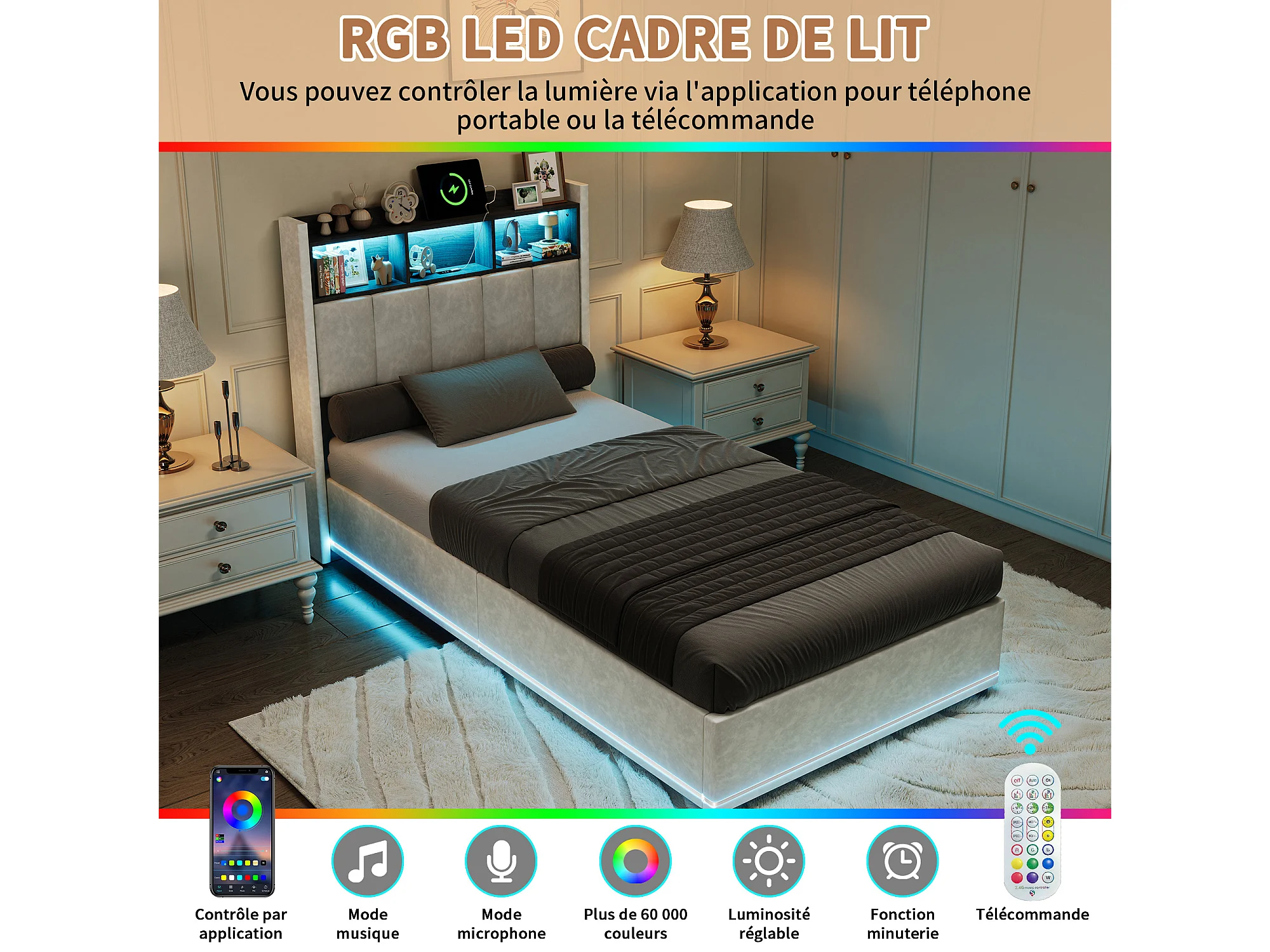 Lit coffre 90x200 cm rembourré, sommier à lattes, lit d'adulte 90x200 avec LED, tête de lit rangement avec USB et type-c, velours, beige
