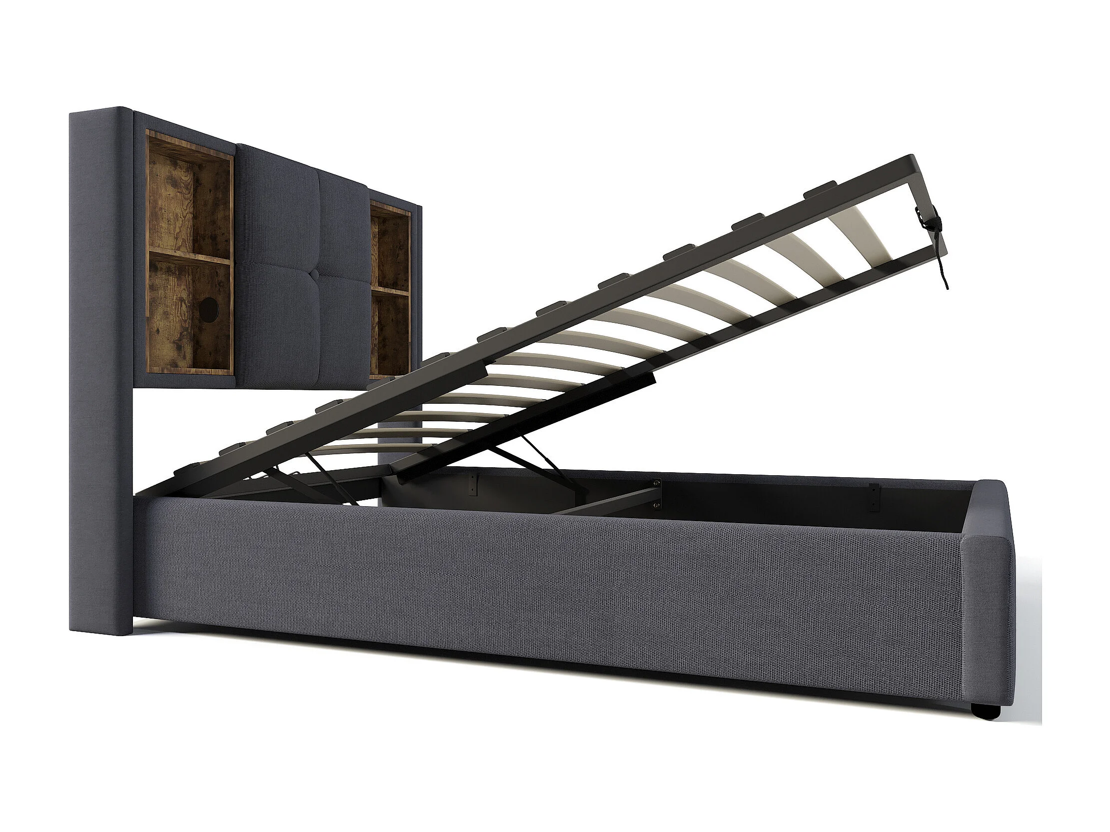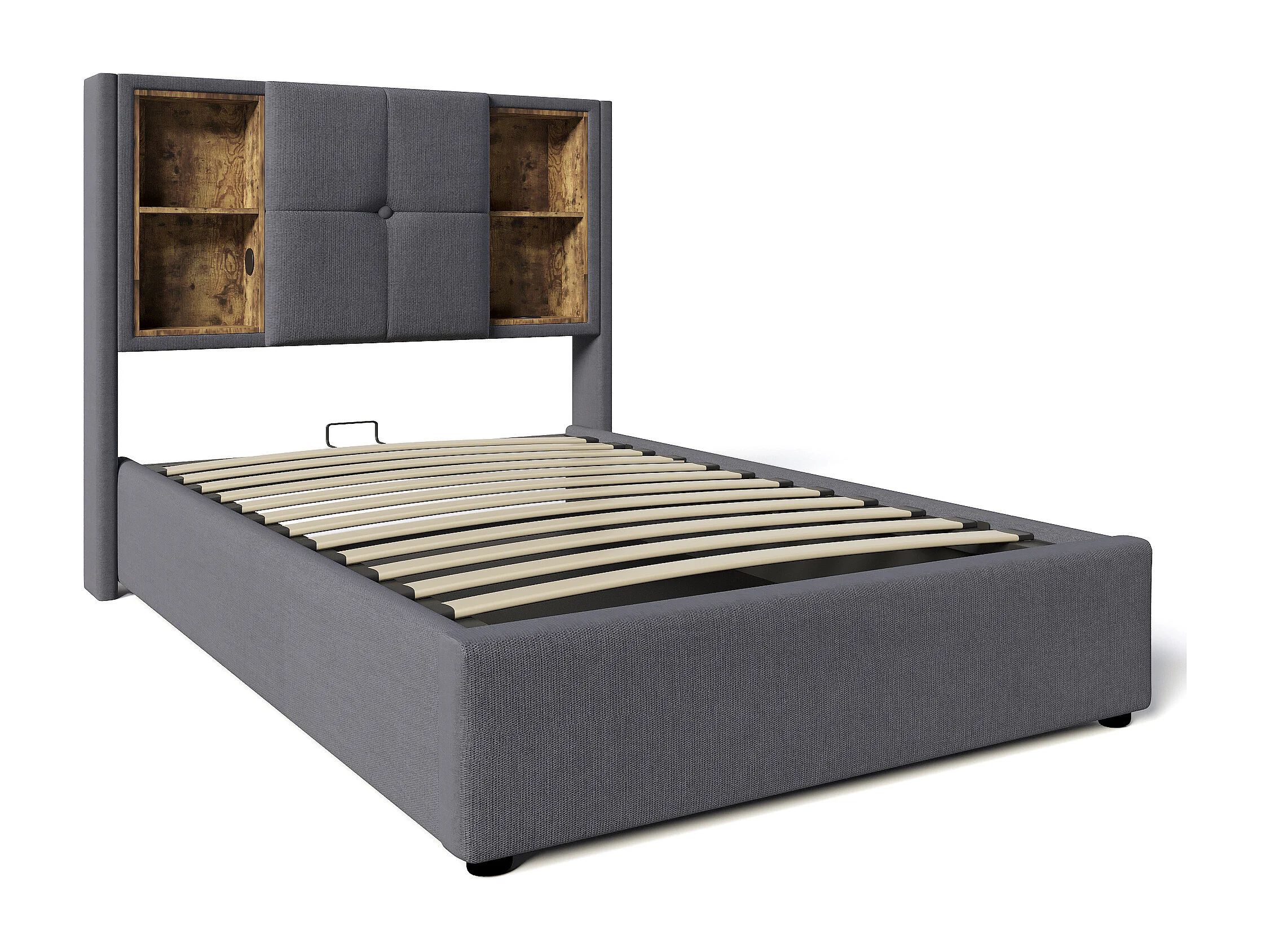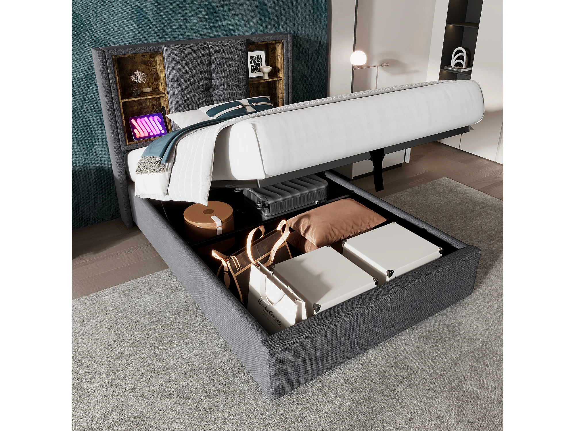 Lit coffre 90x200 cm - avec tête de lit avec rangement, USB / Type-C - en tissu - gris - matelas inclus
