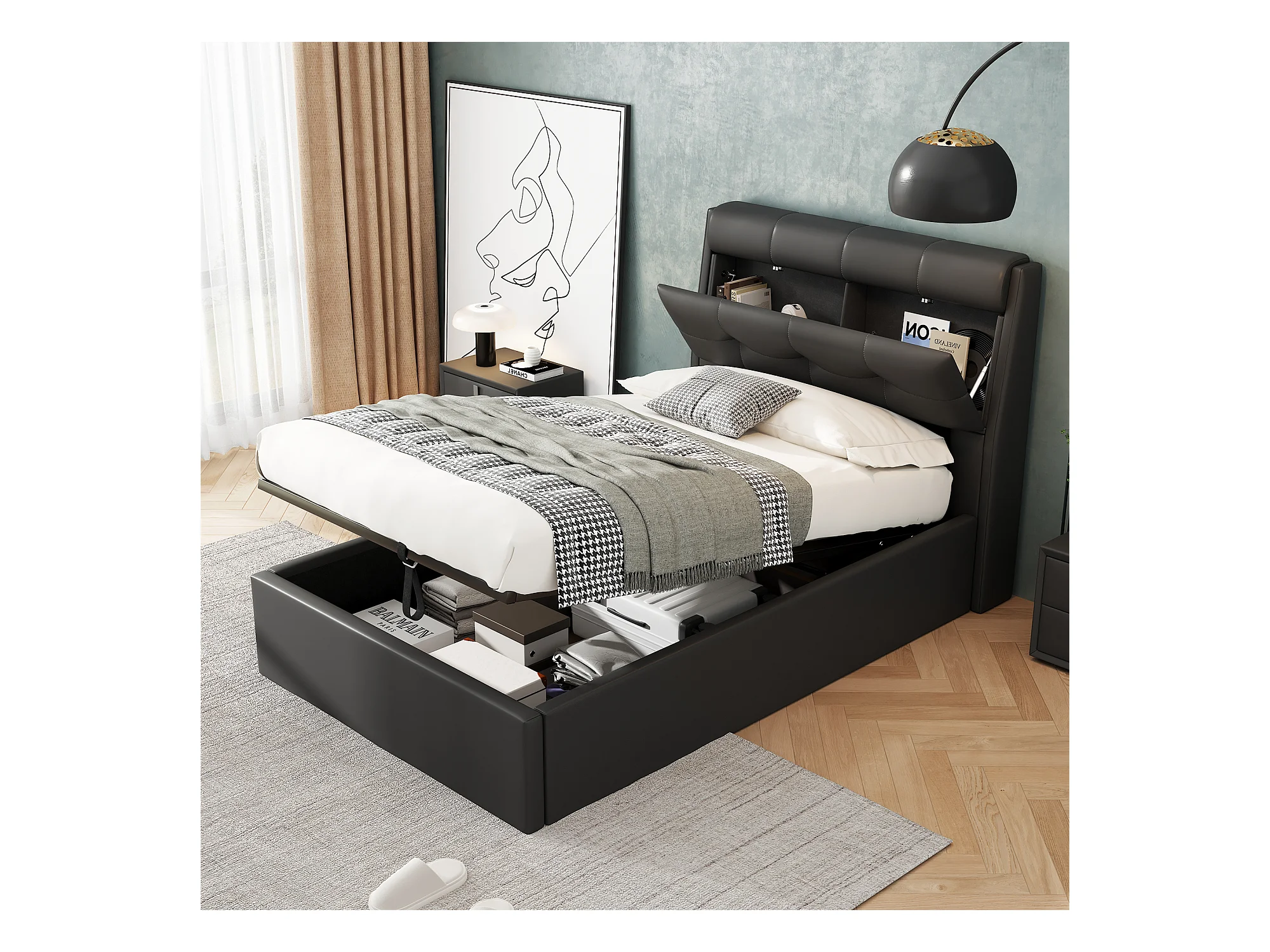 Lit coffre 90x200 cm - lit capitonné avec sommier à lattes et tête de lit coffre - PU - noir - sans matelas