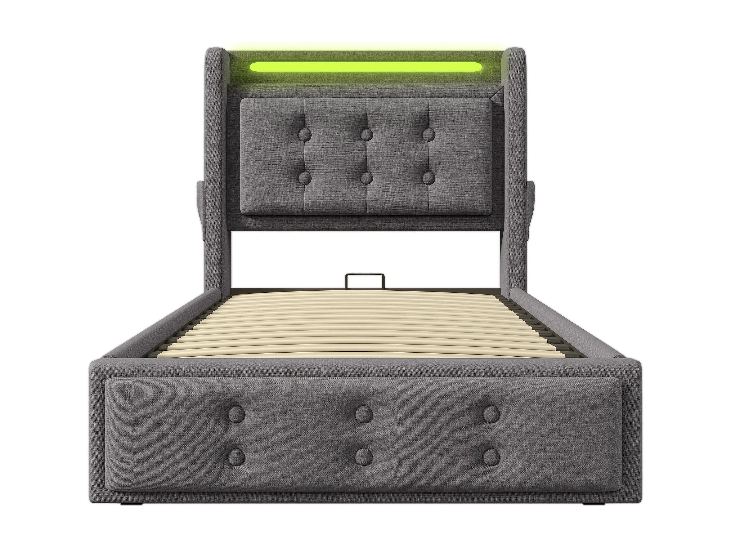 Lit coffre 90x200 cm - lit capitonné avec tête de lit LED et fonction de charge USB C - coton - gris - sans matelas
