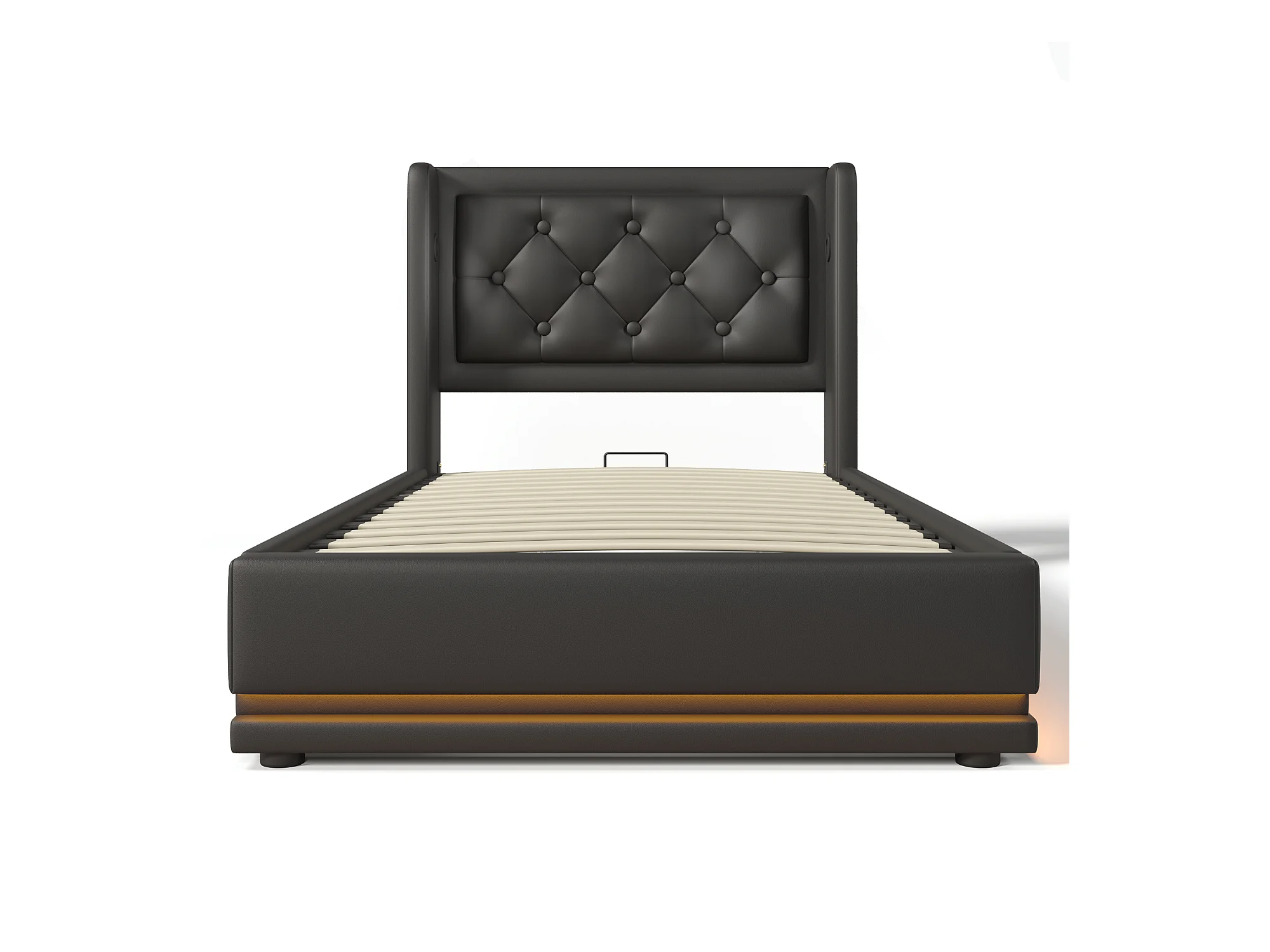 Lit coffre 90x200 cm - Lit simple capitonné avec fonction de chargement USB Type-C et fonction LED sur trois côtés - PU - noir - sans matelas