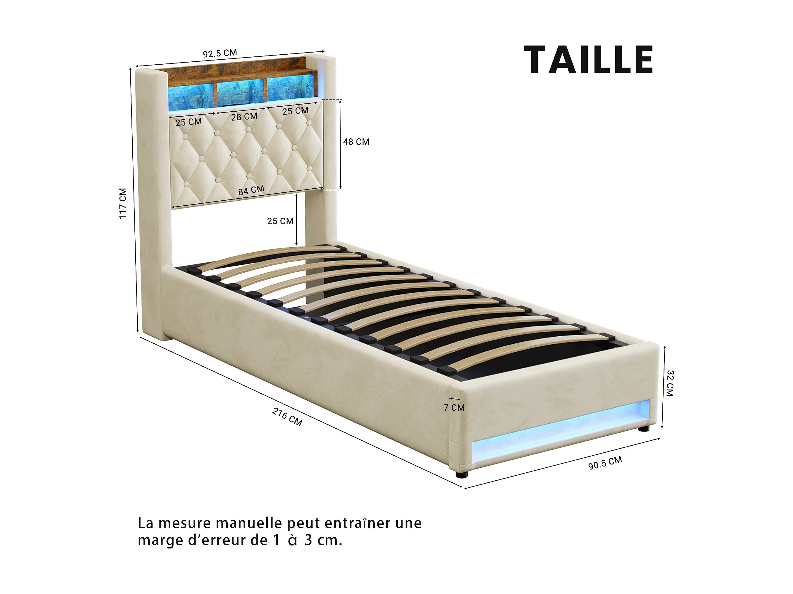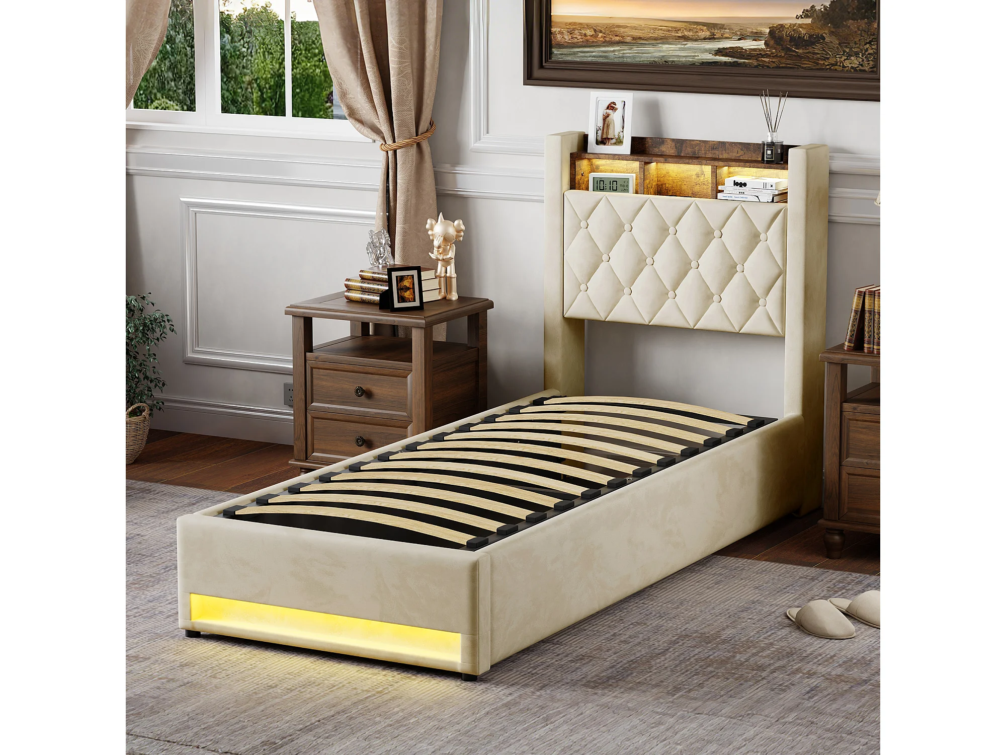 Lit coffre 90x200cm en velours hollandais - Lit simple avec prise et LED - Beige
