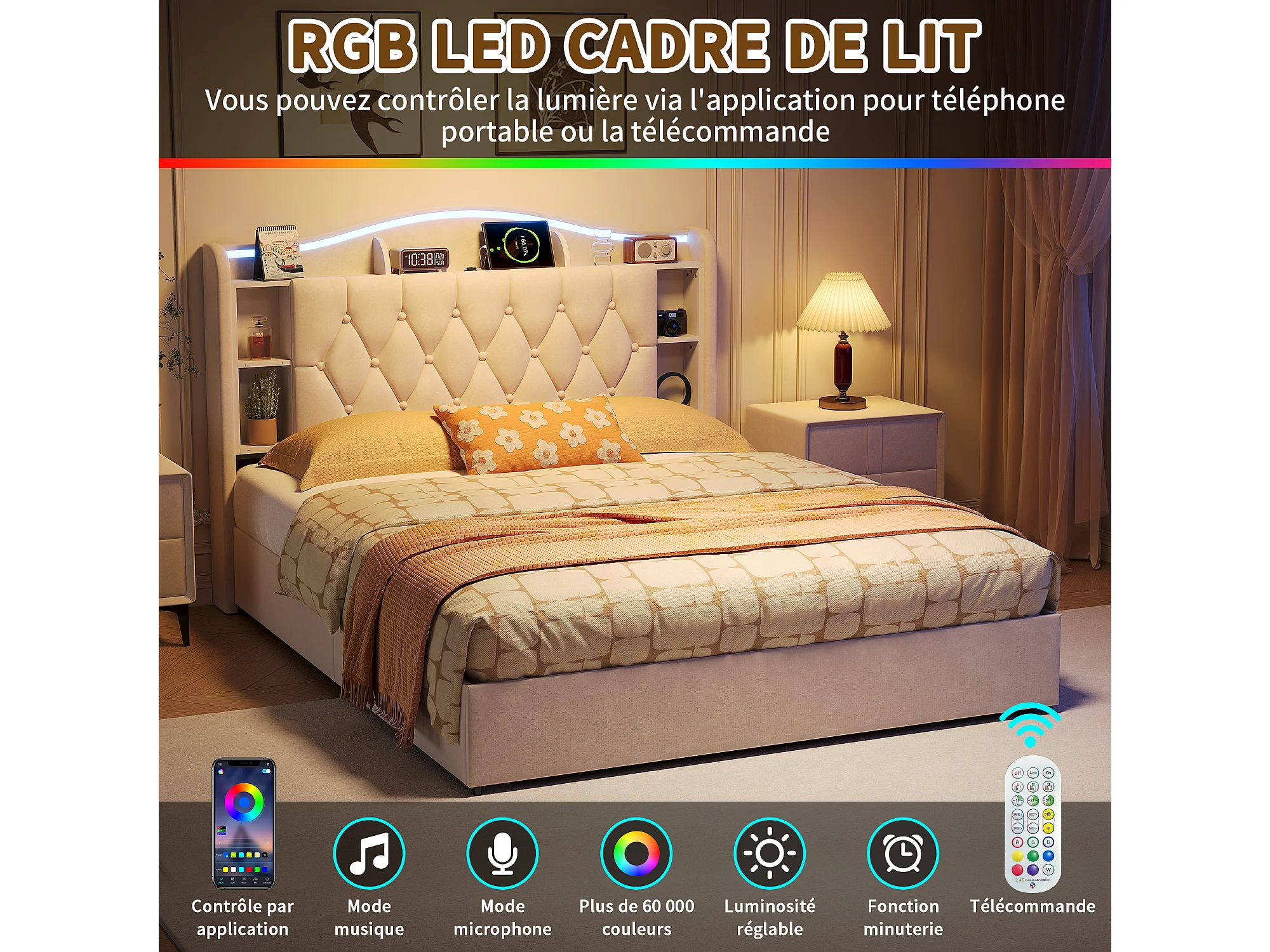 Lit coffre à abattant - 140 x 190 cm Cadre de lit - Cap-tête compartiment de stockage avec charge LED et USB - Beige - velours