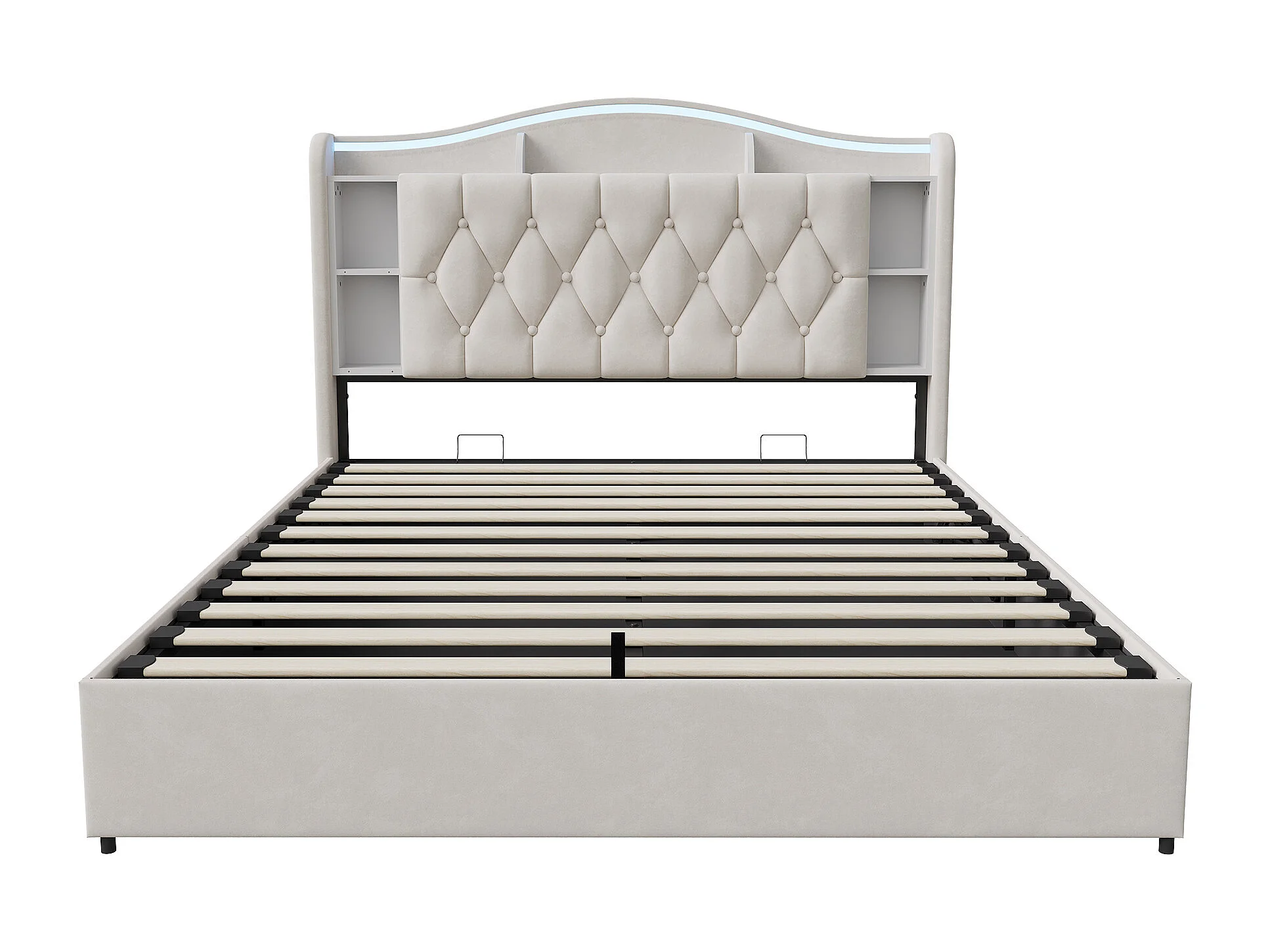 Lit coffre à abattant- 140 x 200 cm Cadre de lit - Cap-tête compartiment de stockage avec charge LED et USB - Beige - velours