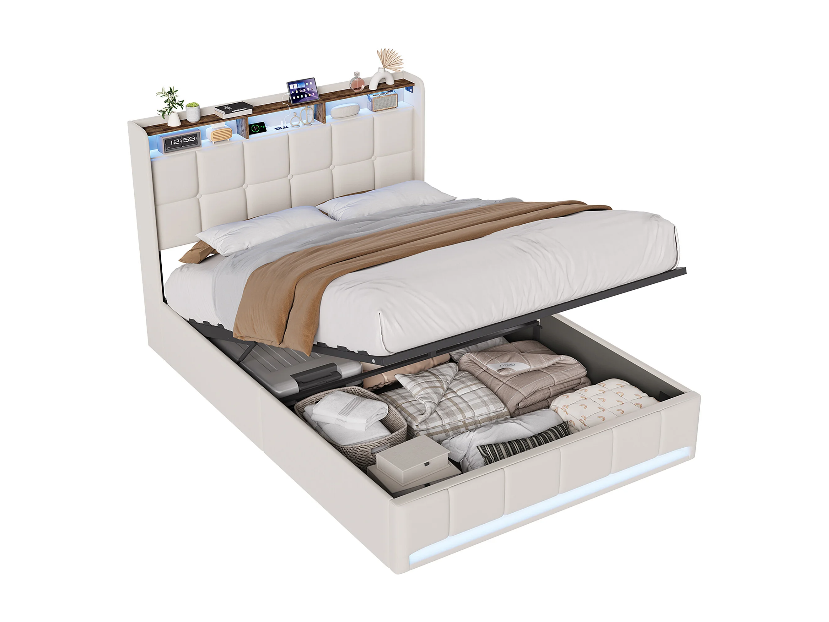 Lit coffre à pistons hydrauliques - 140 x 190 cm - avec chargement USB et éclairage LED - Tissu de lin - beige