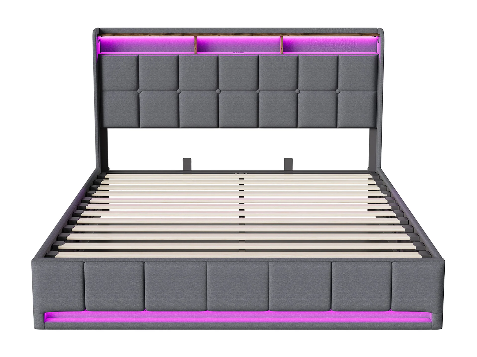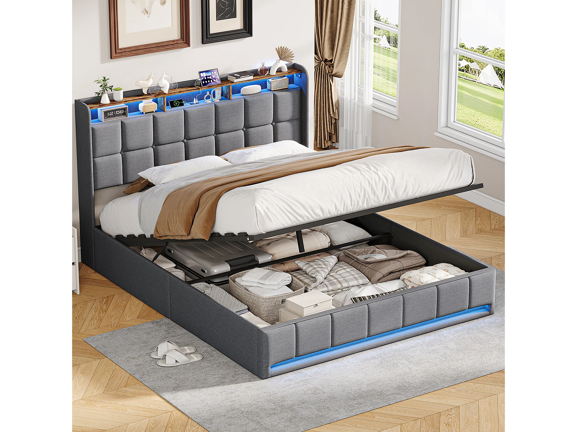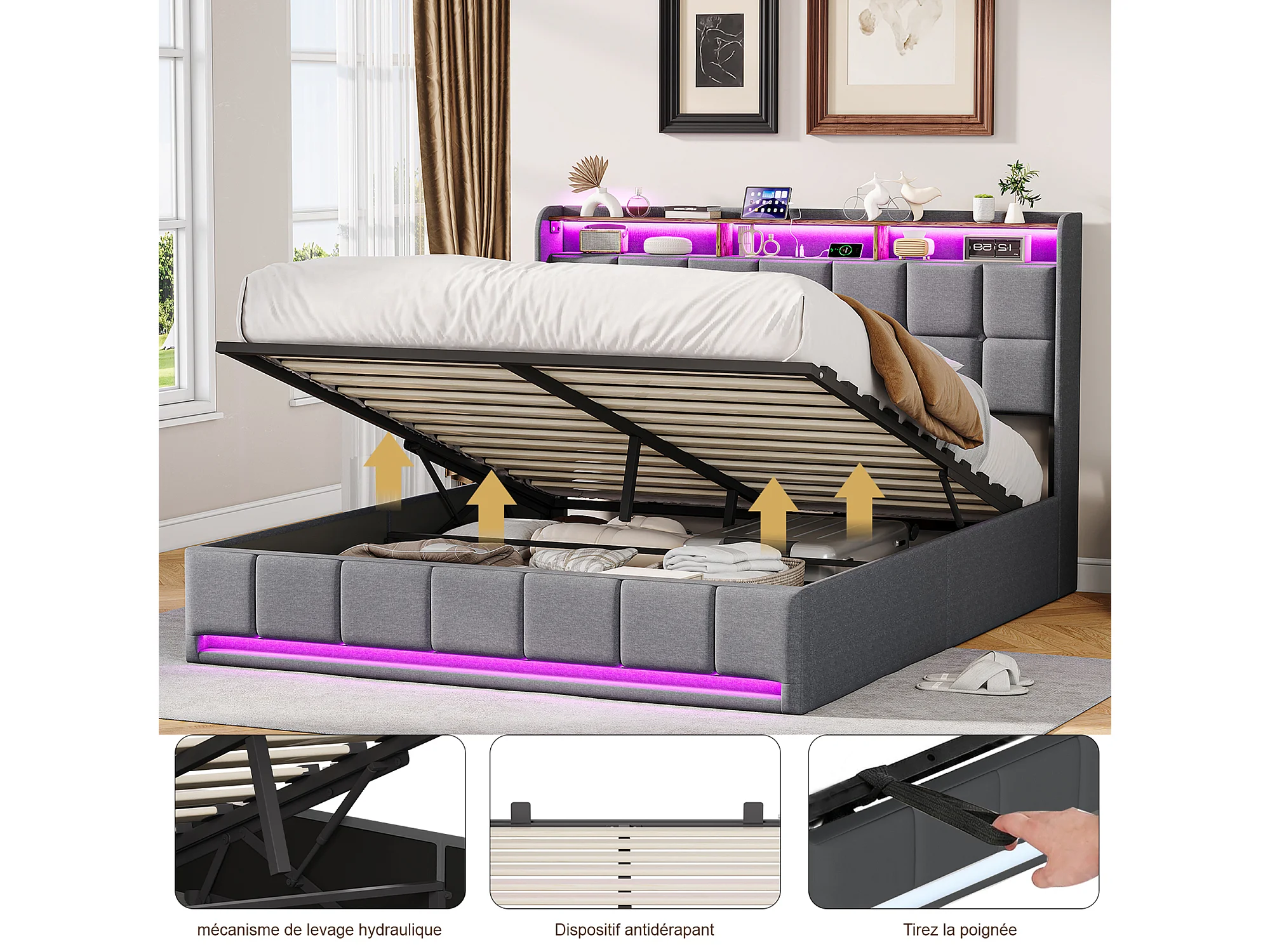 Lit coffre à pistons hydrauliques - 140 x 190 cm - avec chargement USB et éclairage LED - Tissu de lin - gris