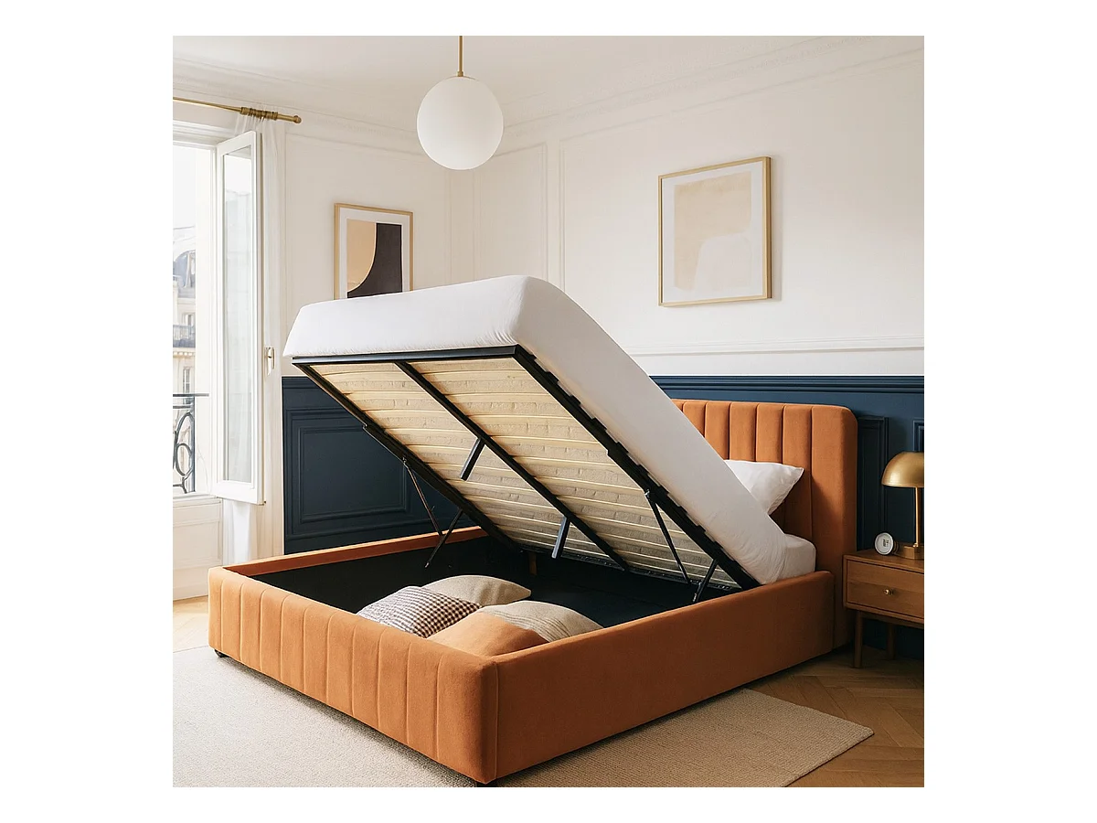 Lit coffre adulte 140x190 cm avec tête de lit capitonnée en velours terracotta - Ava