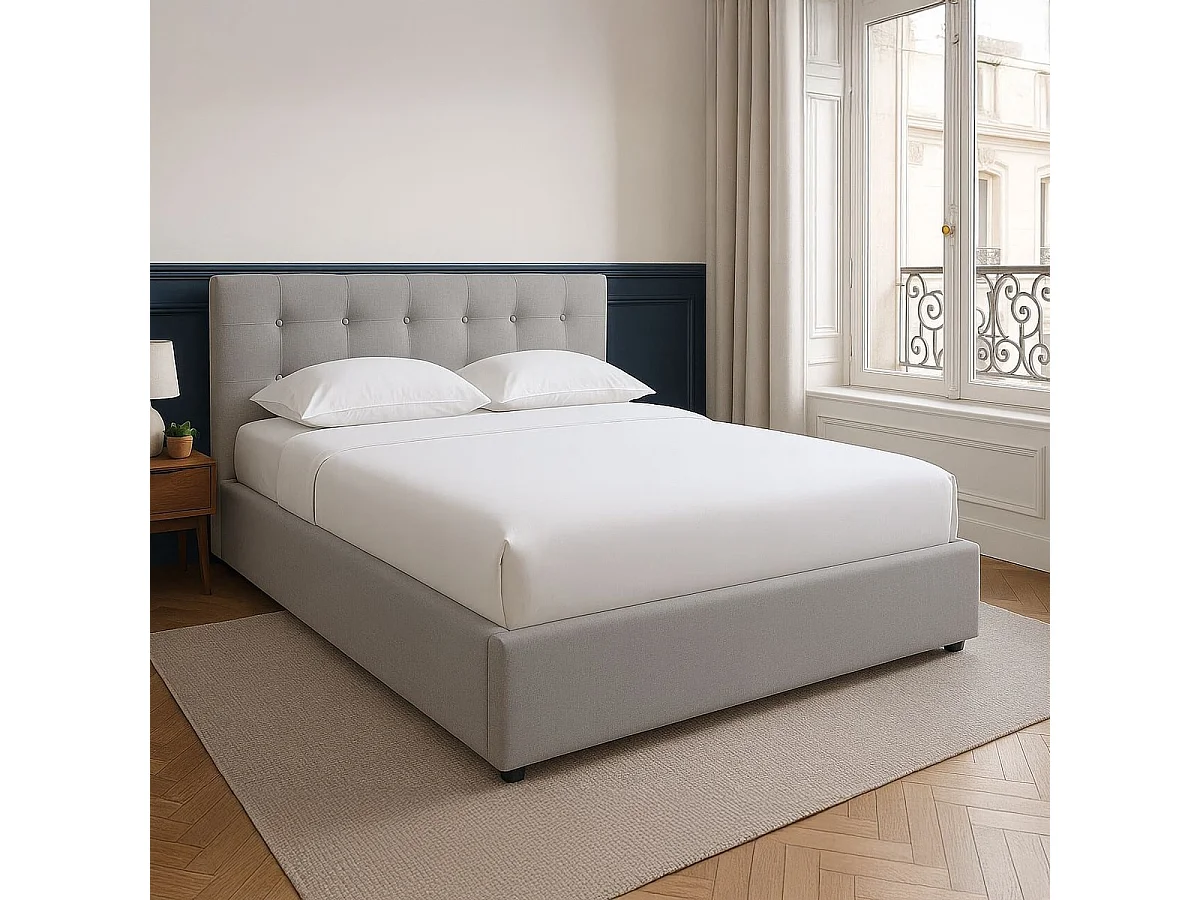 Lit coffre adulte 140x190 cm avec tête de lit matelassée en tissu gris et sommier - Tina