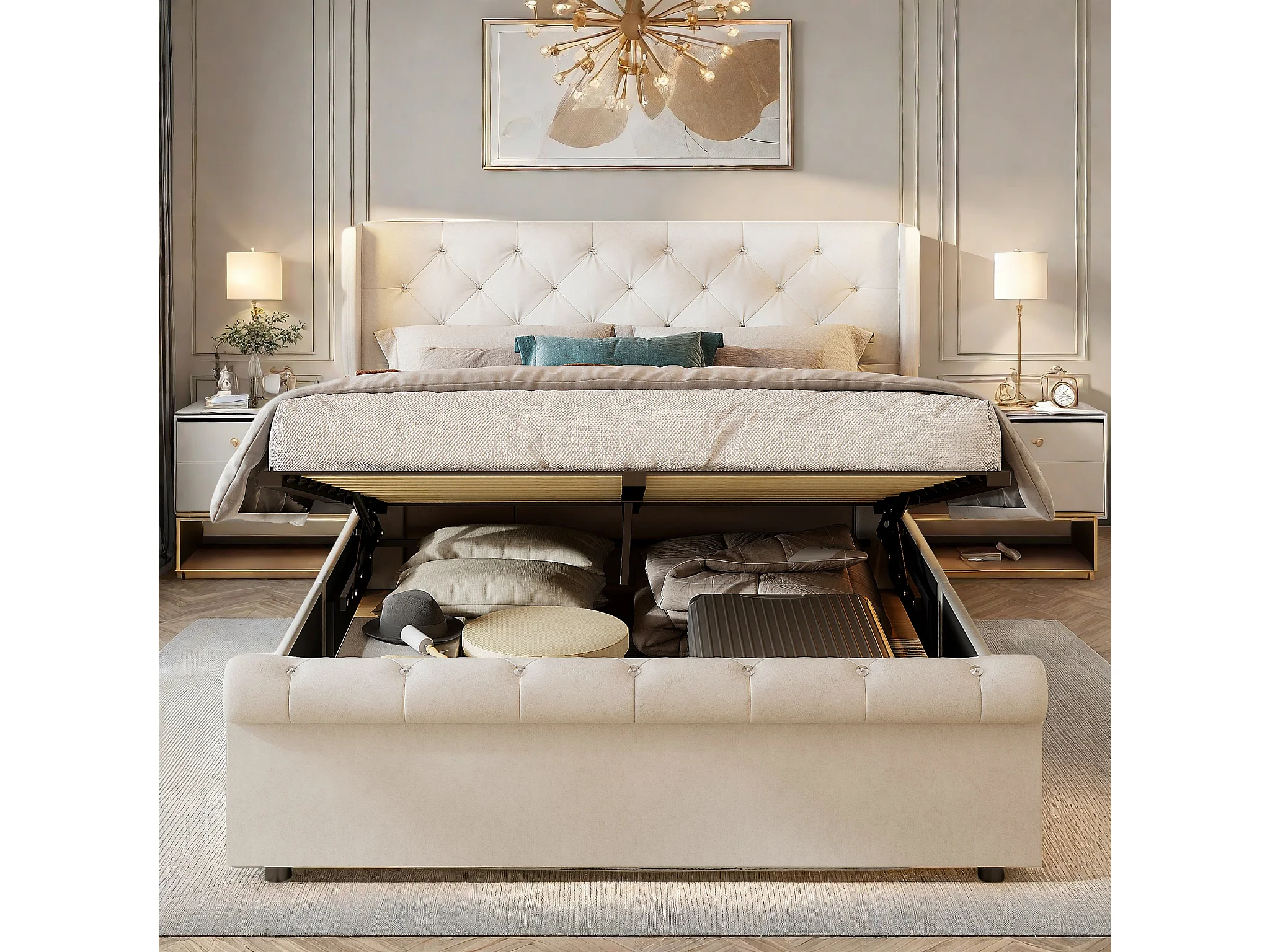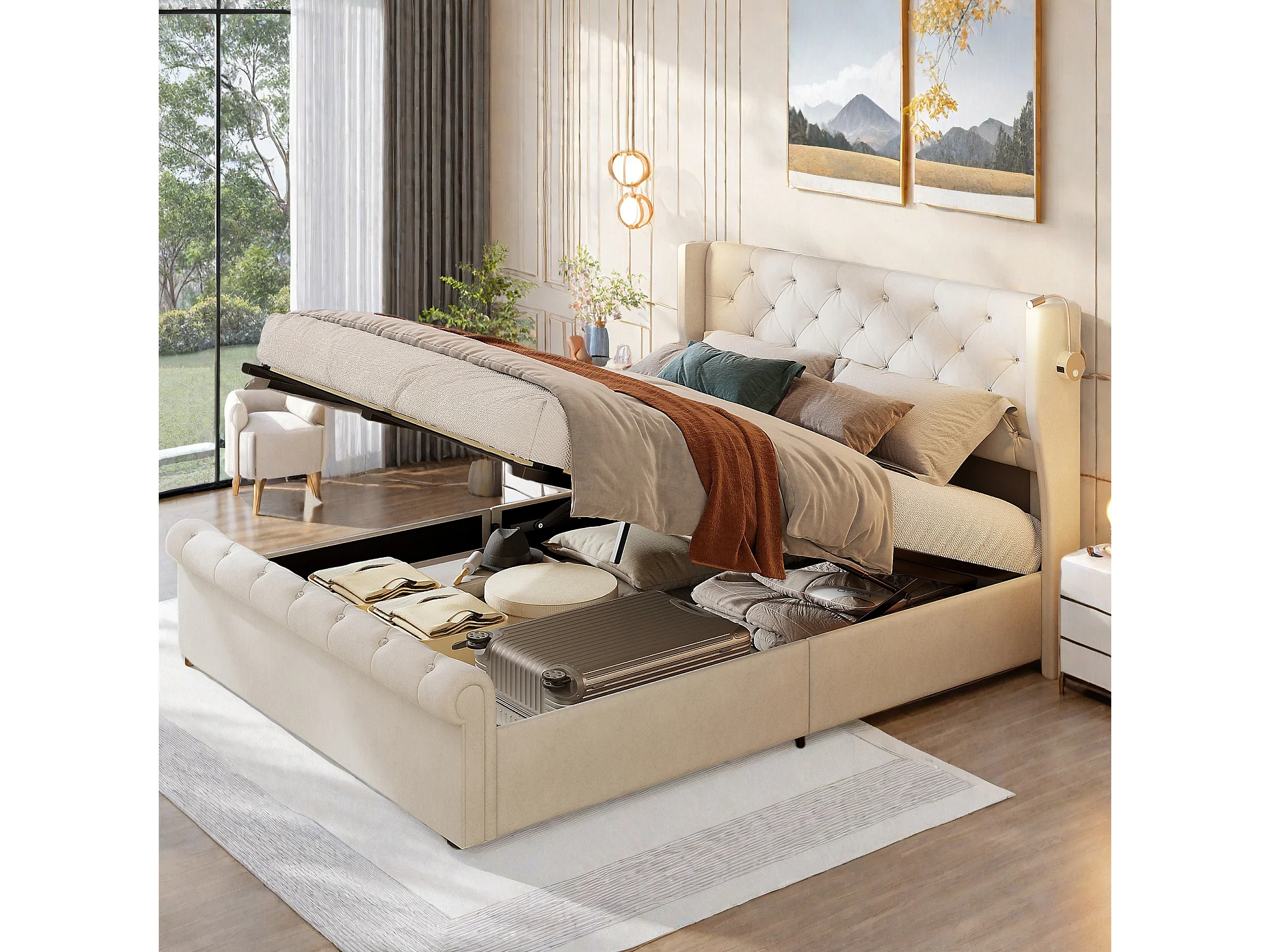 Lit coffre adulte 140x190 cm - Lit adulte en tissu velours beige - Lit double capitonné avec sommier à Lattes - Lampe de Lecture et USB