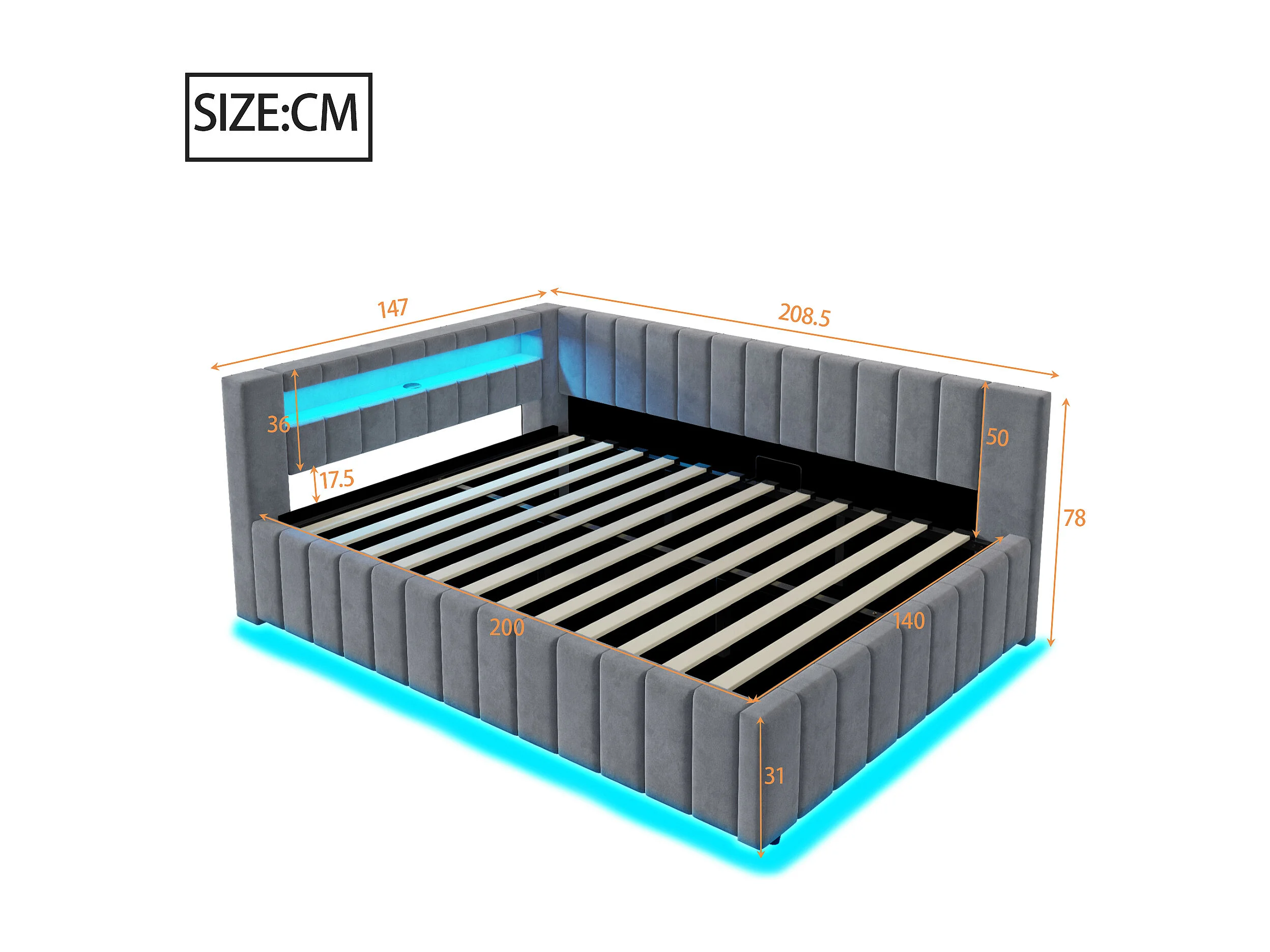 Lit coffre adulte 140x200cm avec LED et USB - Lit banquette en velours gris