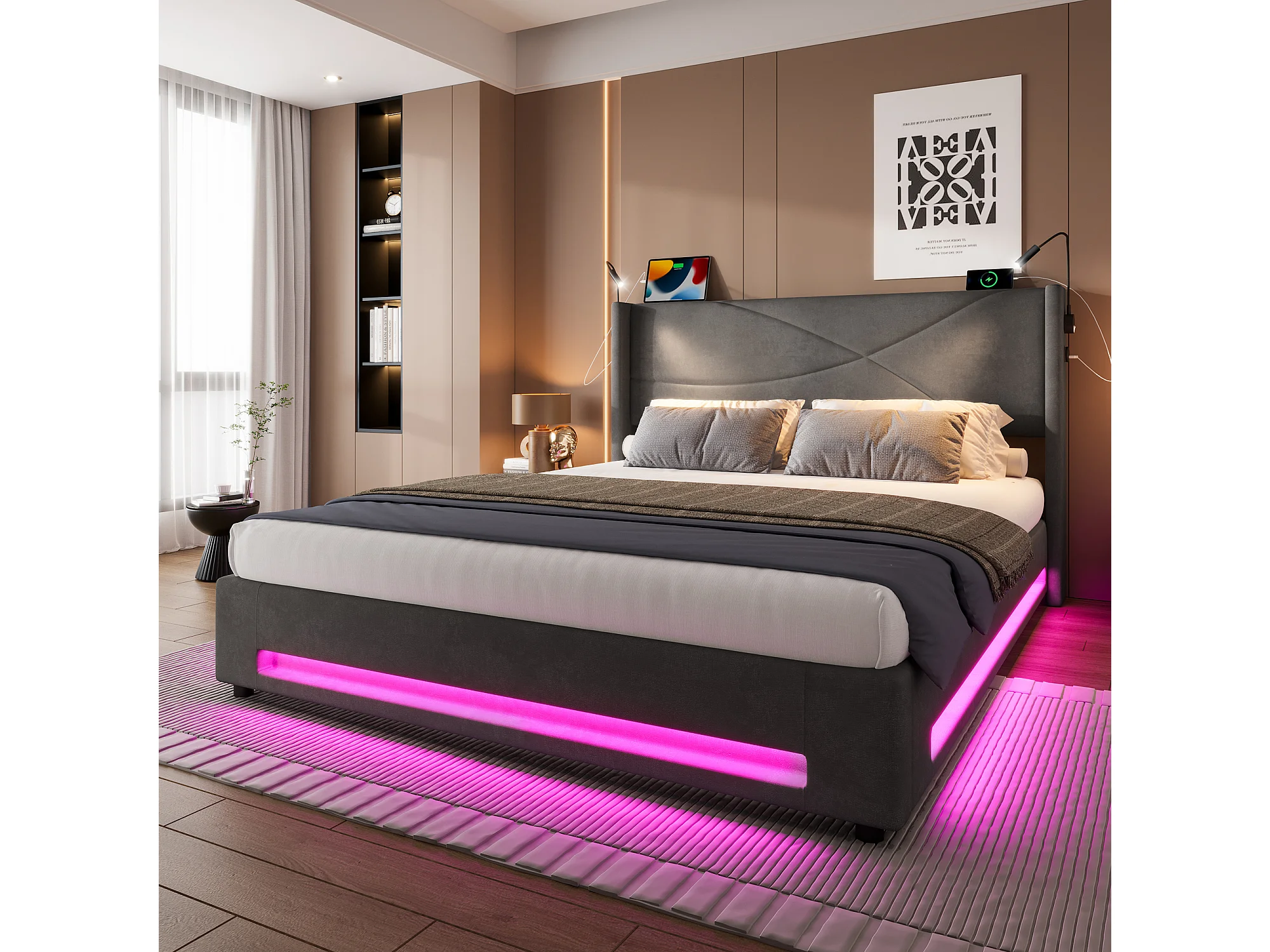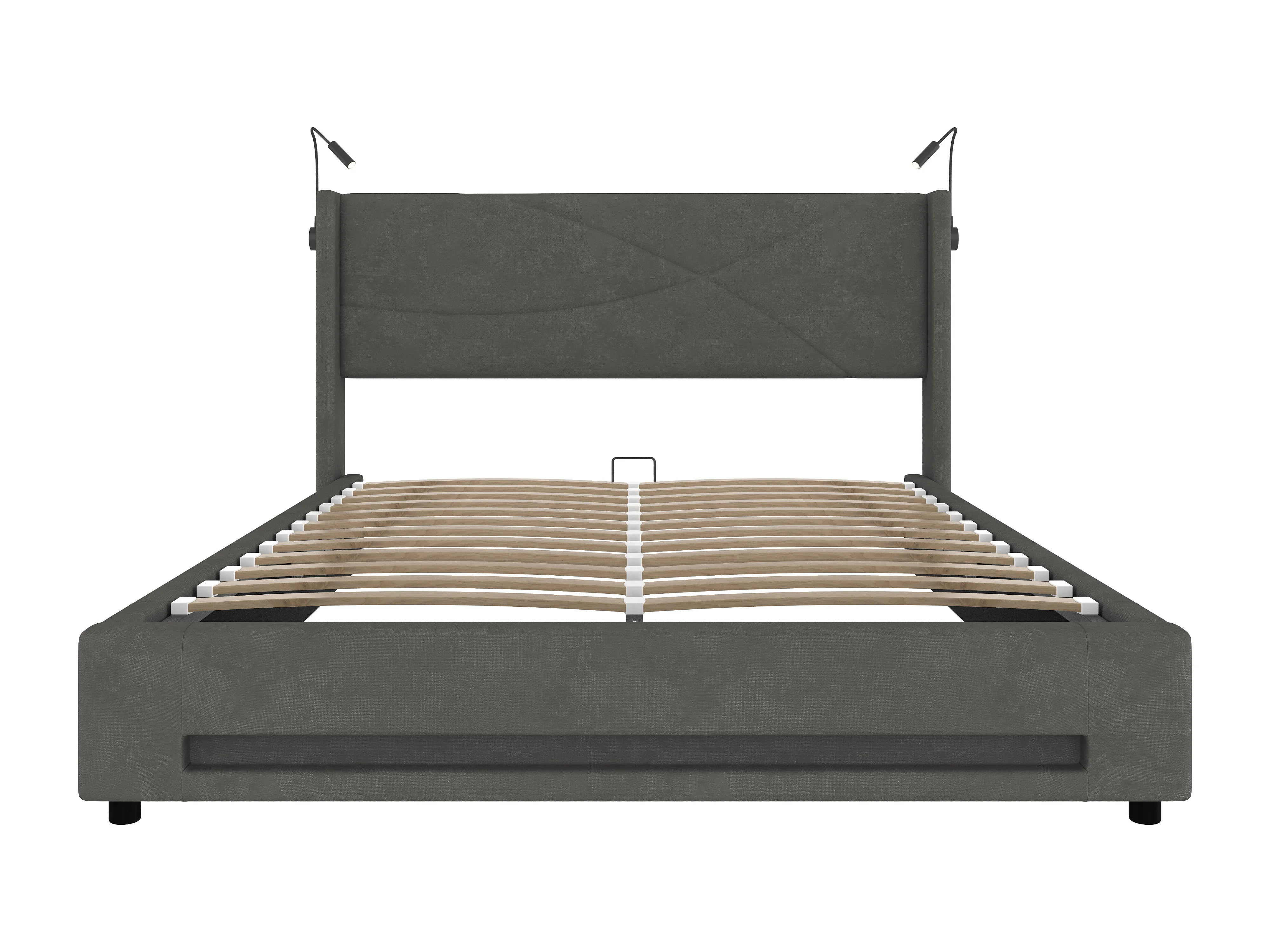 Lit coffre adulte 140x200cm gris en velours avec 2 lampe de lecture + LED + USB, Sommier à lattes, sans matelas