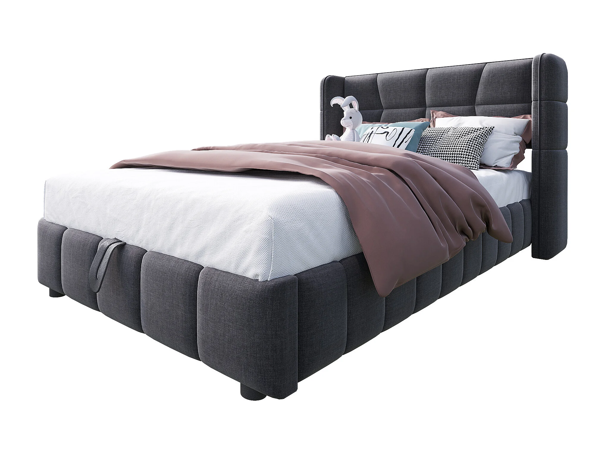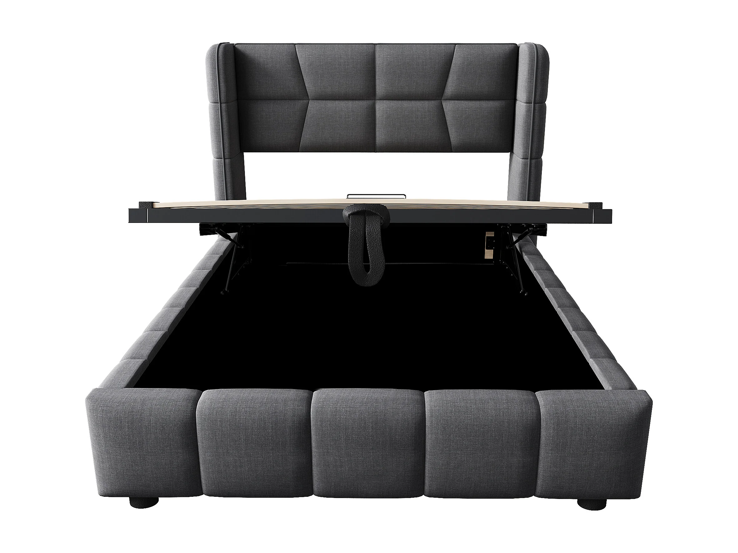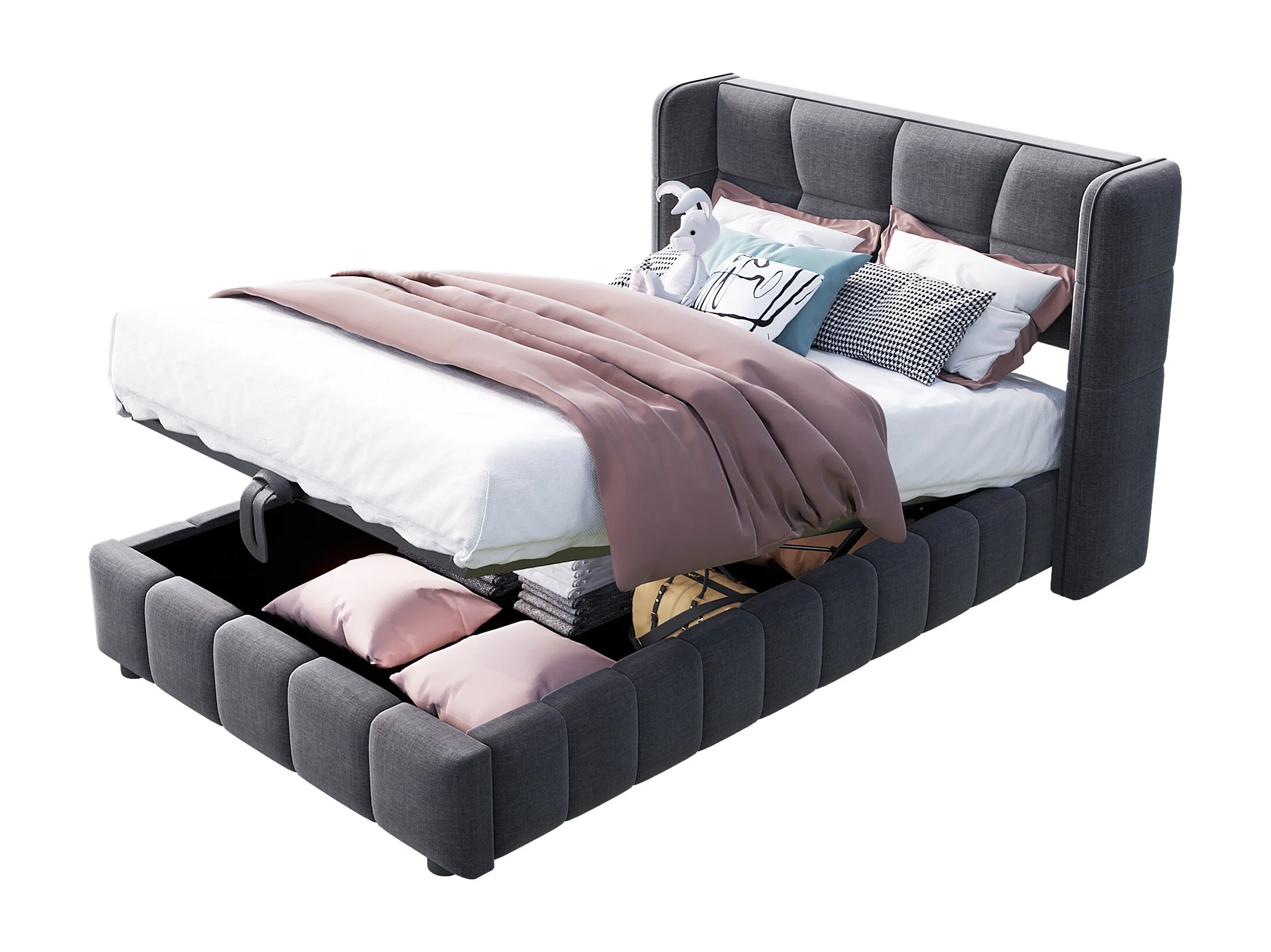 Lit enfant 90x200 cm avec tête de lit, mécanisme de levage rangements intégrés, structure en tissu, gris (Sans matelas)