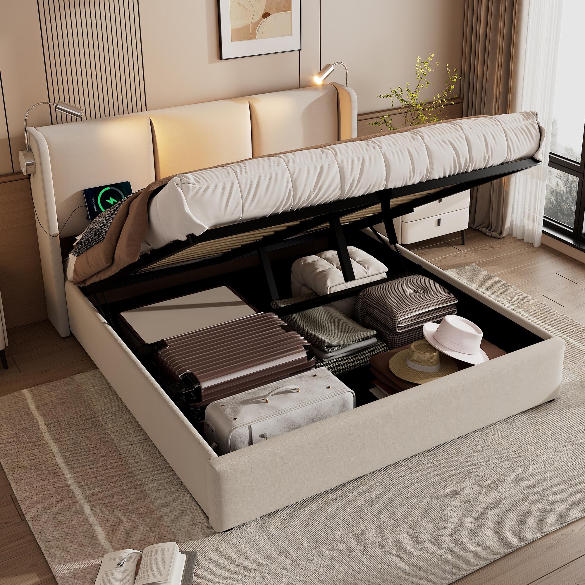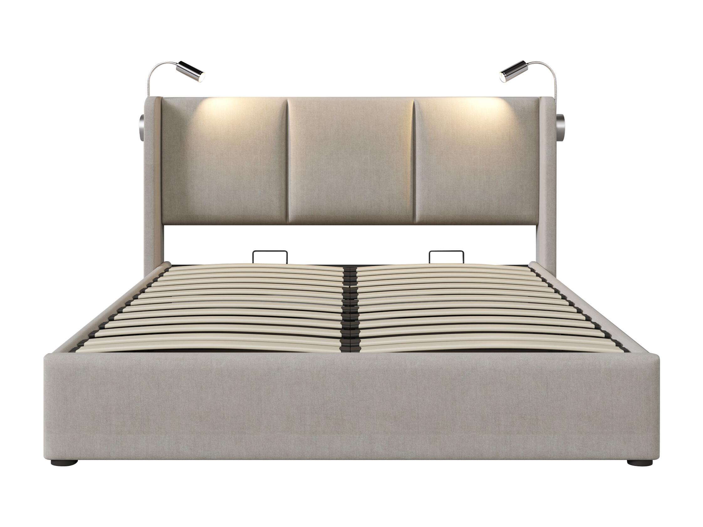 Lit coffre adulte 160x200 cm avec sommier - tête de lit avec USB et lumière de lecture - lin beige (sans matelas)