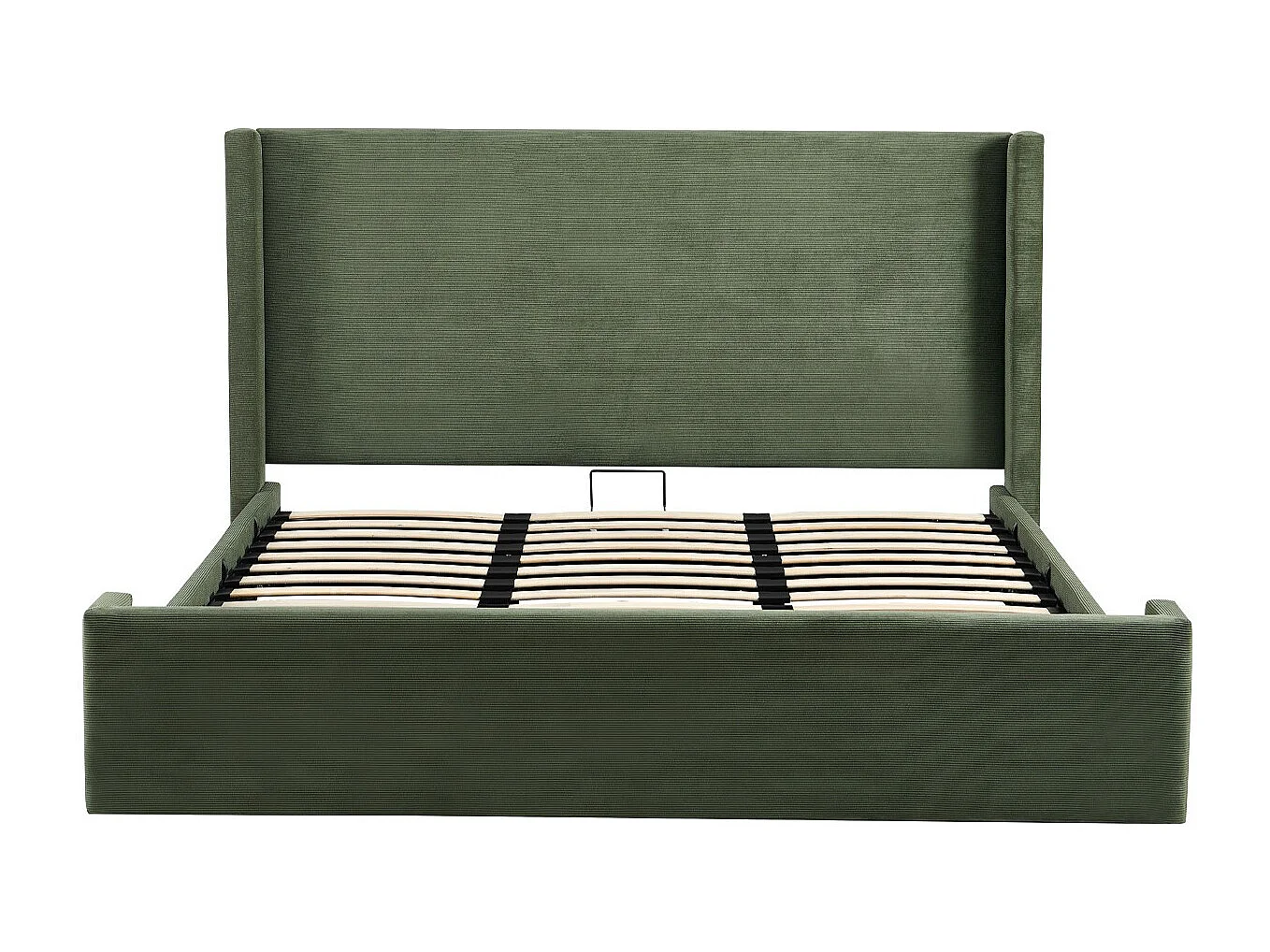 Lit coffre adulte 160x200 cm avec tête de lit capitonnée en velours côtelé vert kaki - Elma
