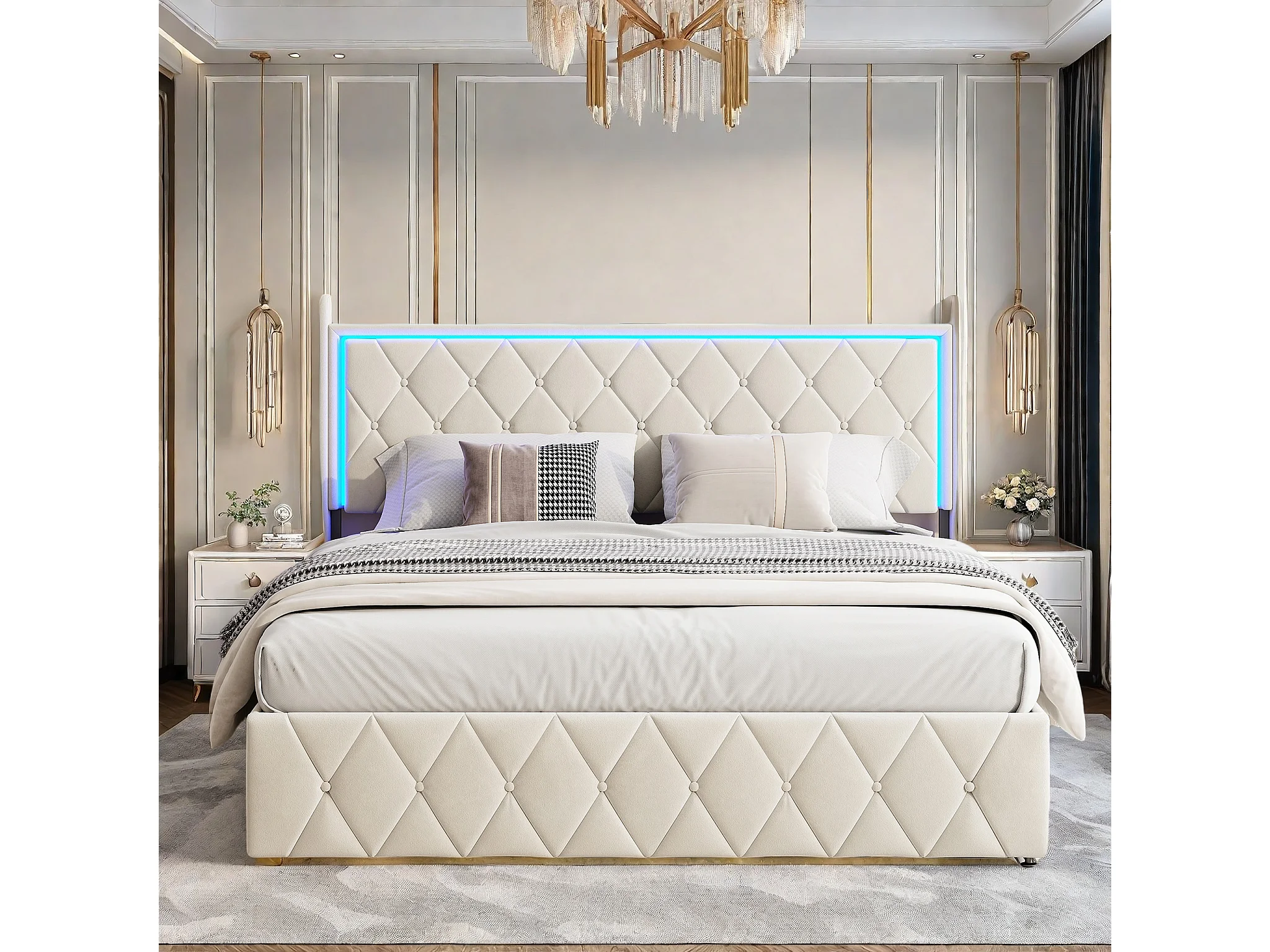 Lit Coffre Adulte 160x200 cm Capitonné en Velours Lit Double avec LED Espace de Rangement Sommier Lit Adulte