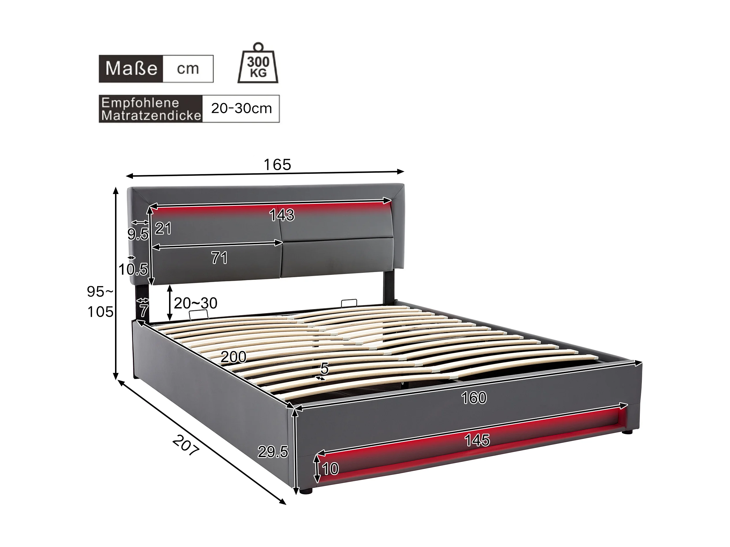 Lit coffre adulte 160x200 cm gris en pu avec port USB + LED, Sommier à lattes, sans matelas