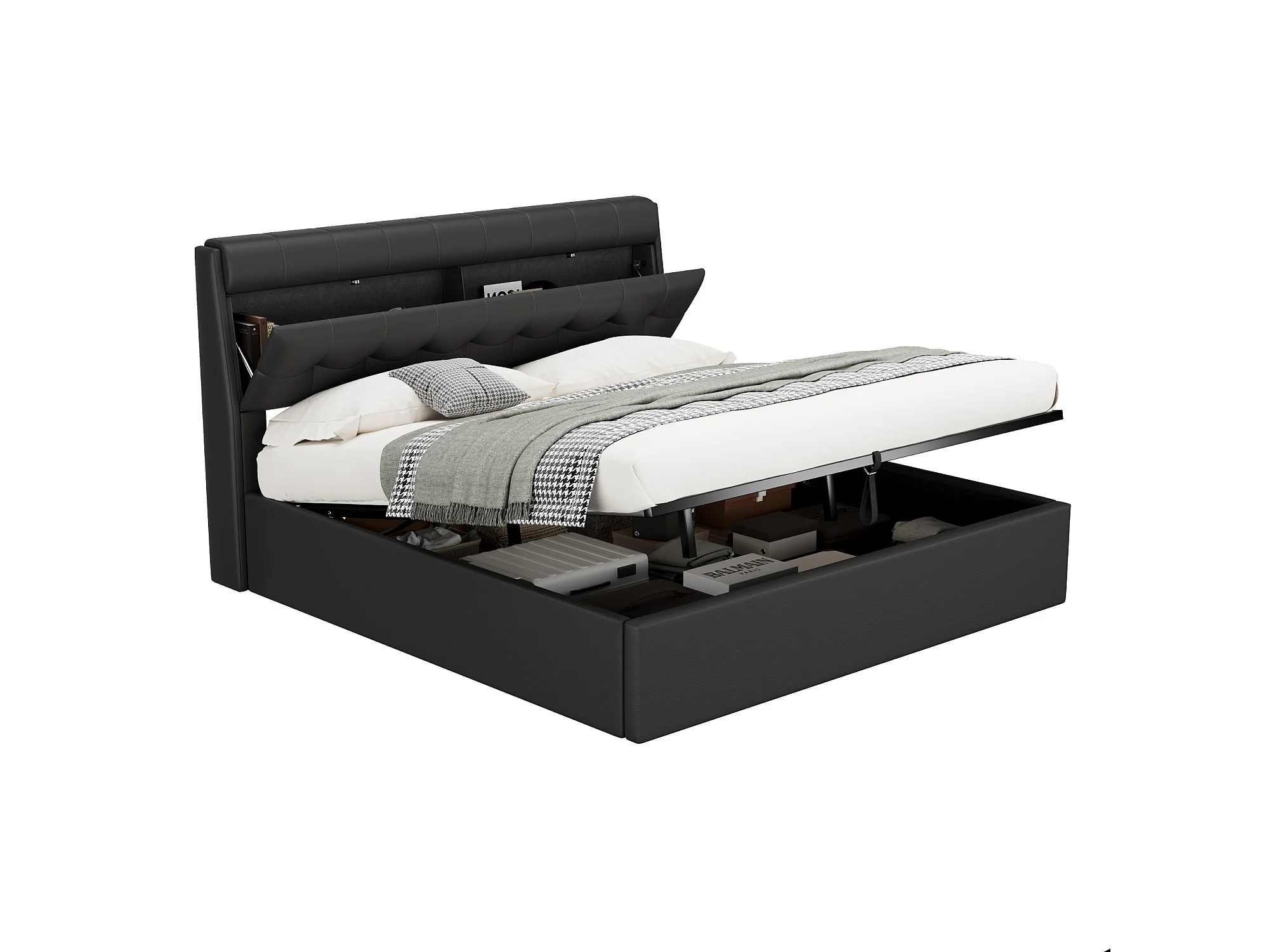 Lit coffre 180x200 cm avec sommier à lattes - tête de lit avec rangement - similicuir - noir (sans matelas)