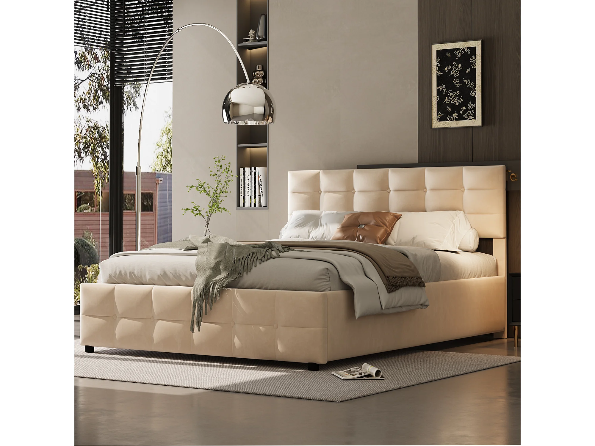 Lit coffre adulte 180x200cm, tissu velours hollandais, sommier à lattes, sans matelas, beige