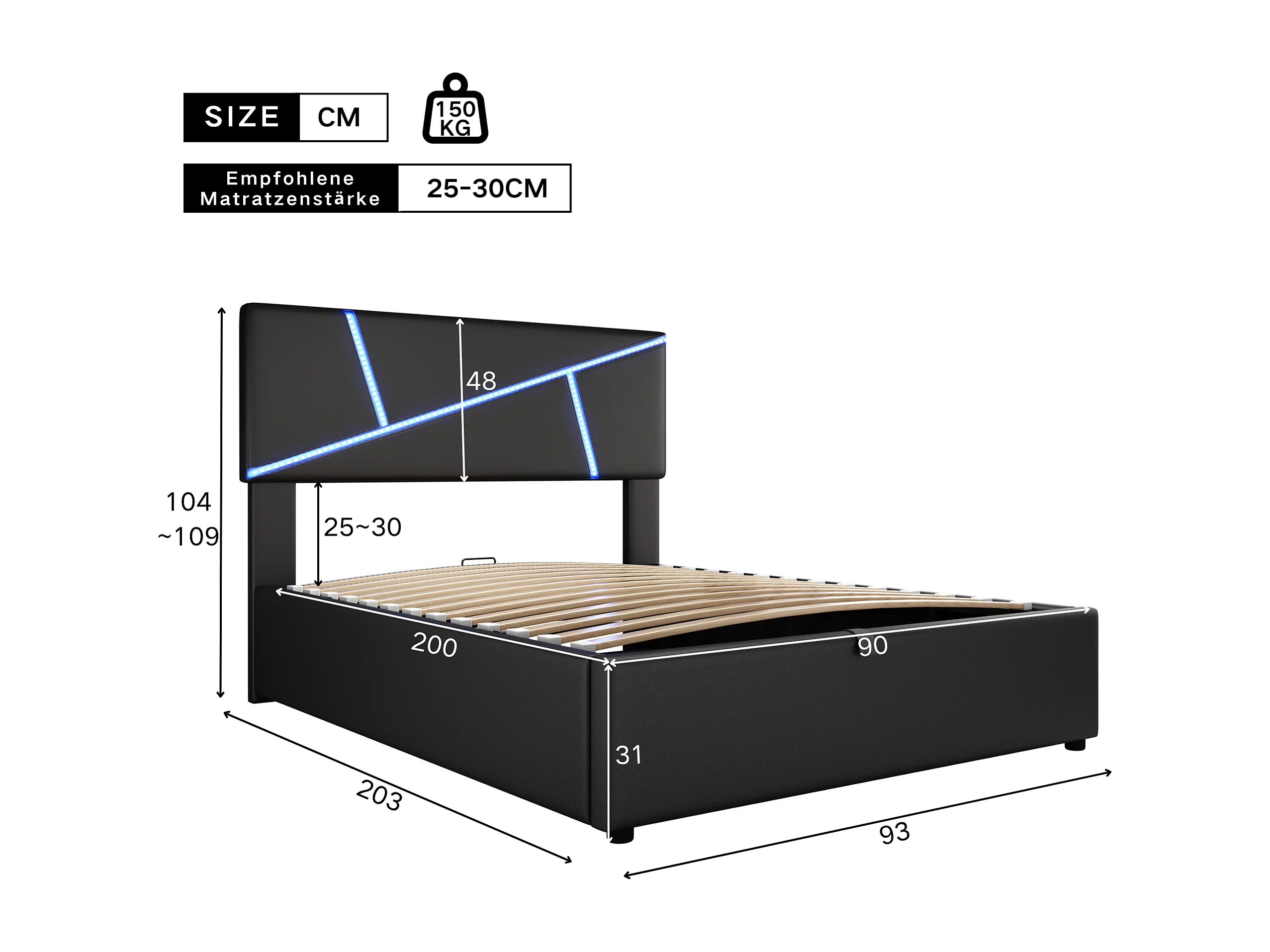 Lit coffre adulte 90x200cm in simili cuir avec LED, Sommier à lattes, sans matelas, noir