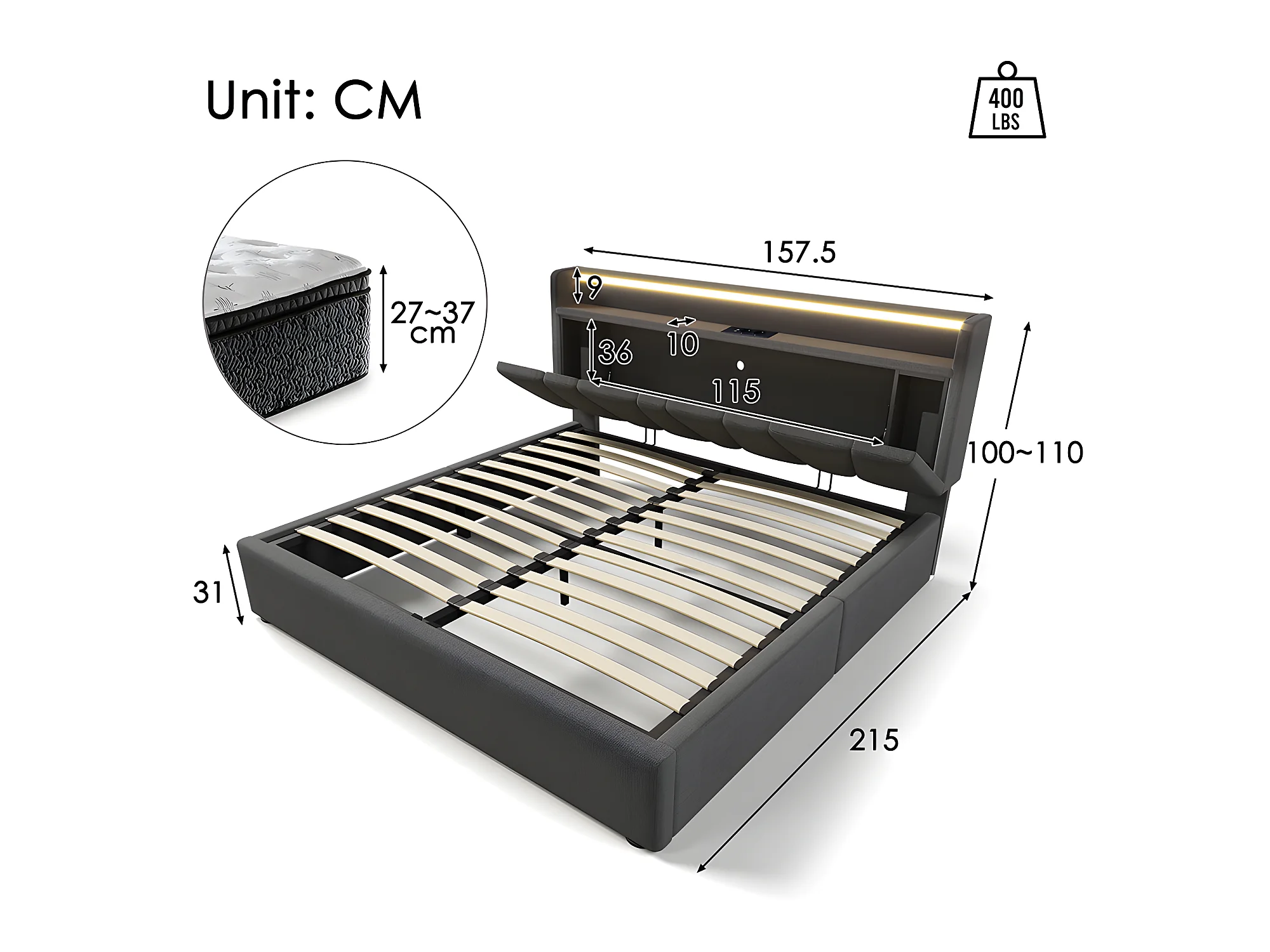 Lit coffre adulte capitonnée - 140 x 200 cm station de charge USB - chevets intégrés avec LED - Gris - Sweiko