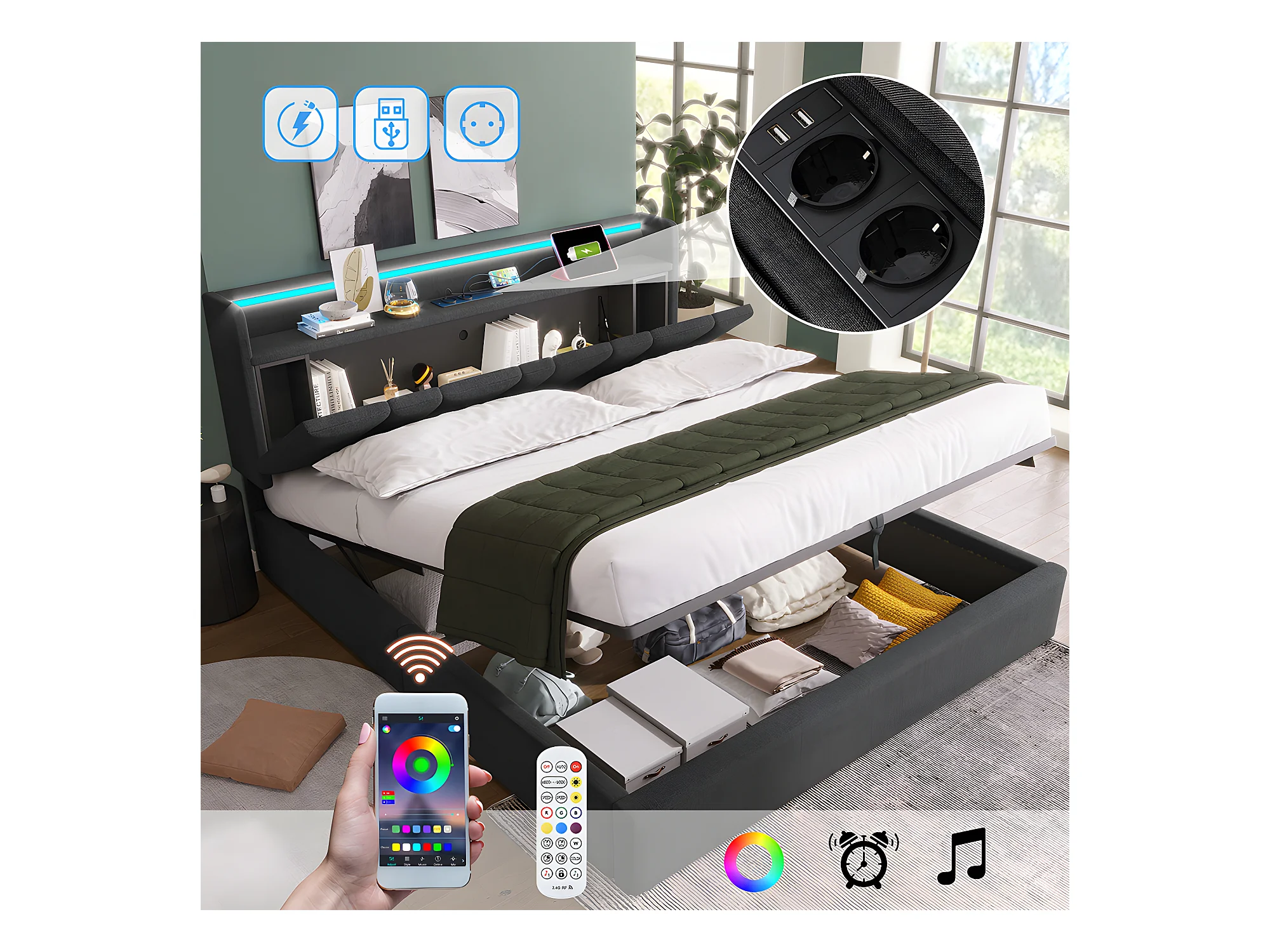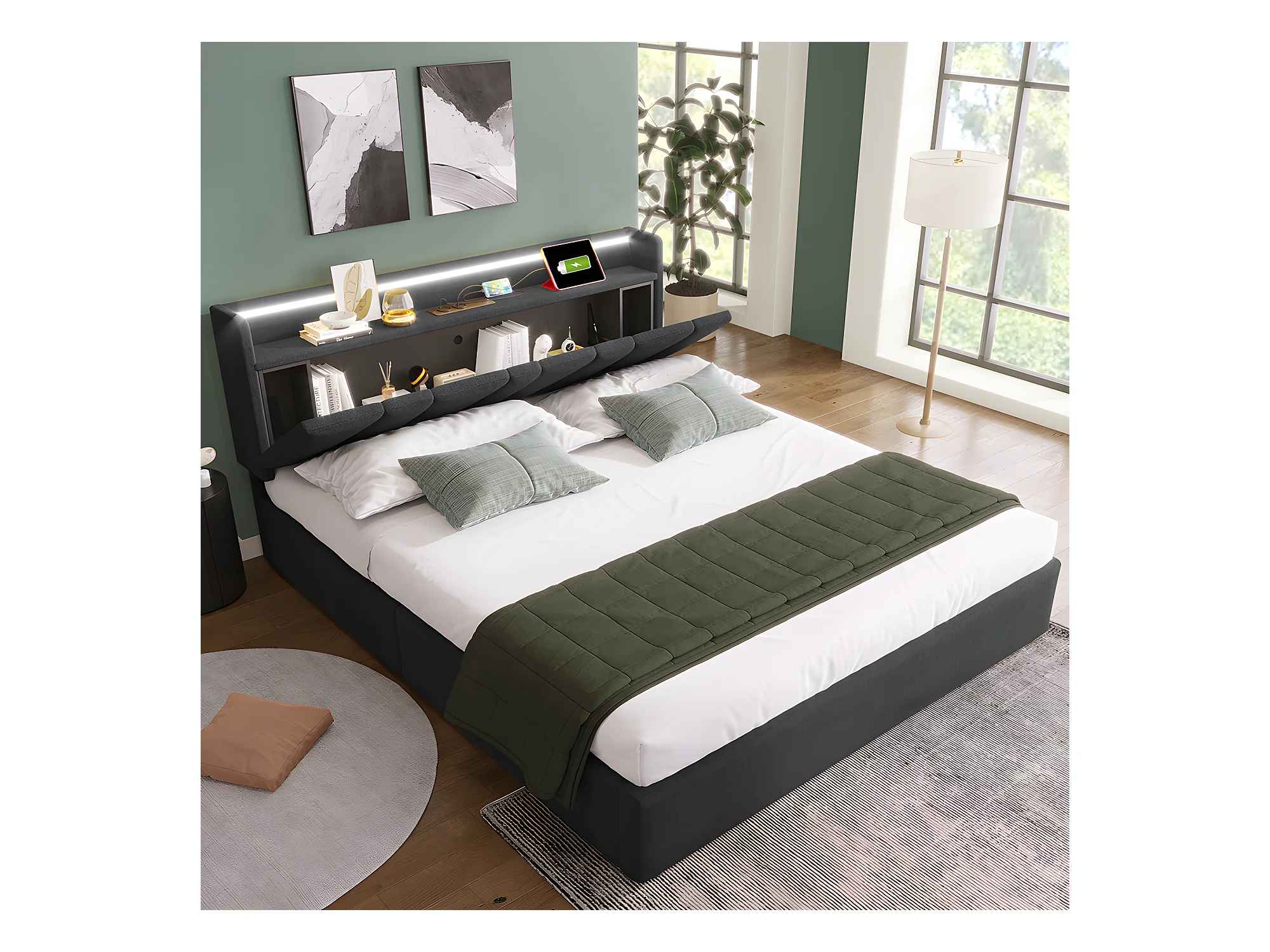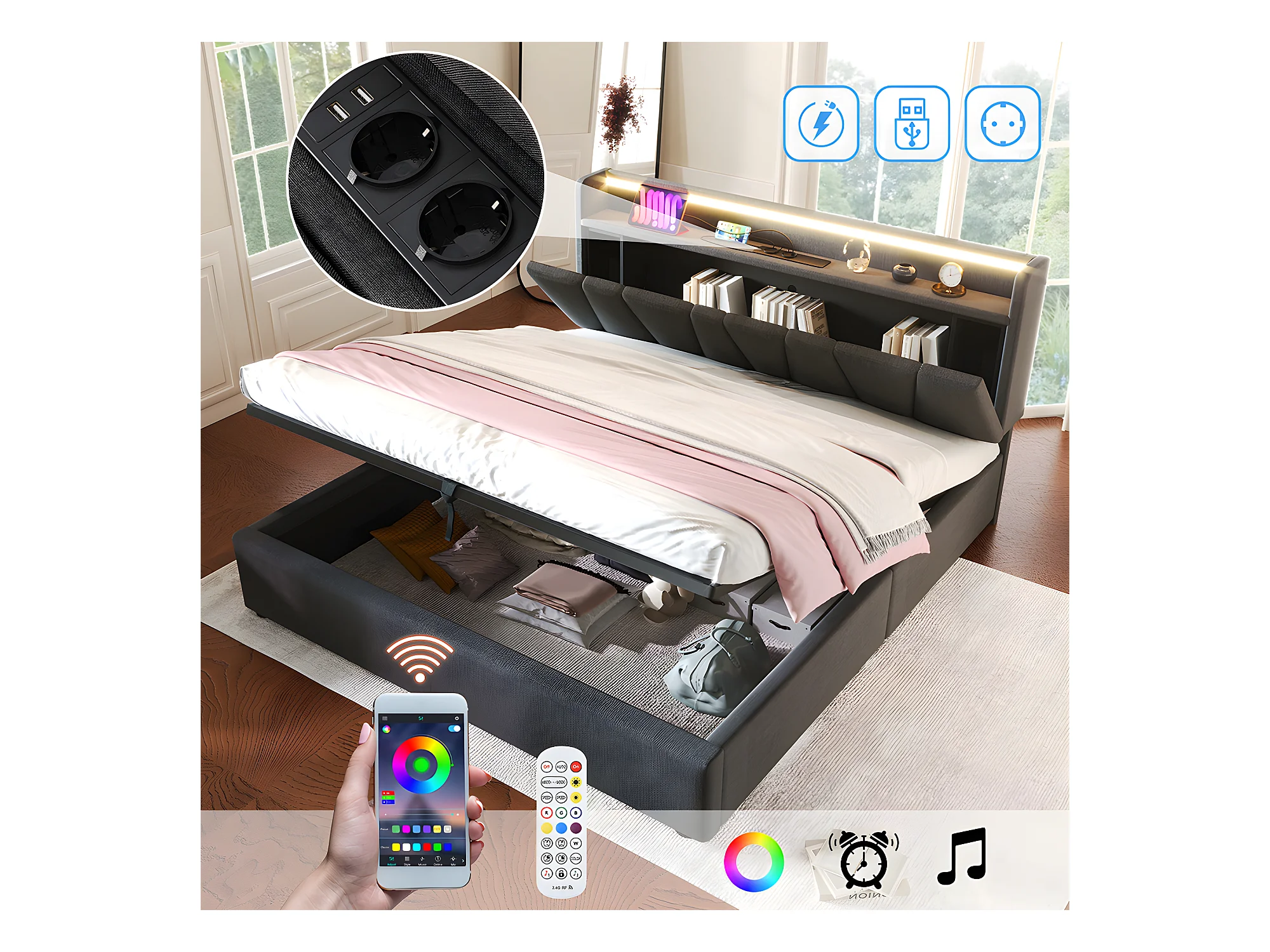 Lit coffre adulte capitonnée - 140 x 200 cm station de charge USB - chevets intégrés avec LED - Gris - Sweiko