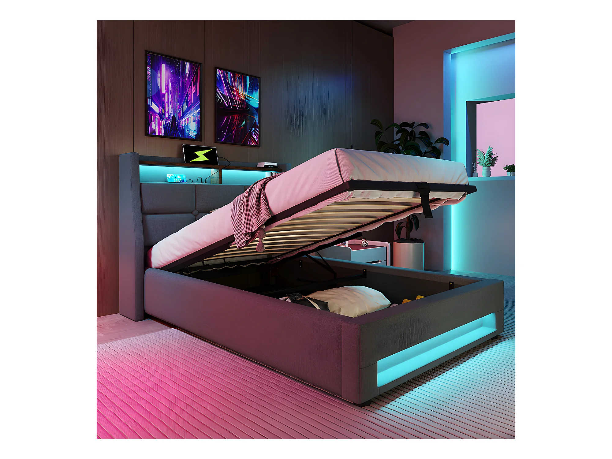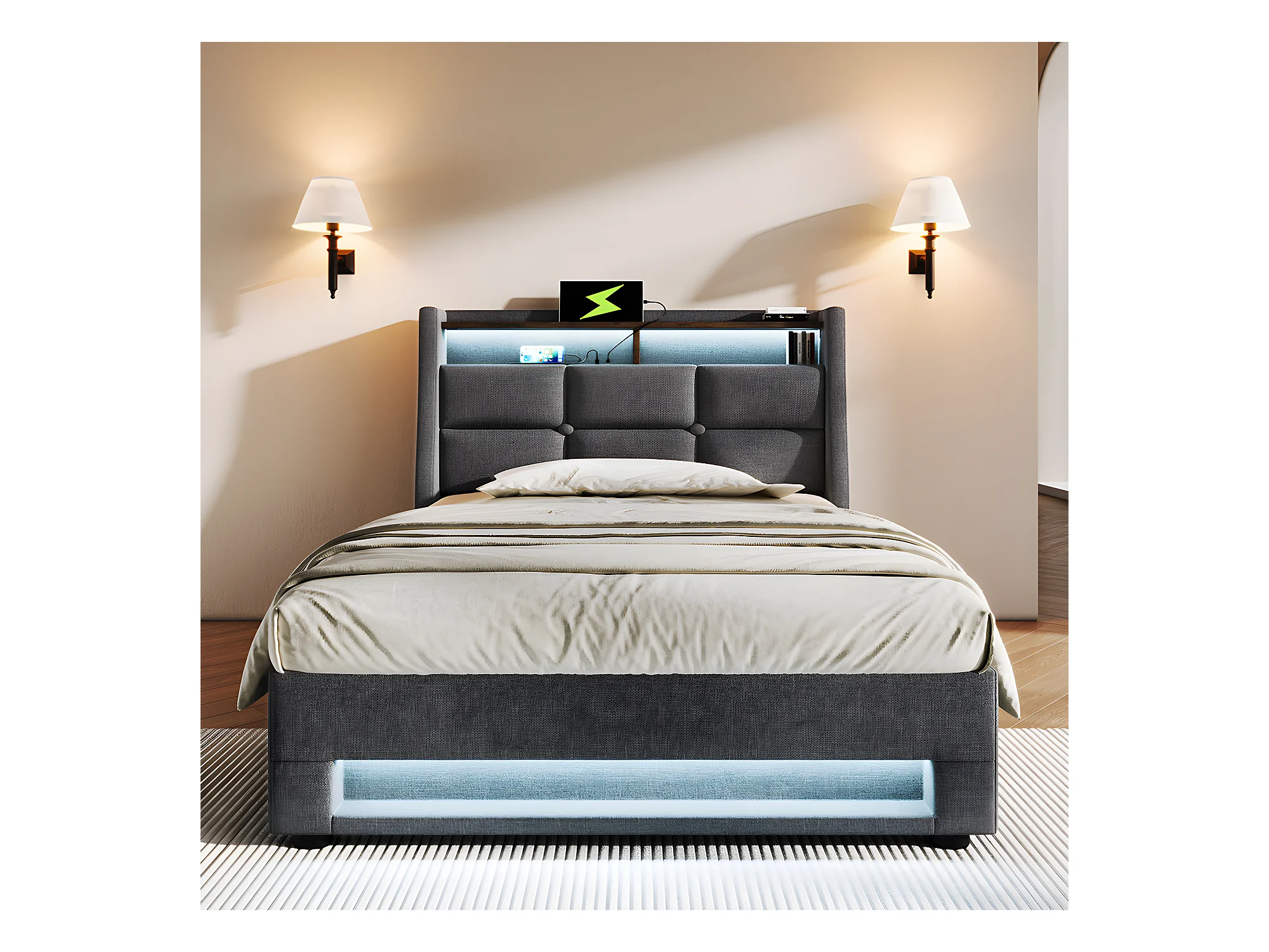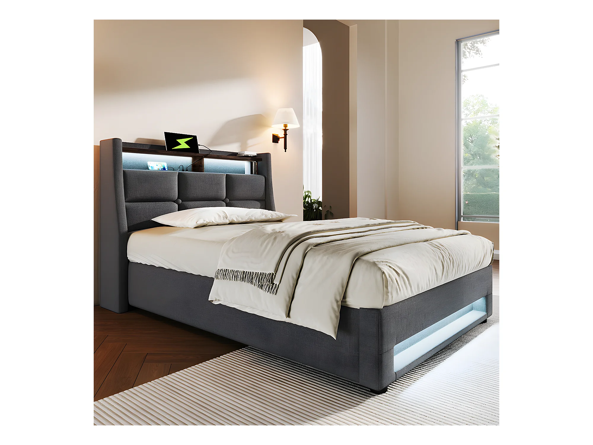 Lit coffre avec chargeur USB et LED - 160 x 200 cm - Beige - Sweiko