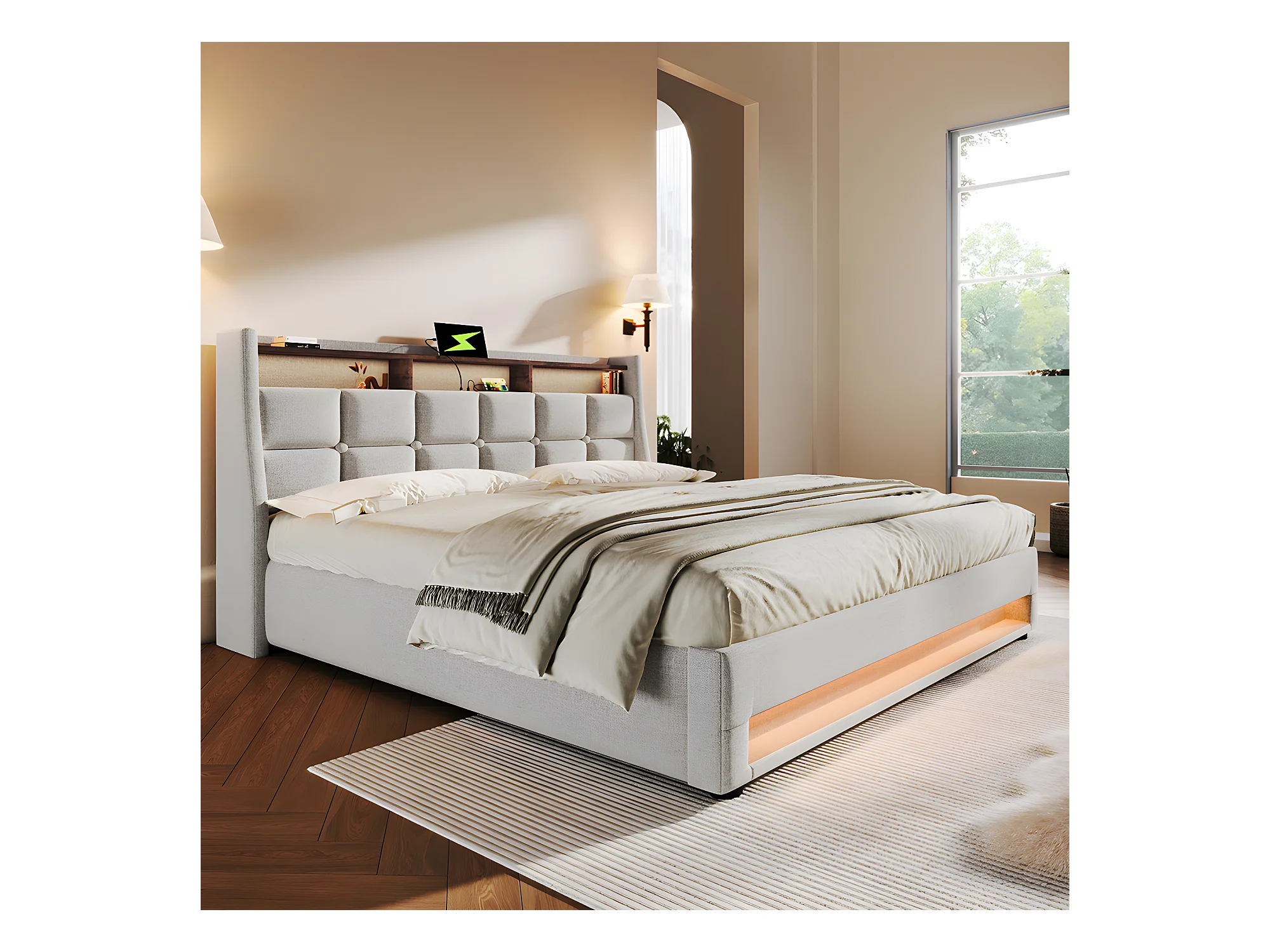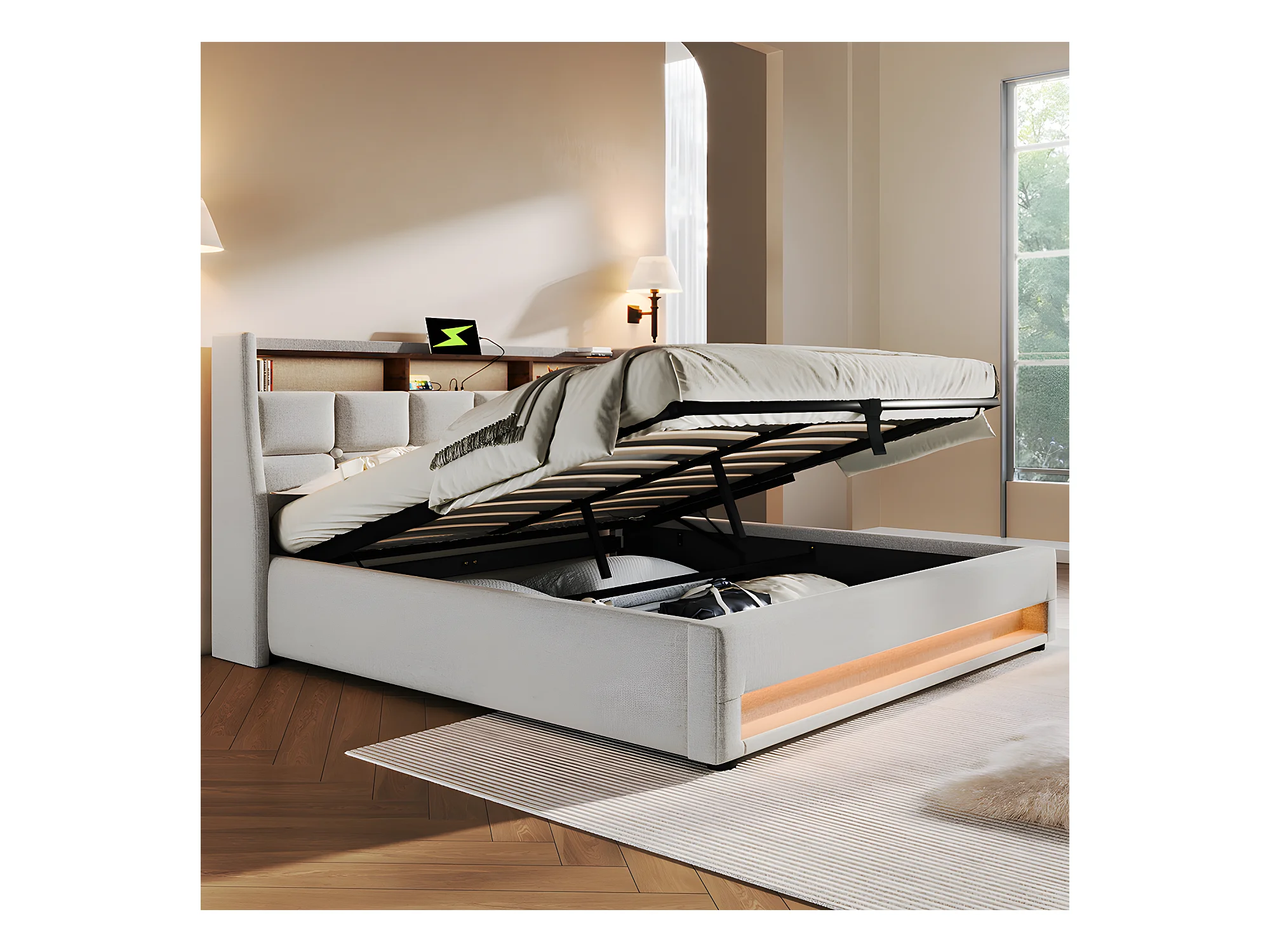 Lit coffre avec chargeur USB et LED - 180 x 200 cm - Beige - Sweiko