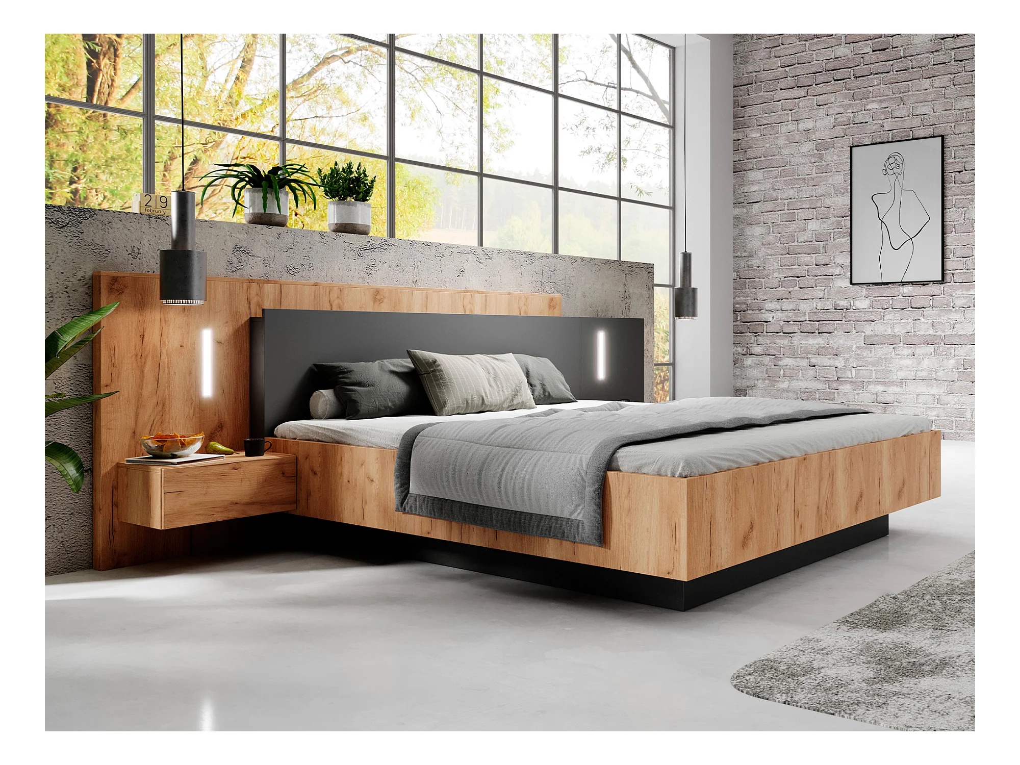 Lit coffre avec chevets 160 x 200 cm - 2 tiroirs - Avec LEDs - Coloris : Naturel et anthracite + Matelas - FRANCOLI