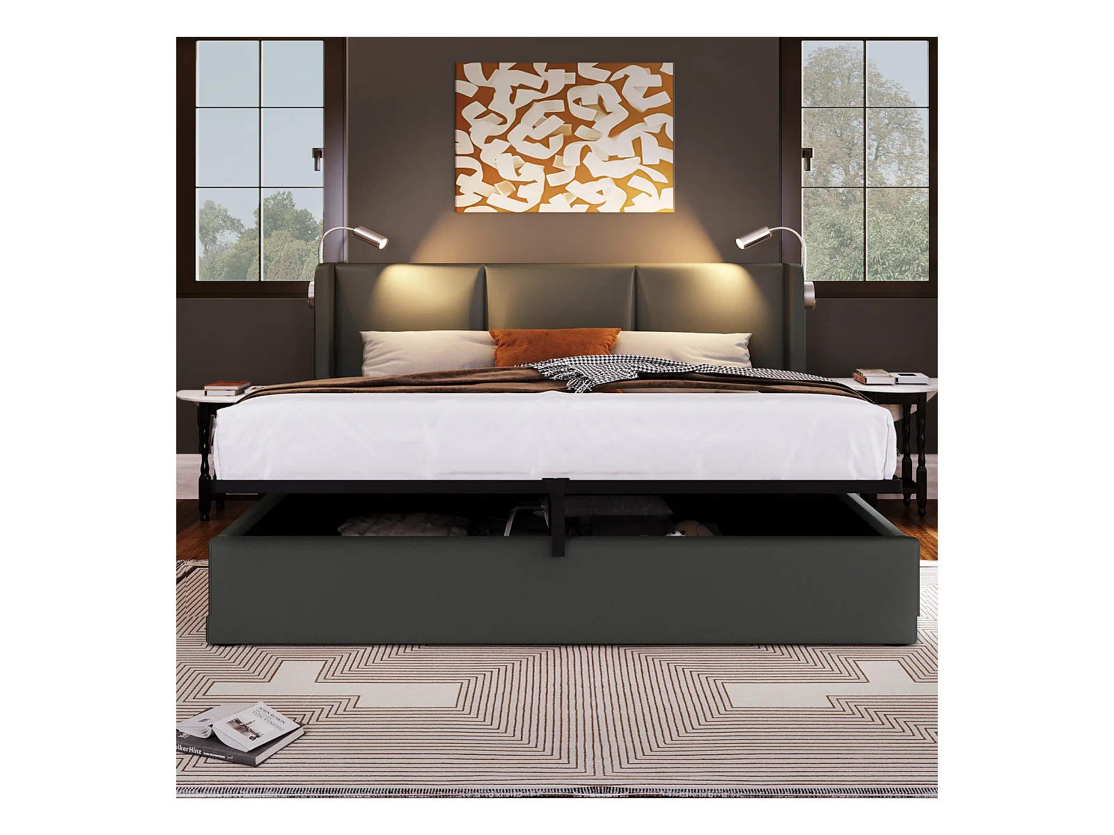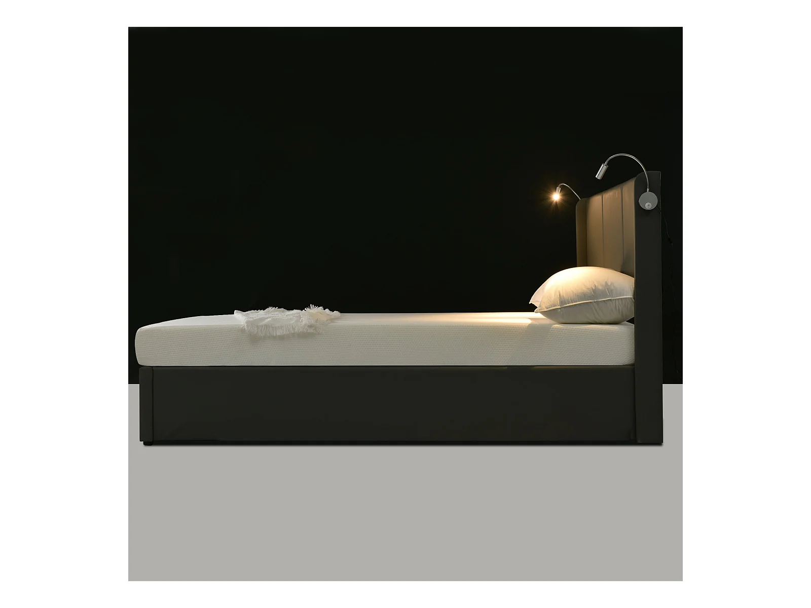 Lit Coffre avec Lampe et USB 160x200CM, avec Sommier à Lattes en Bois Chambres à Coucher, PU, Gris