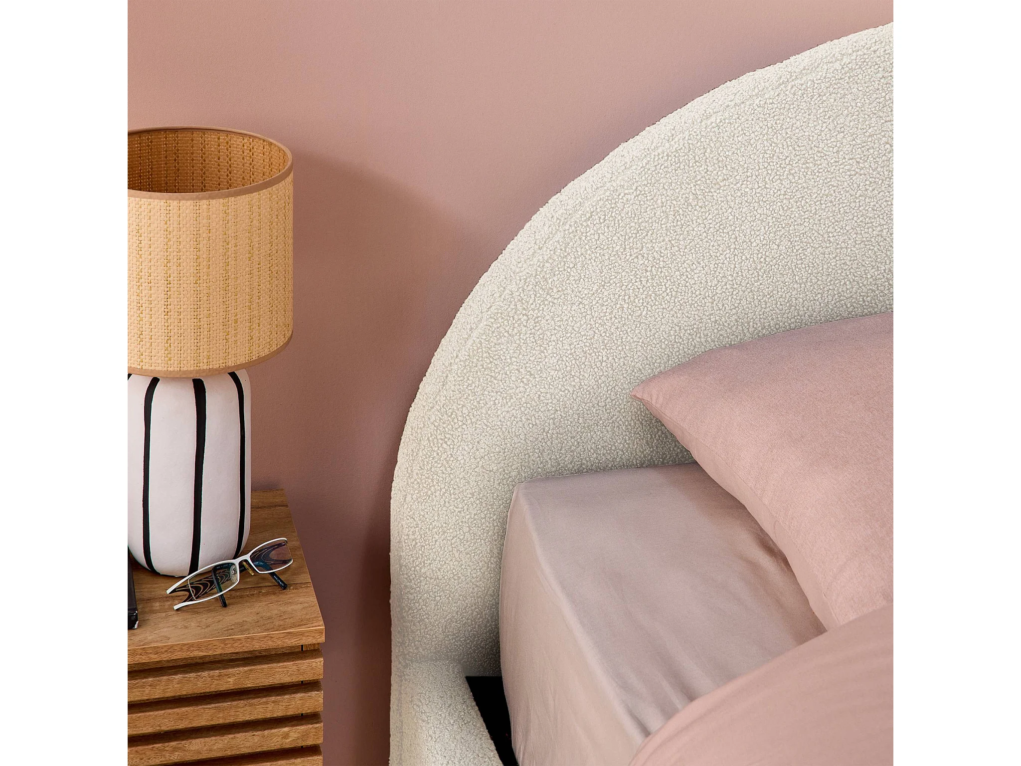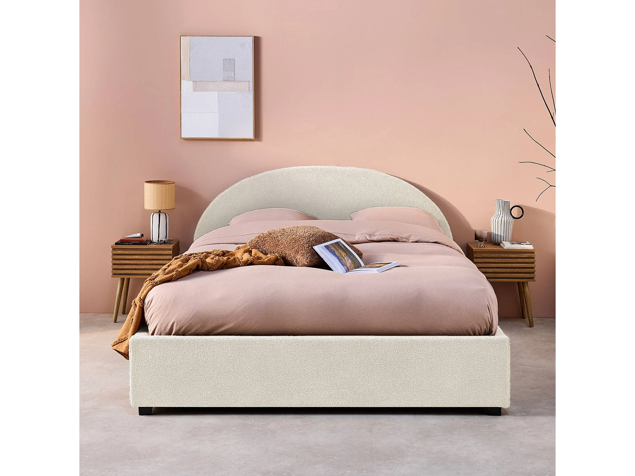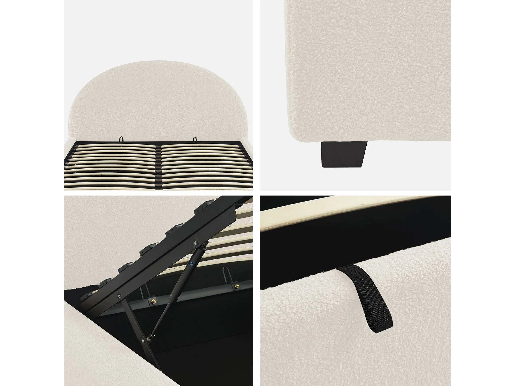 Lit coffre avec sommier à lattes et tête de lit. finition bouclette. blanc. L 206 x P 153.5 x H 102cm
