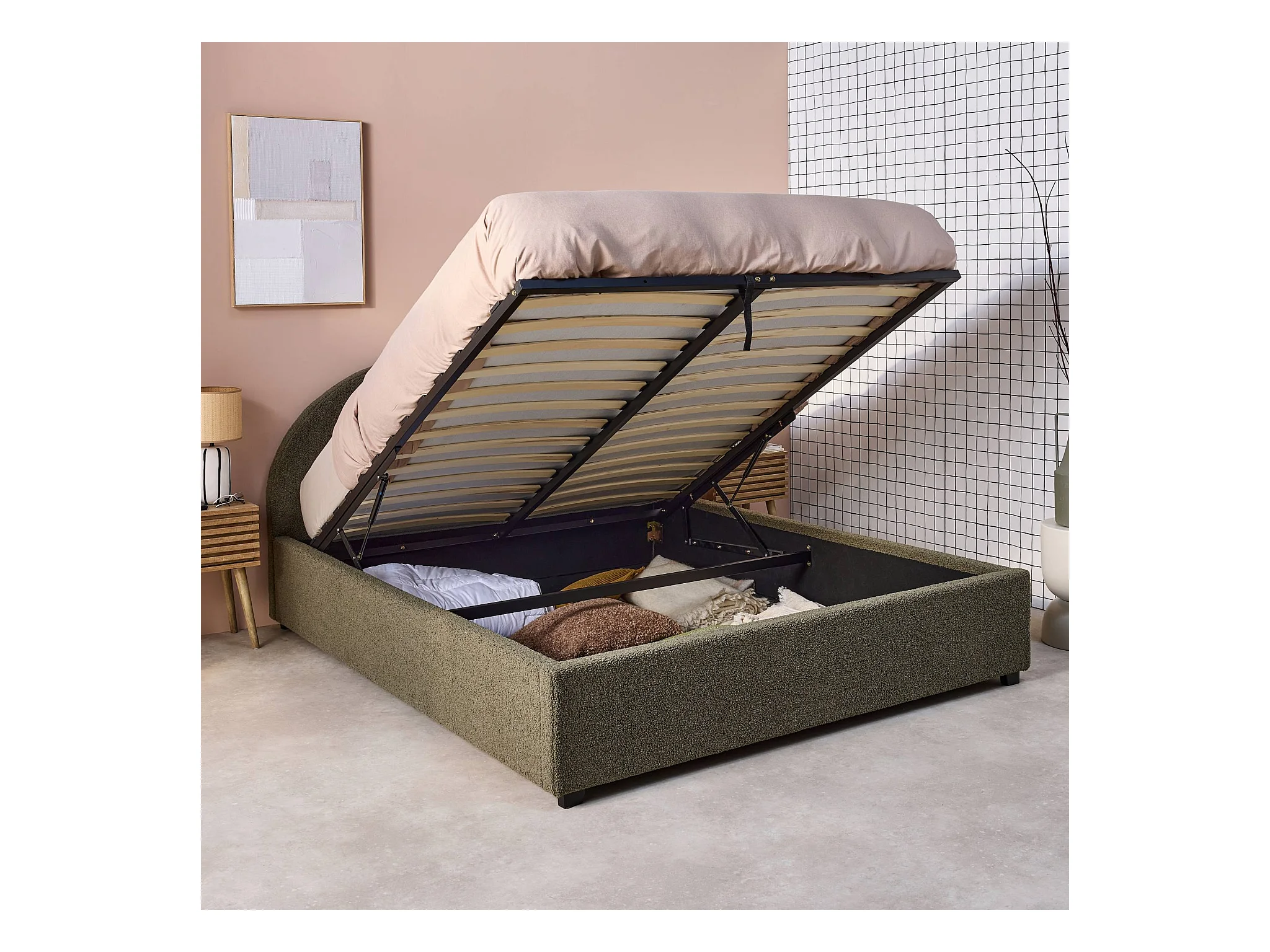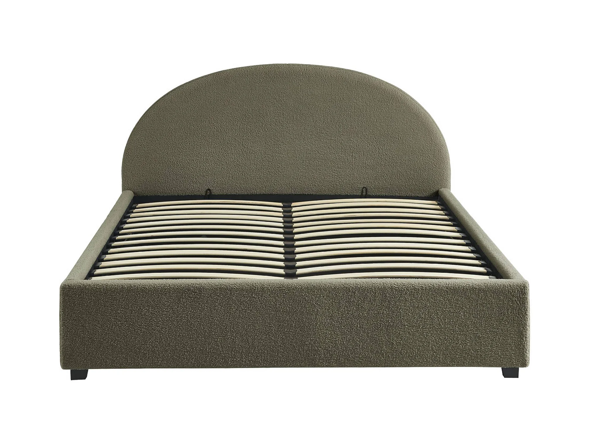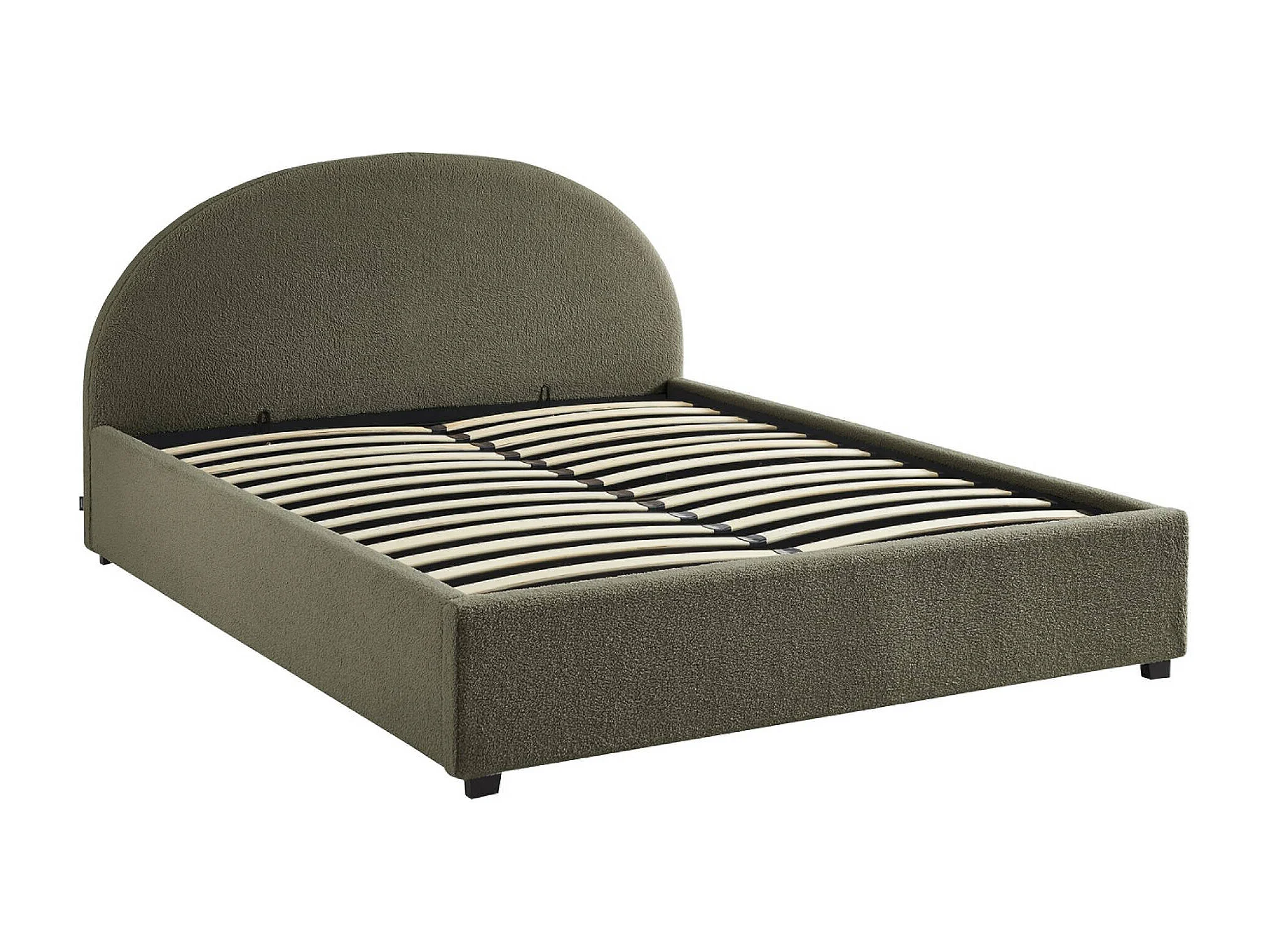 Lit coffre avec sommier à lattes et tête de lit. finition bouclette. kaki. L216.5 x P174 x H102cm