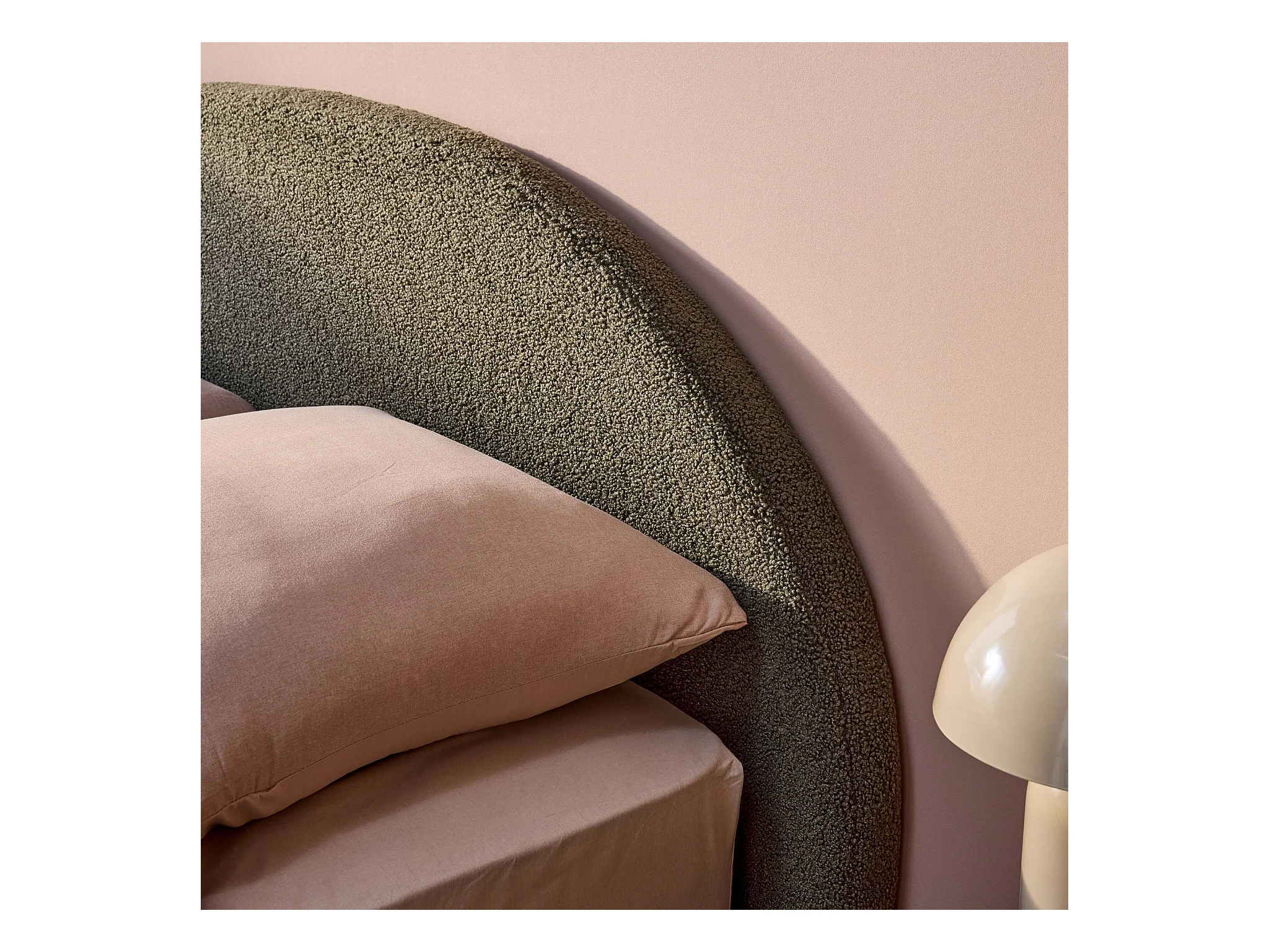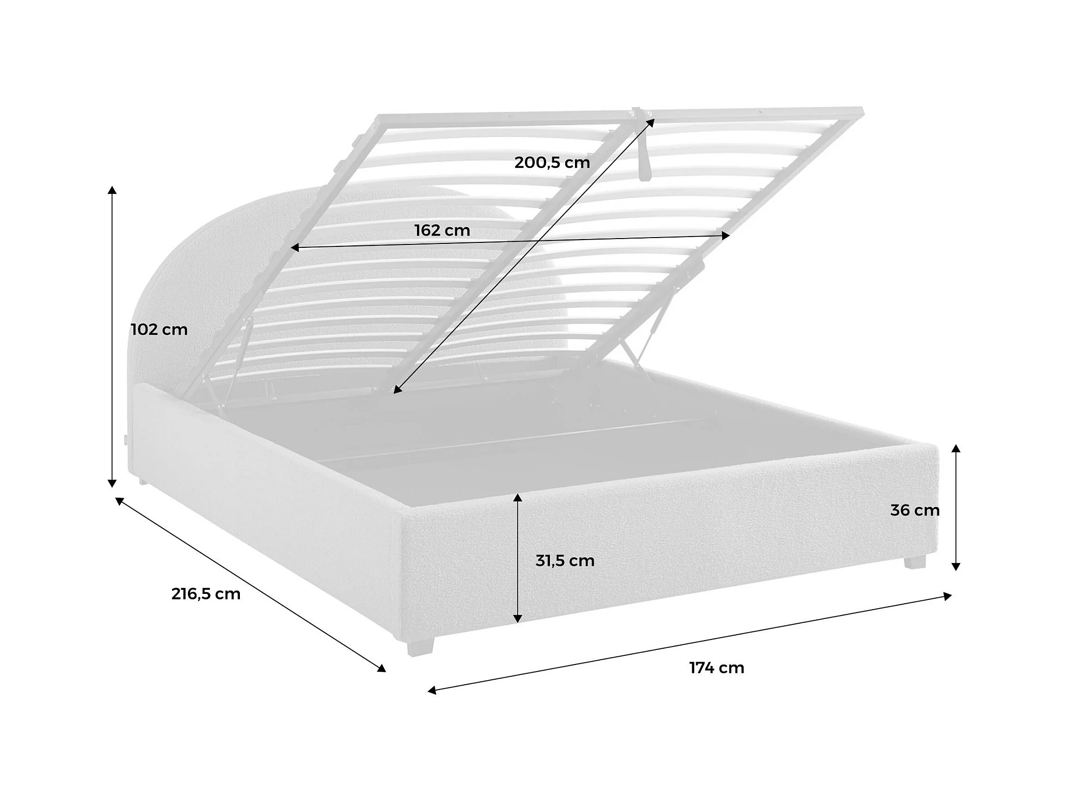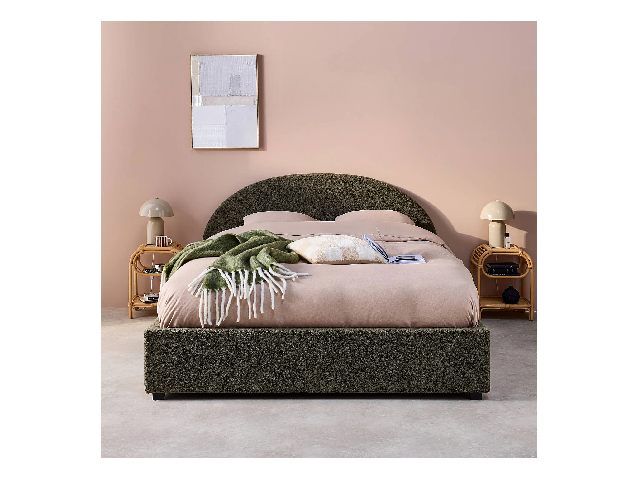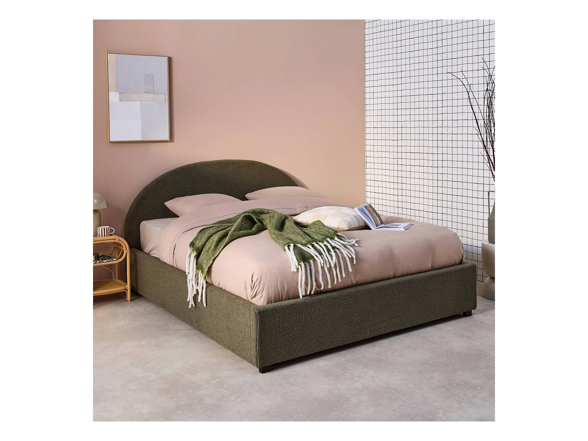 Lit coffre avec sommier à lattes et tête de lit. finition bouclette. kaki. L216.5 x P174 x H102cm