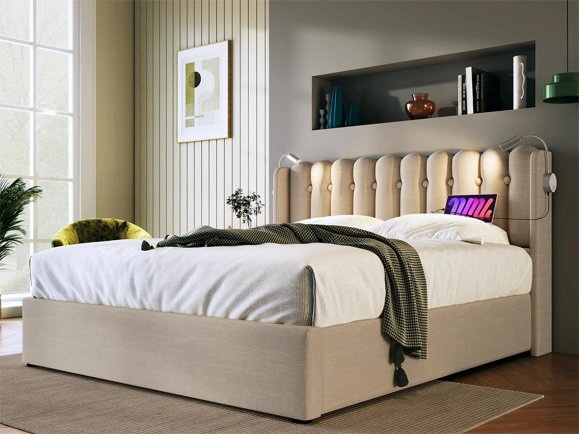 Lit coffre avec tête de lit- 160 x 200 cm - lampe de lecture et prise USB - tissu en lin - coloris naturel