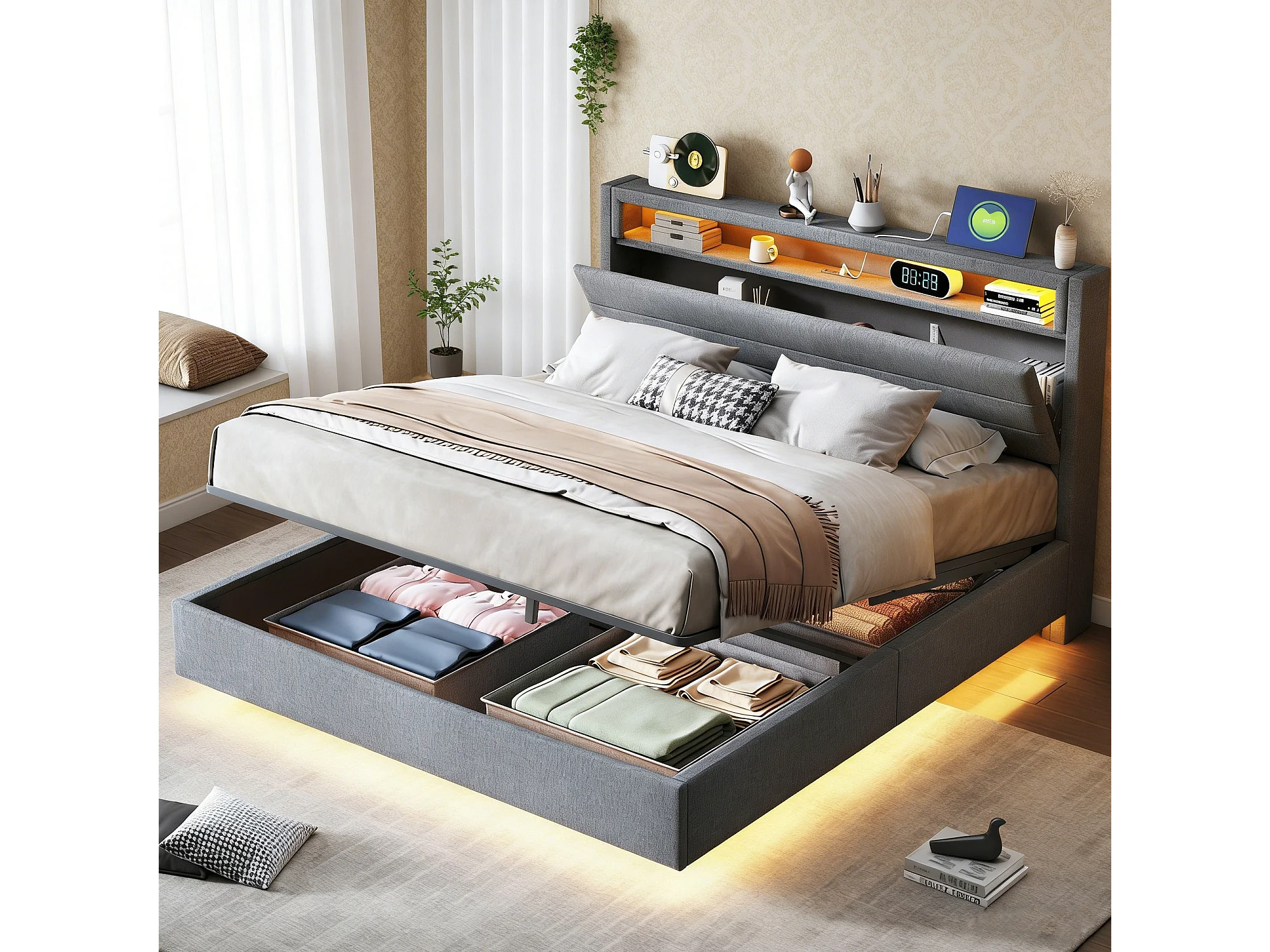 Lit coffre capitonné 140 x 200 cm, sommier à Lattes,rembourré tête de lit rangement, LED et USB, lit flottant 140x200 tissu lin, gris