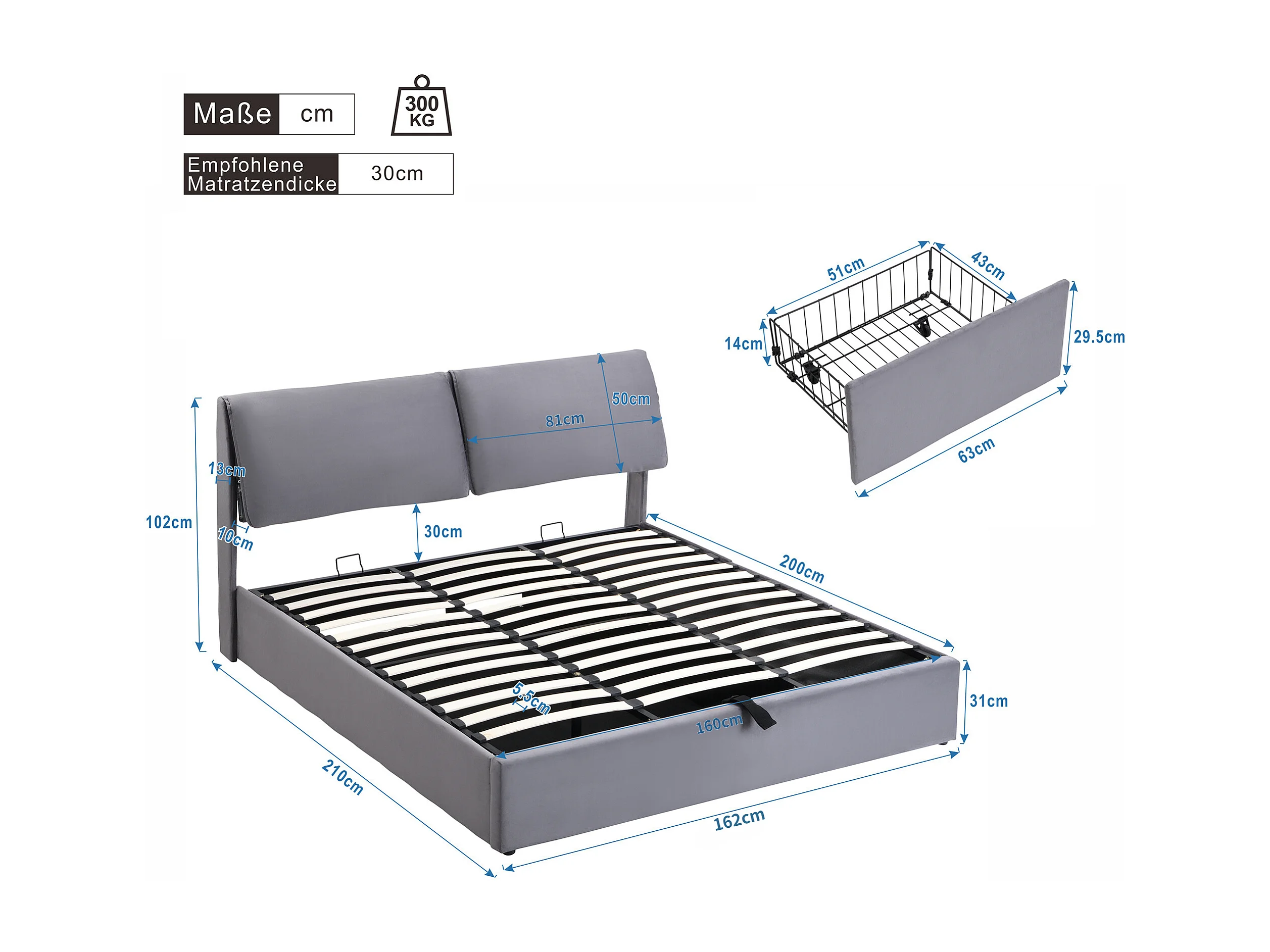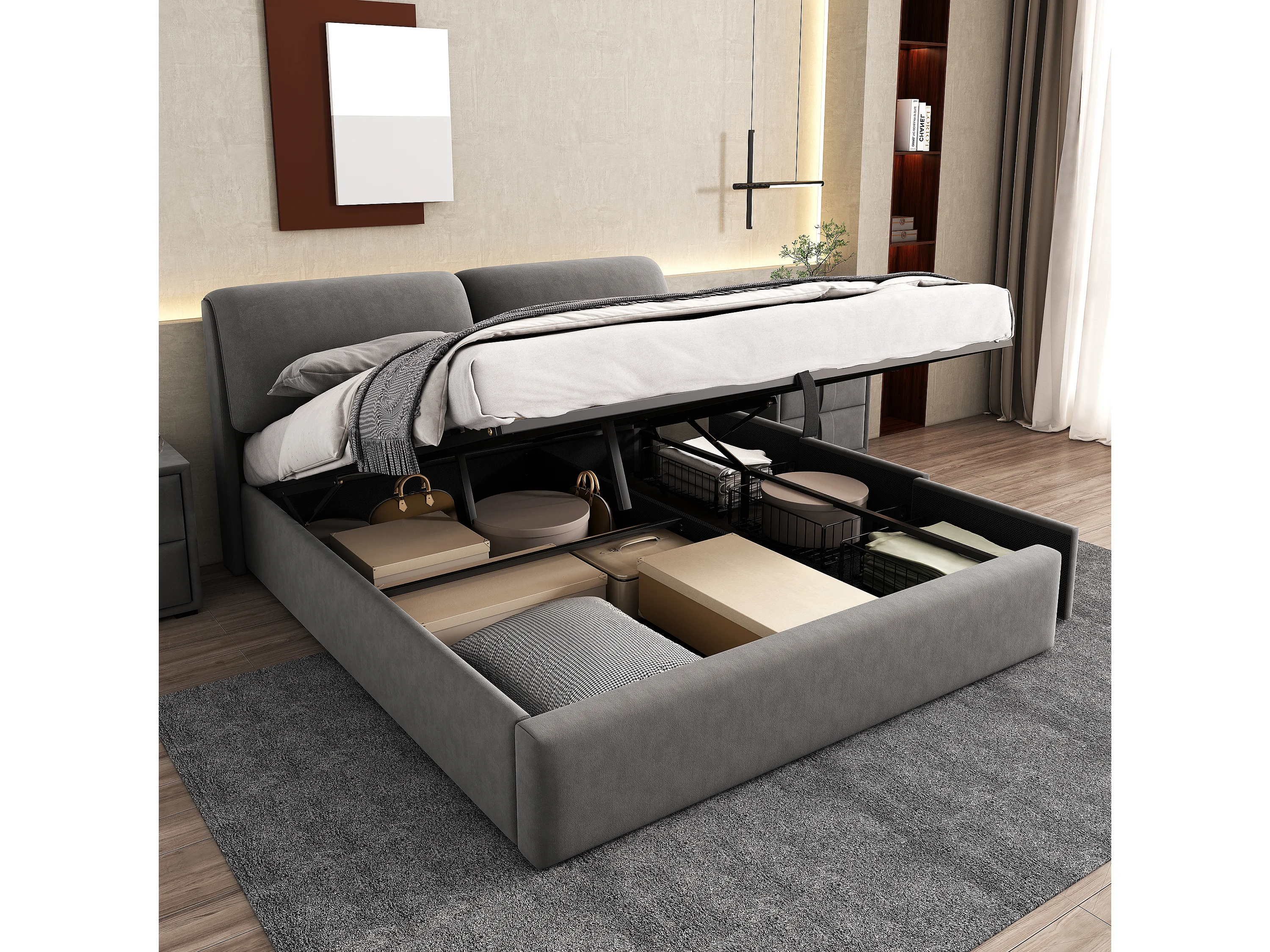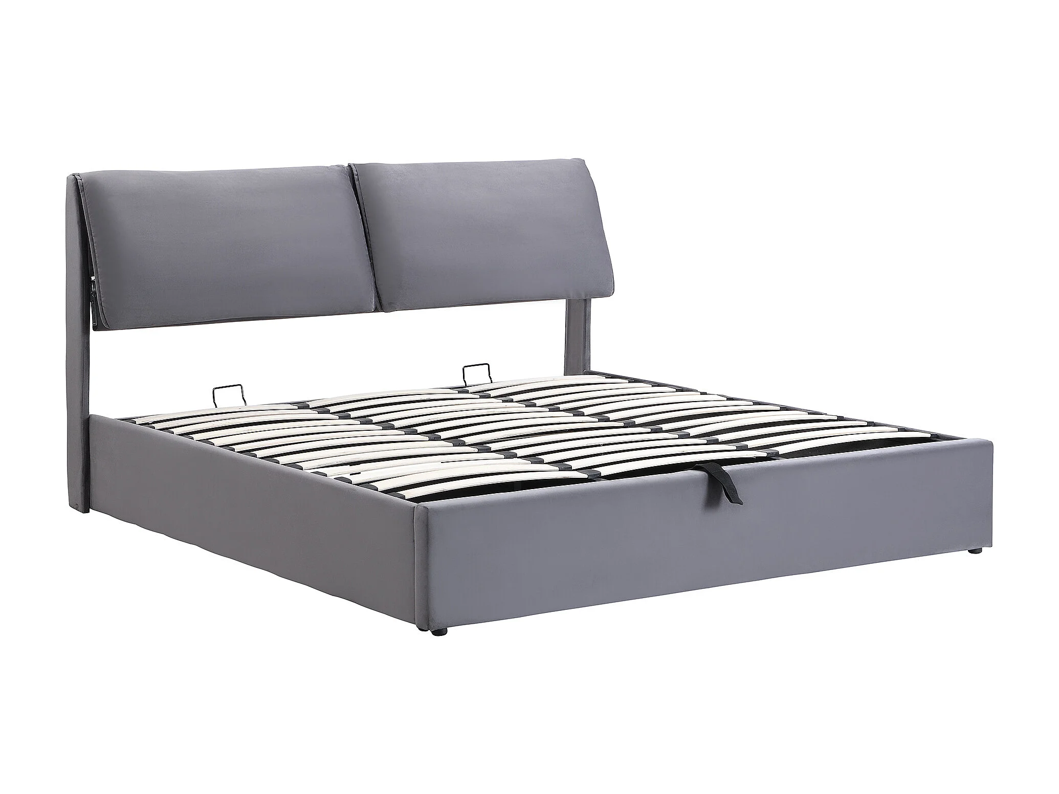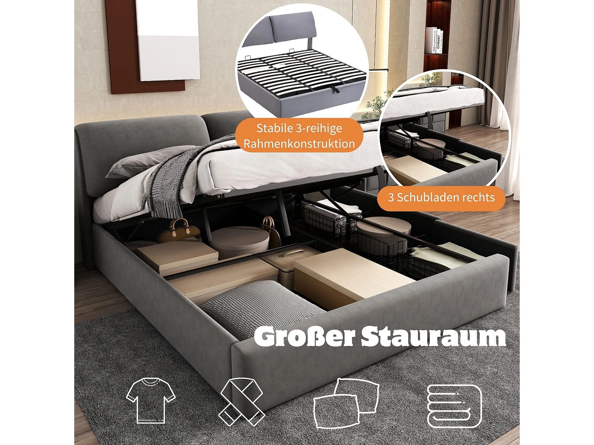 Lit coffre capitonné - 160 x 200 cm - avec sommier hydraulique + 3 tiroirs + tête de lit - velours - gris