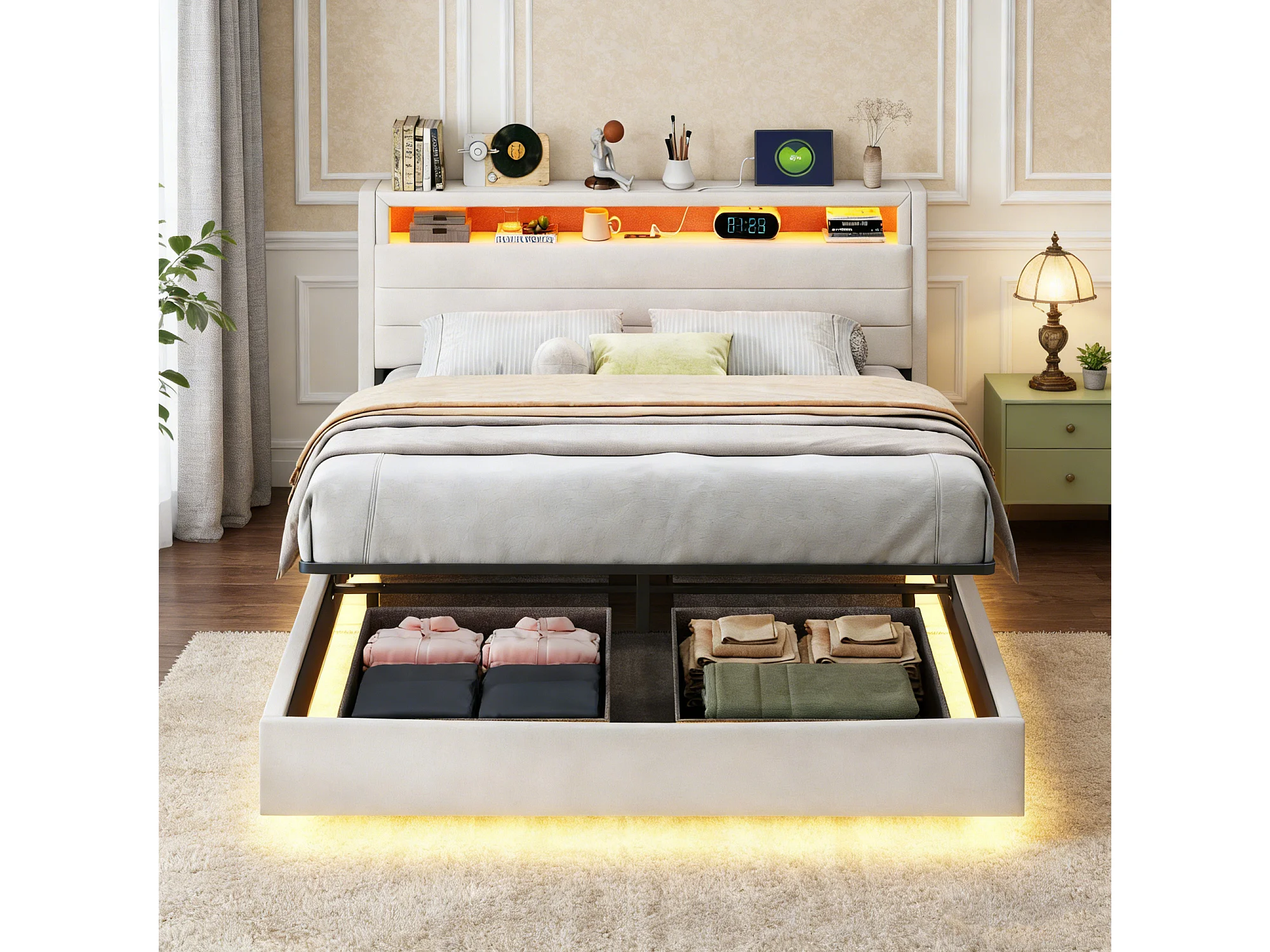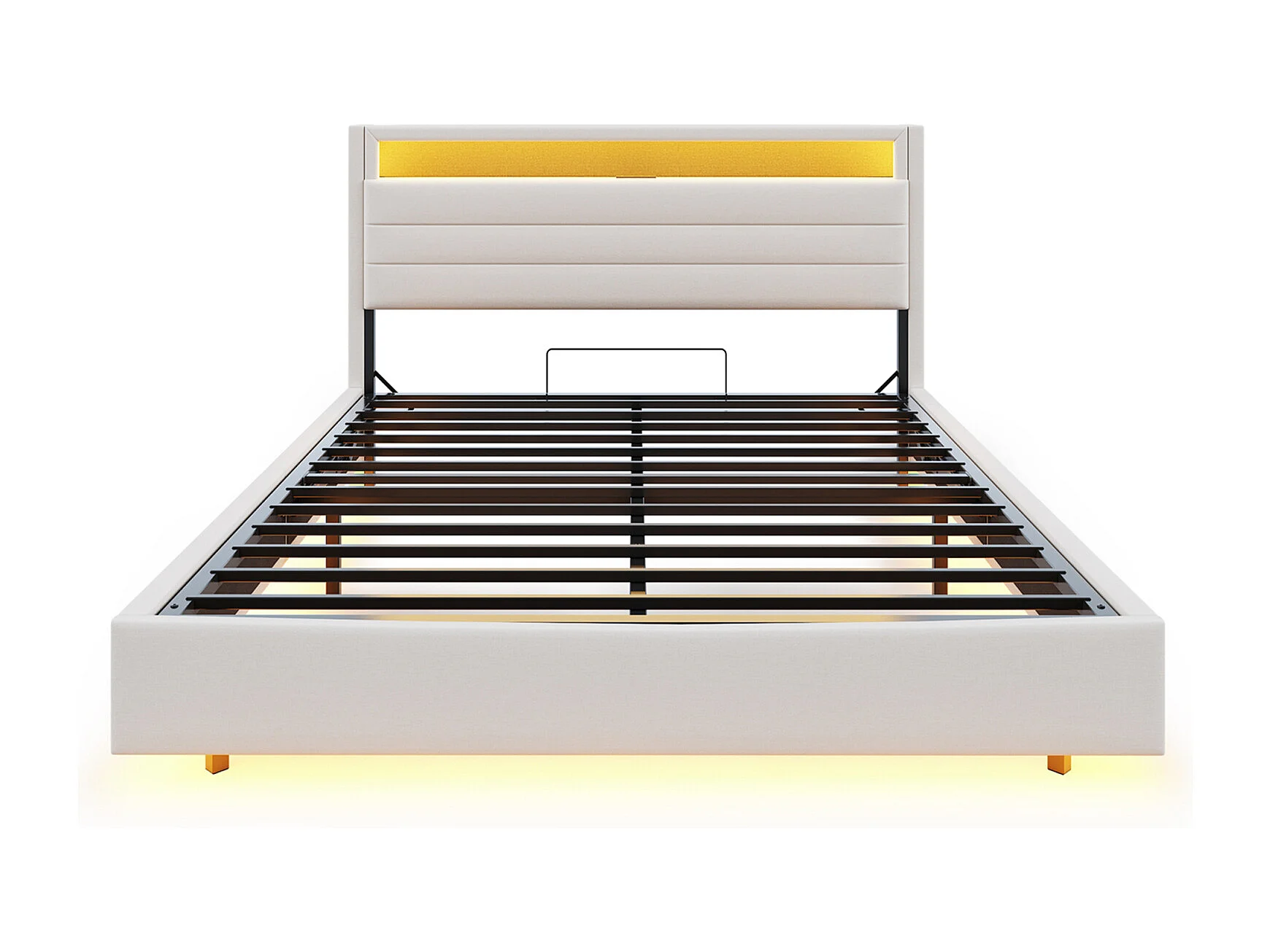 Lit coffre capitonné 160 x 200 cm, sommier à Lattes, rembourré tête de lit rangement, LED et USB, lit flottant 160x200 tissu lin, biege