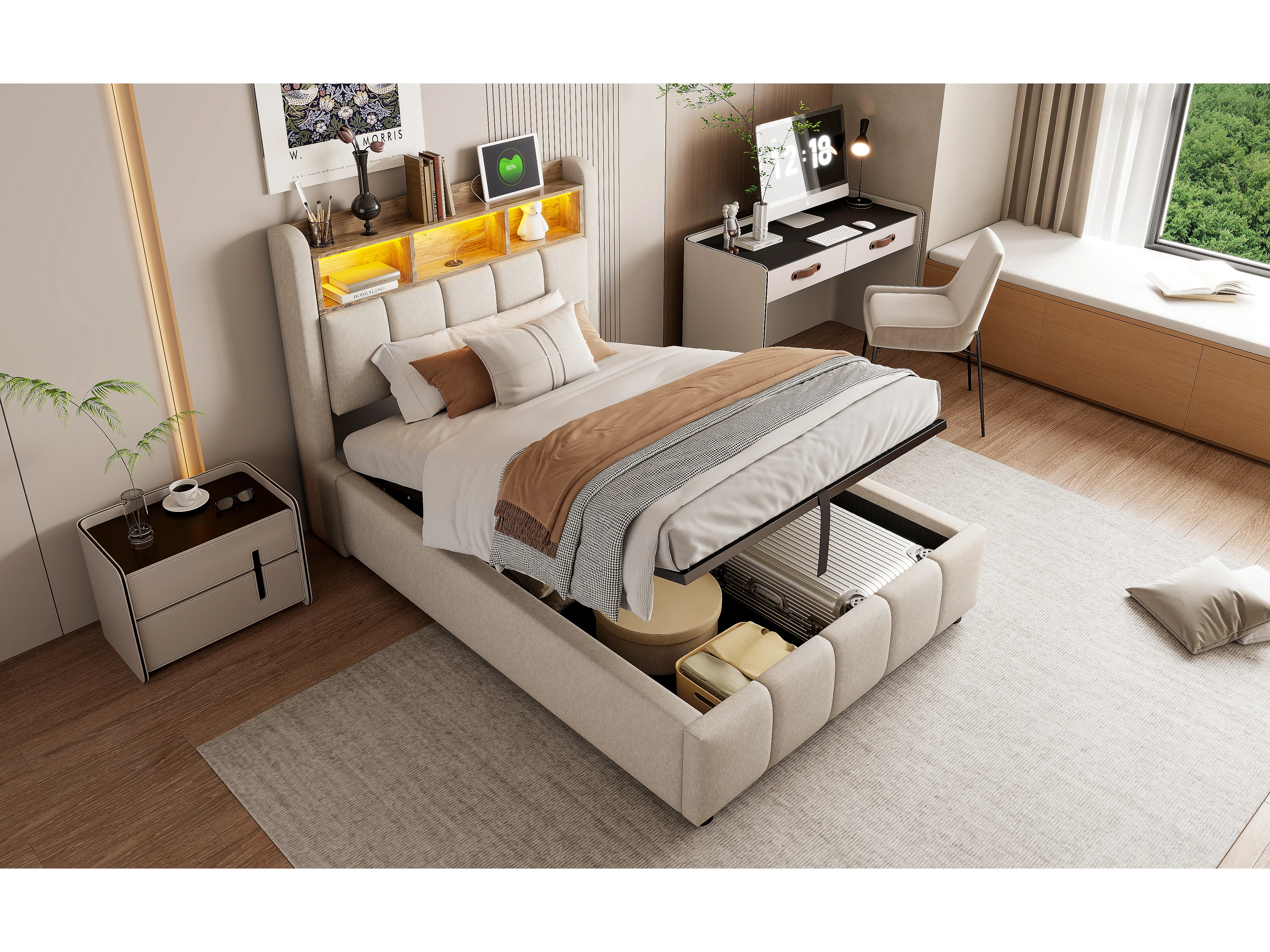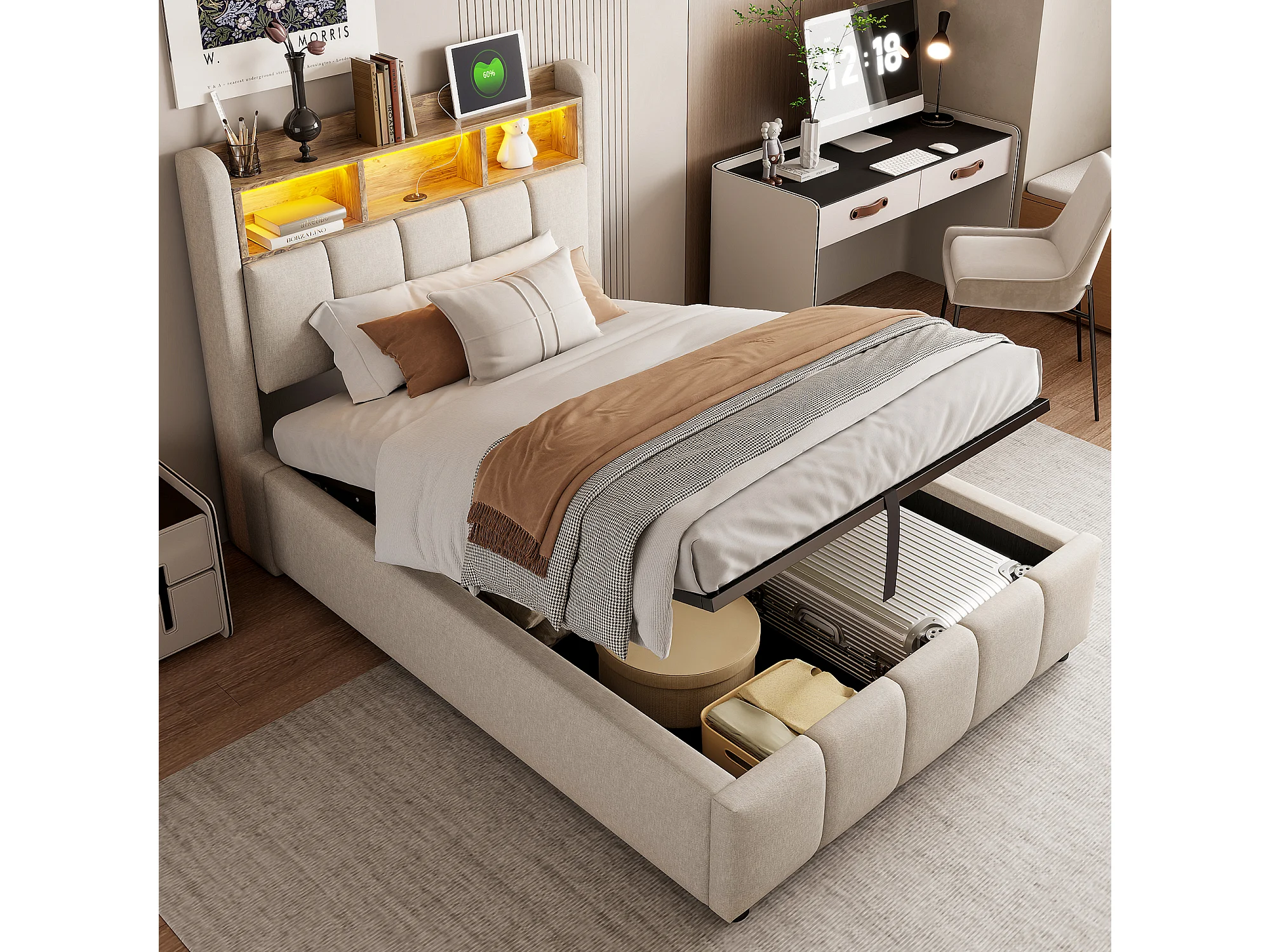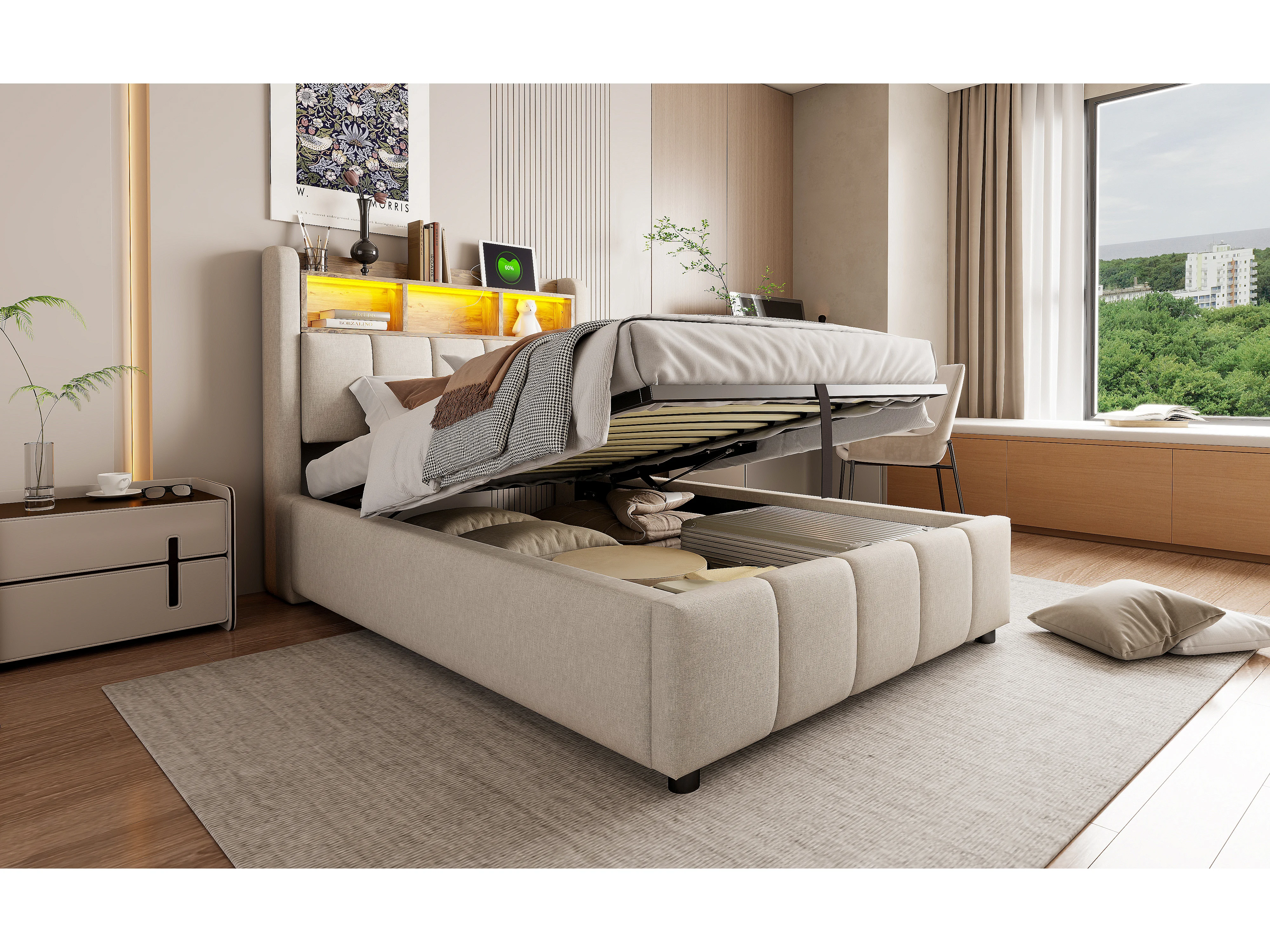 Lit coffre capitonné - 90 x 200 cm - avec Leds + port USB + tête de lit avec étagères de rangements - lin + métal + contreplaqué + MDF - beige