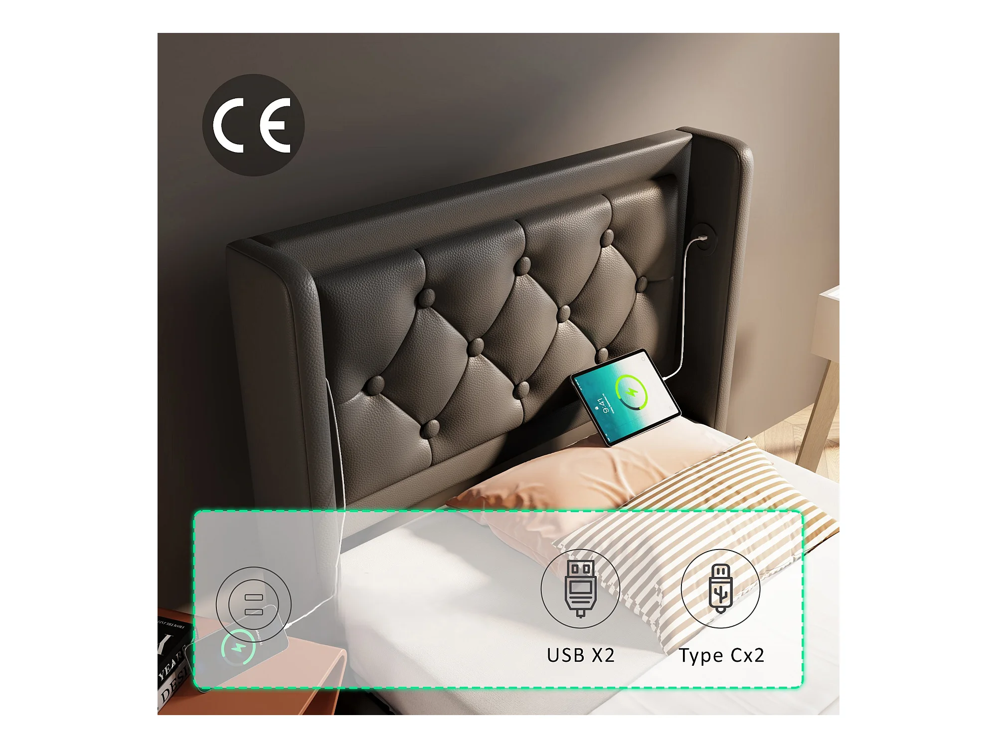 Lit coffre capitonné 90 x 200 cm en similicuir - avec fonction de recharge et LED au pied du lit - Noir