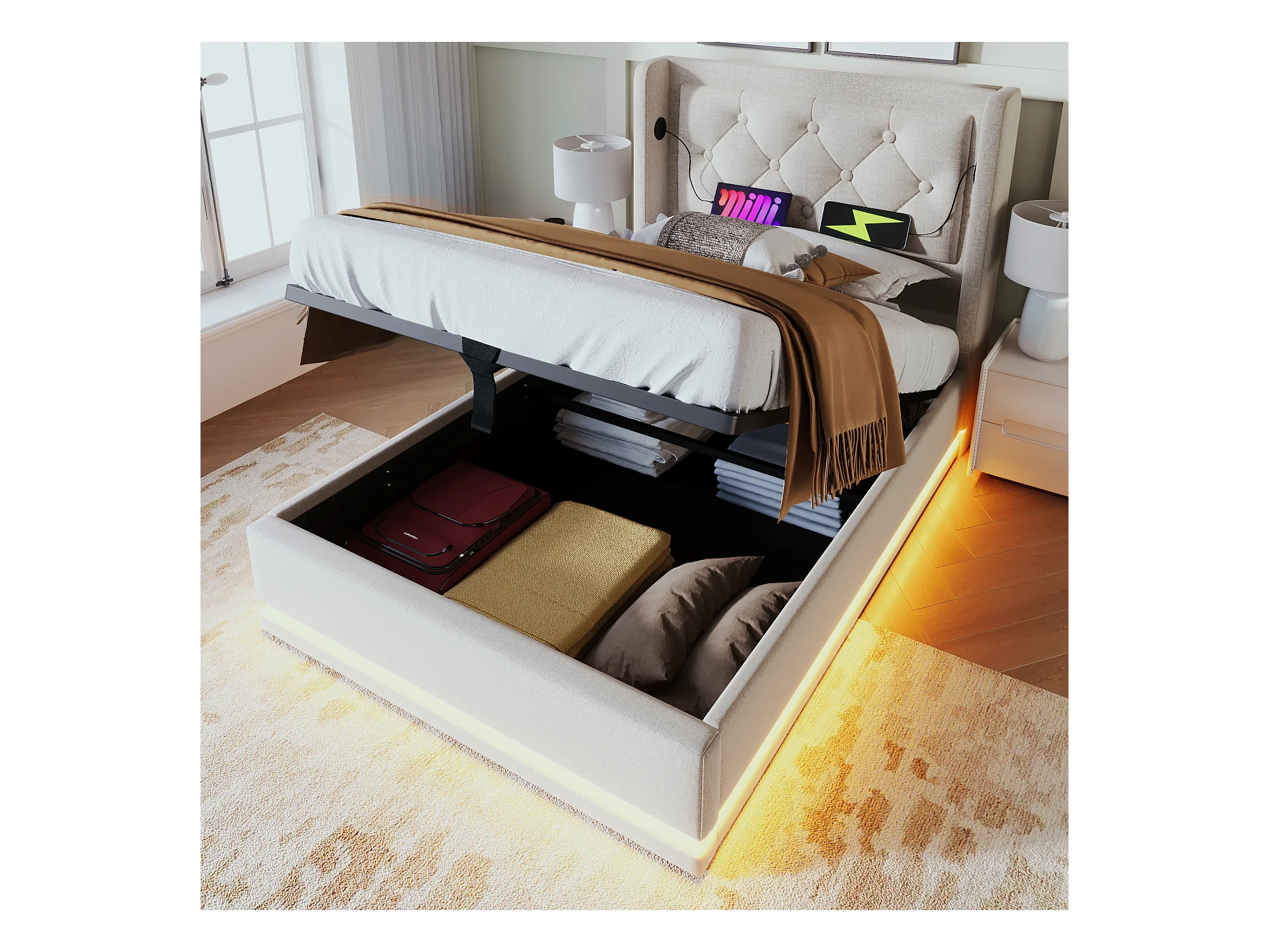 Lit coffre capitonné 90 x 200 cm en tissu coton - avec fonction de recharge et LED au pied du lit - Beige